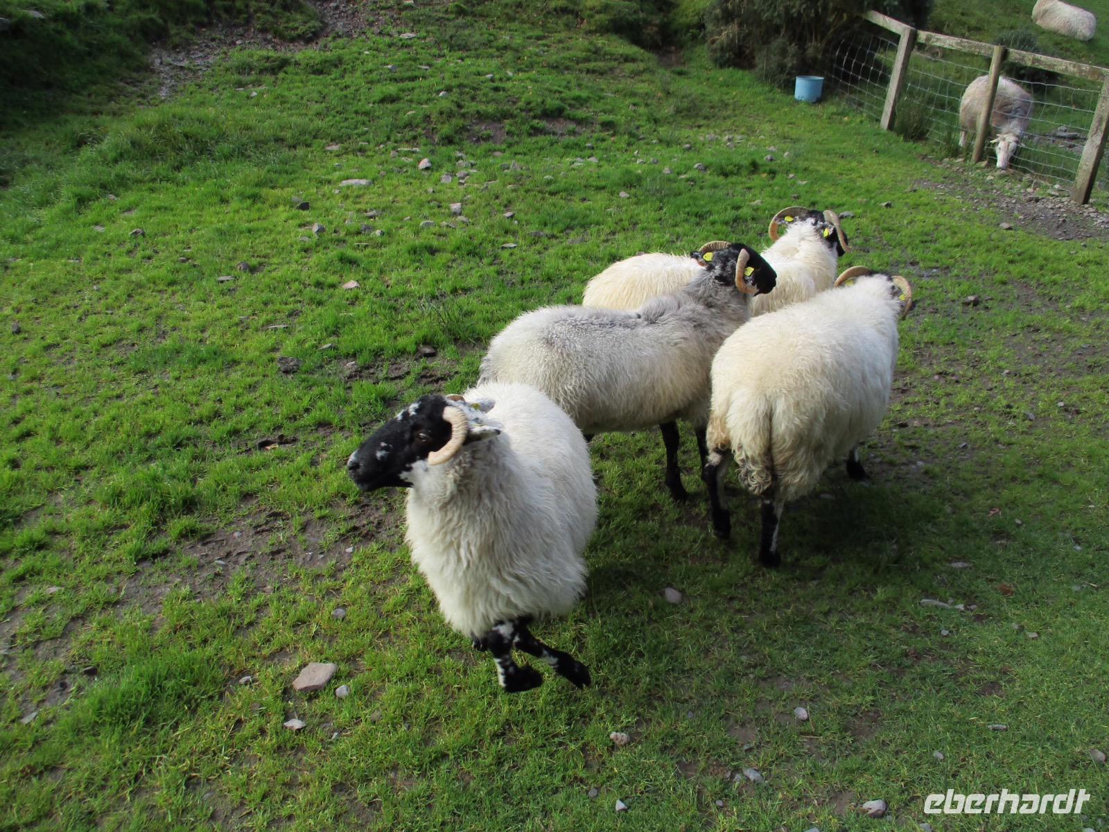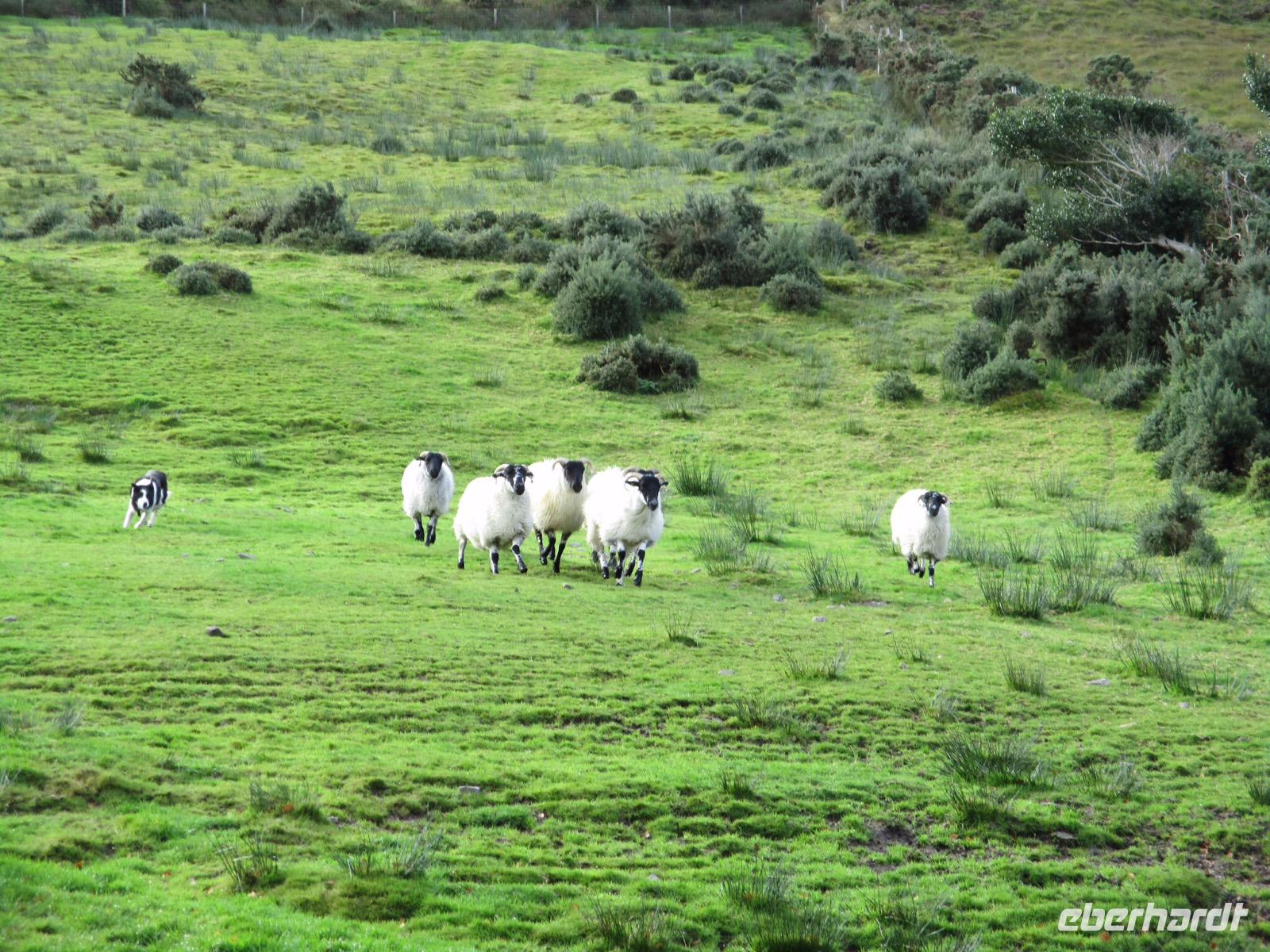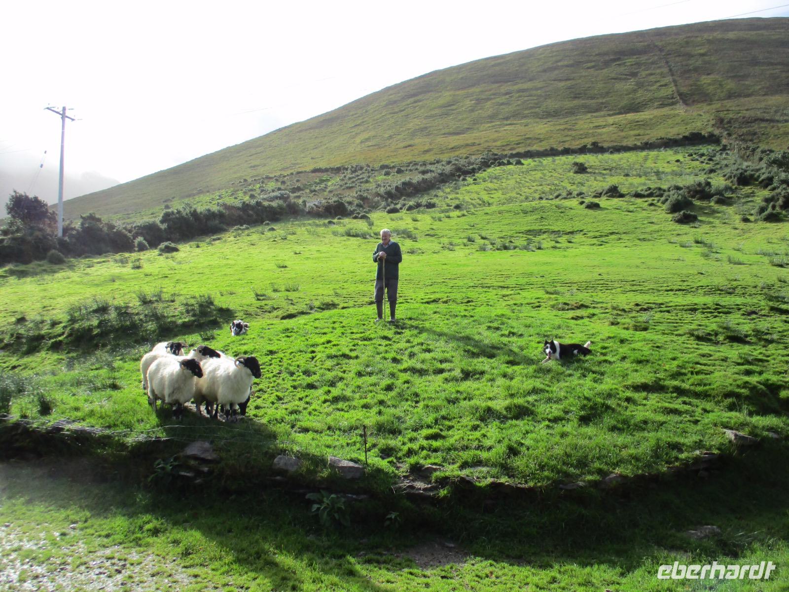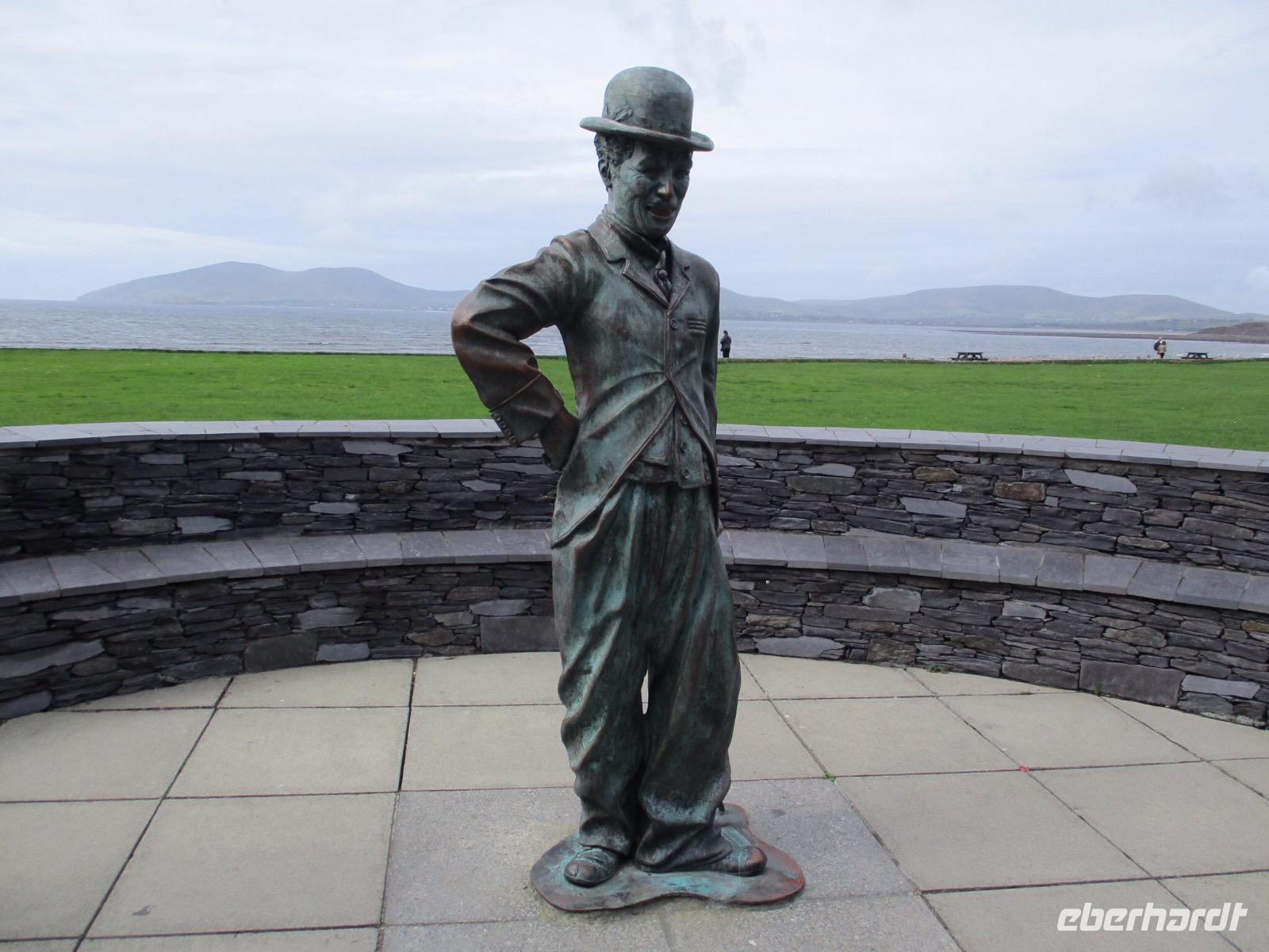 Heute stand der berühmte Ring of Kerry auf unserem Programm. Bei schönem Wetter konnten wir diese traumhafte Küstenstraße genießen. Mehrmals hielten wir an für Fotos von der atemberaubenden Landschaft. Von Gletschern geformte Berge lösen sich ab mit Tälern, Seen, malerischen Buchten und dem Blick auf den Atlantik. Unser erster Programmpunkt heute war der Besuch der Brendan Schaffarm. Bei einer Vorführung demonstrierte uns der Schäfer, wie ein Bordercollie eine Gruppe Schafe in die gewünschte Richtung treiben kann. Wir erfuhren viele interessante Details aus der Arbeit des Schäfers. Bei Cahersiveen verließen wir die Hauptstrasse und entdeckten bald ein altes Ringfort, das schon seit über eintausend Jahren dort steht. Es heißt Cahergal Ringfort und bot unseren Vorfahren Schutz vor Angreifern. Wenige Kilometer später statteten wir dem berühmten Charlie Chaplin einen Besuch ab. In Waterville steht seine Statue, mit der wir uns gern fotografieren ließen. Er ist hier in guter Erinnerung, oft verbrachte er in Waterville erholsame Tage.