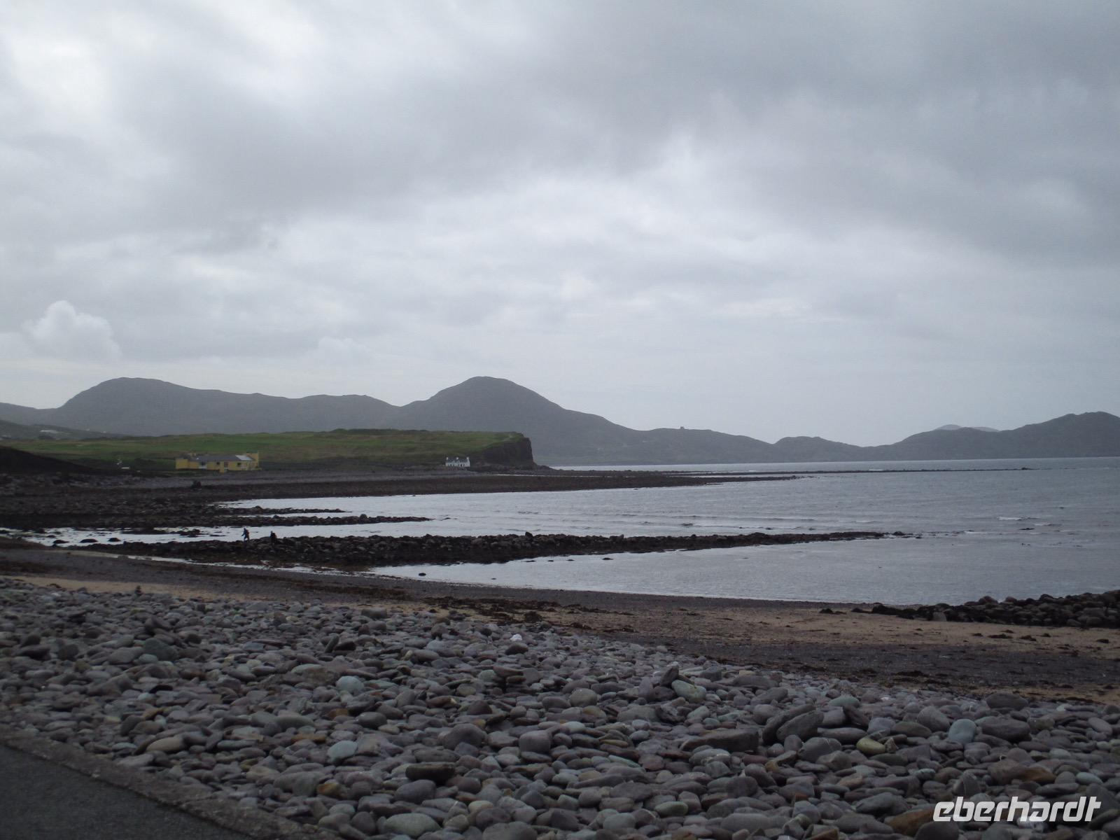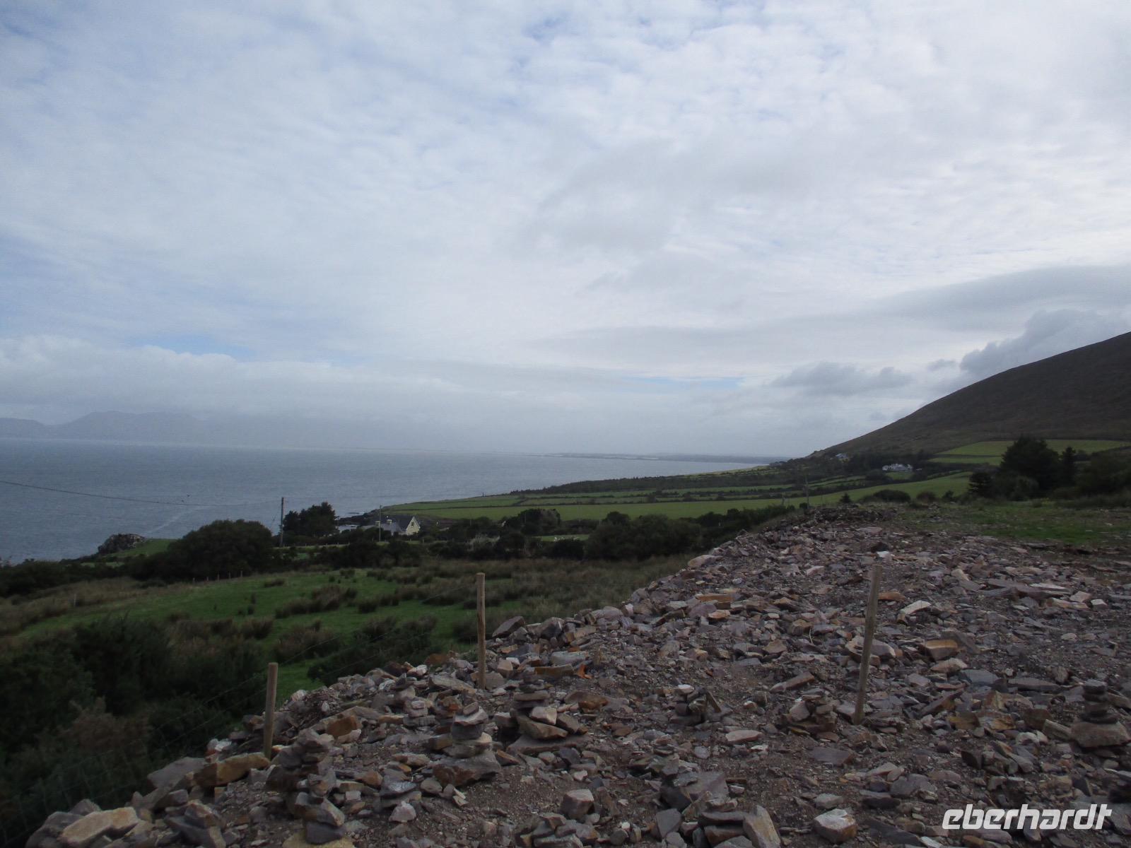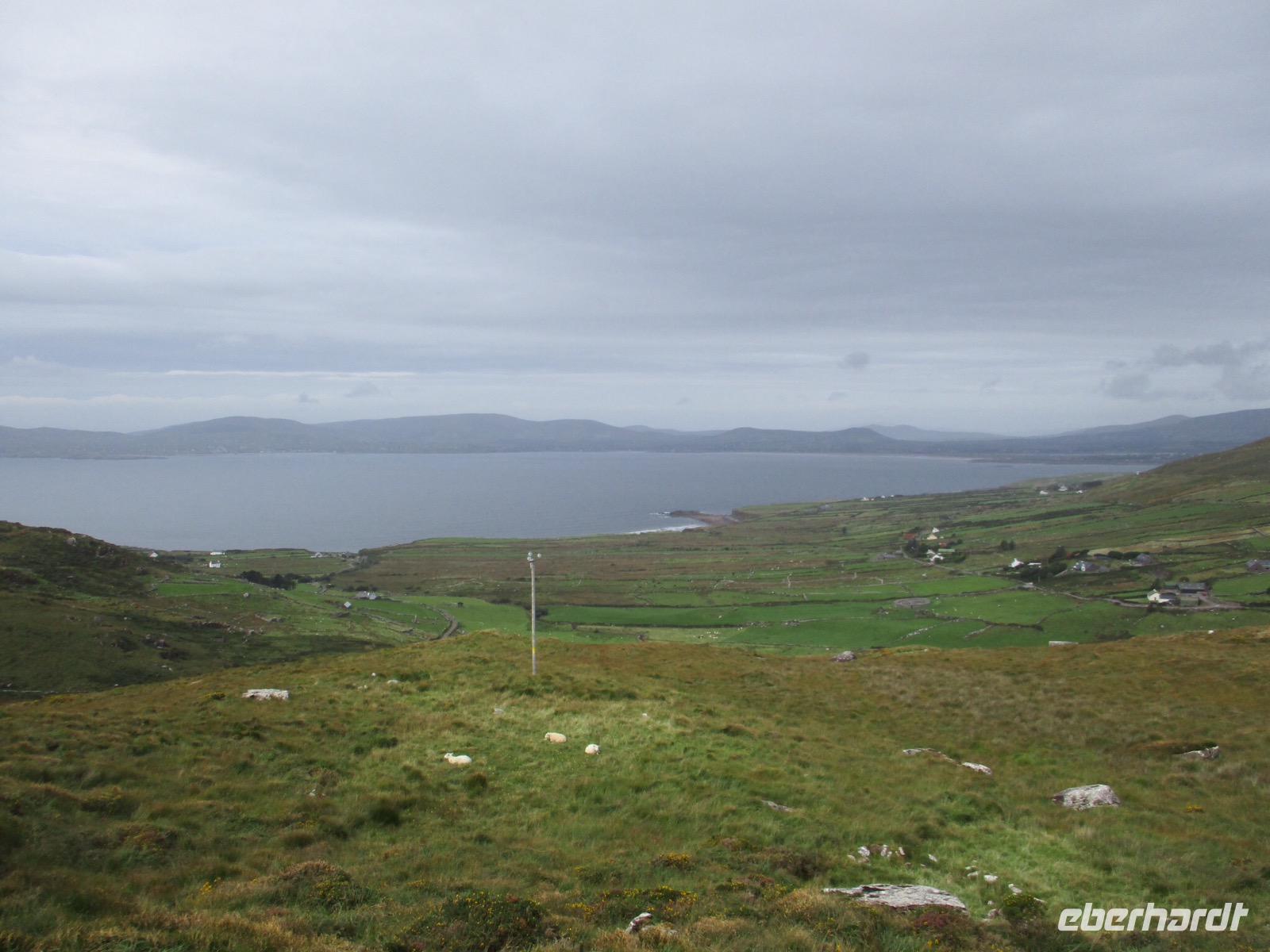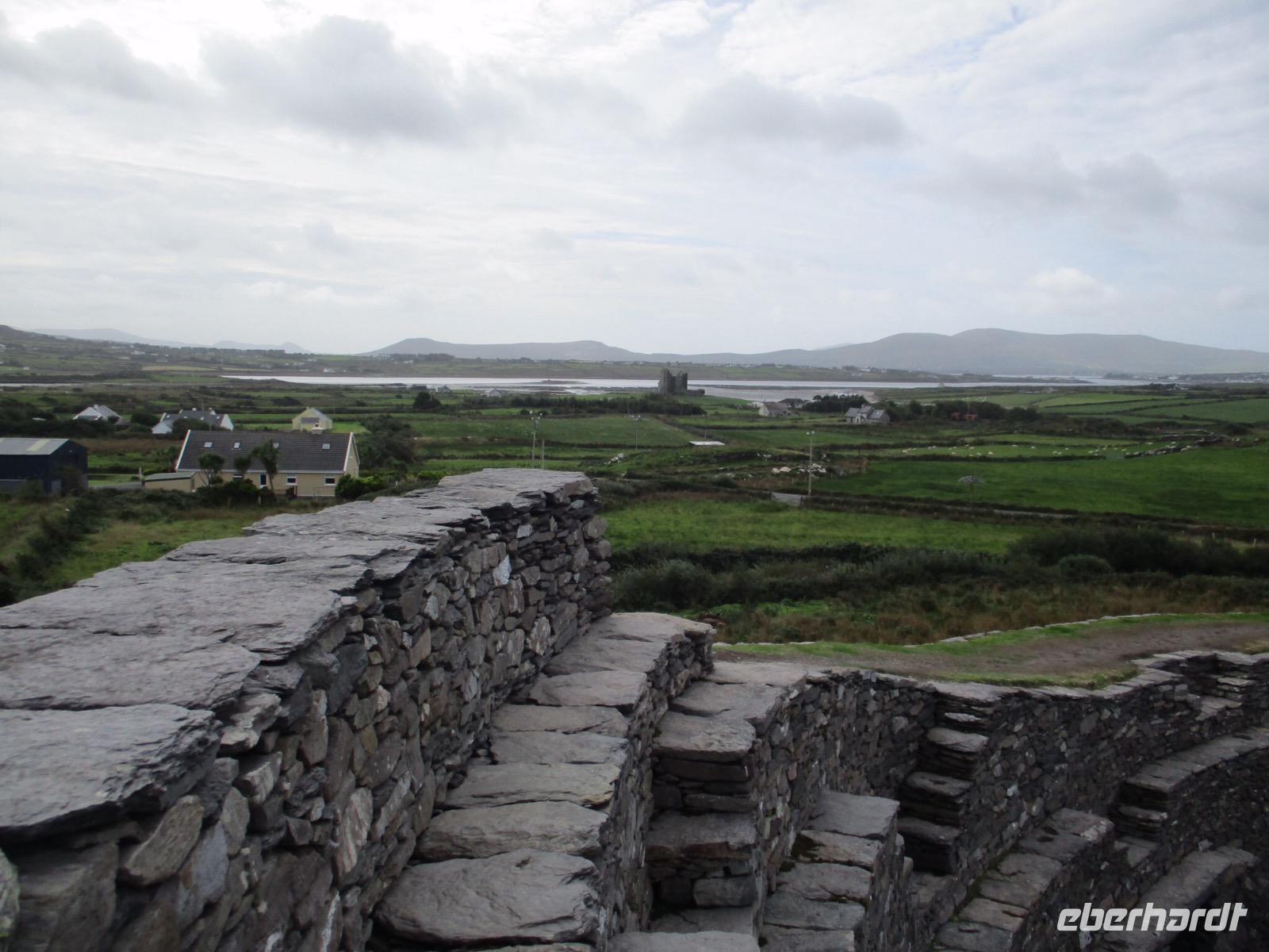 Heute stand der berühmte Ring of Kerry auf unserem Programm. Bei schönem Wetter konnten wir diese traumhafte Küstenstraße genießen. Mehrmals hielten wir an für Fotos von der atemberaubenden Landschaft. Von Gletschern geformte Berge lösen sich ab mit Tälern, Seen, malerischen Buchten und dem Blick auf den Atlantik. Unser erster Programmpunkt heute war der Besuch der Brendan Schaffarm. Bei einer Vorführung demonstrierte uns der Schäfer, wie ein Bordercollie eine Gruppe Schafe in die gewünschte Richtung treiben kann. Wir erfuhren viele interessante Details aus der Arbeit des Schäfers. Bei Cahersiveen verließen wir die Hauptstrasse und entdeckten bald ein altes Ringfort, das schon seit über eintausend Jahren dort steht. Es heißt Cahergal Ringfort und bot unseren Vorfahren Schutz vor Angreifern. Wenige Kilometer später statteten wir dem berühmten Charlie Chaplin einen Besuch ab. In Waterville steht seine Statue, mit der wir uns gern fotografieren ließen. Er ist hier in guter Erinnerung, oft verbrachte er in Waterville erholsame Tage.
