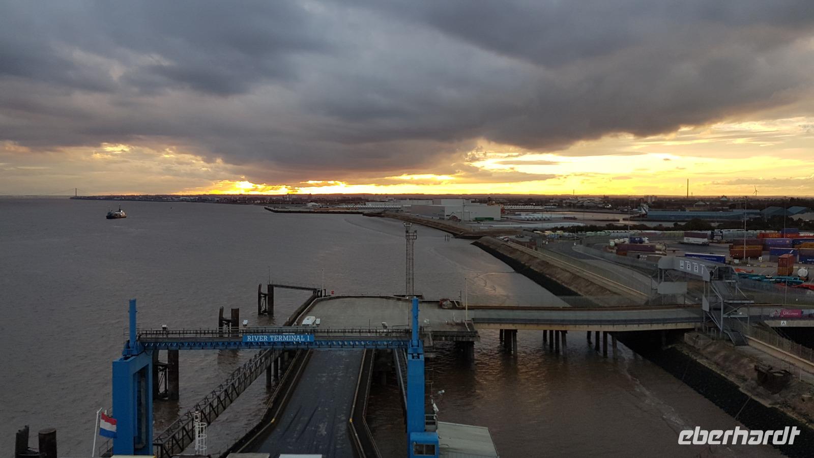Am frühen Abend erreichten wir das Fährterminal von P&O, wir erledigten unseren Checkin und gingen alsbald auf die Fähre. Im Buffetrestaurant The Kitchen aßen wir Abendessen und genossen danach die Annehmlichkeiten eines solchen Schiffes wir Bars, Showvorführungen, Sonnendeck und anderes.