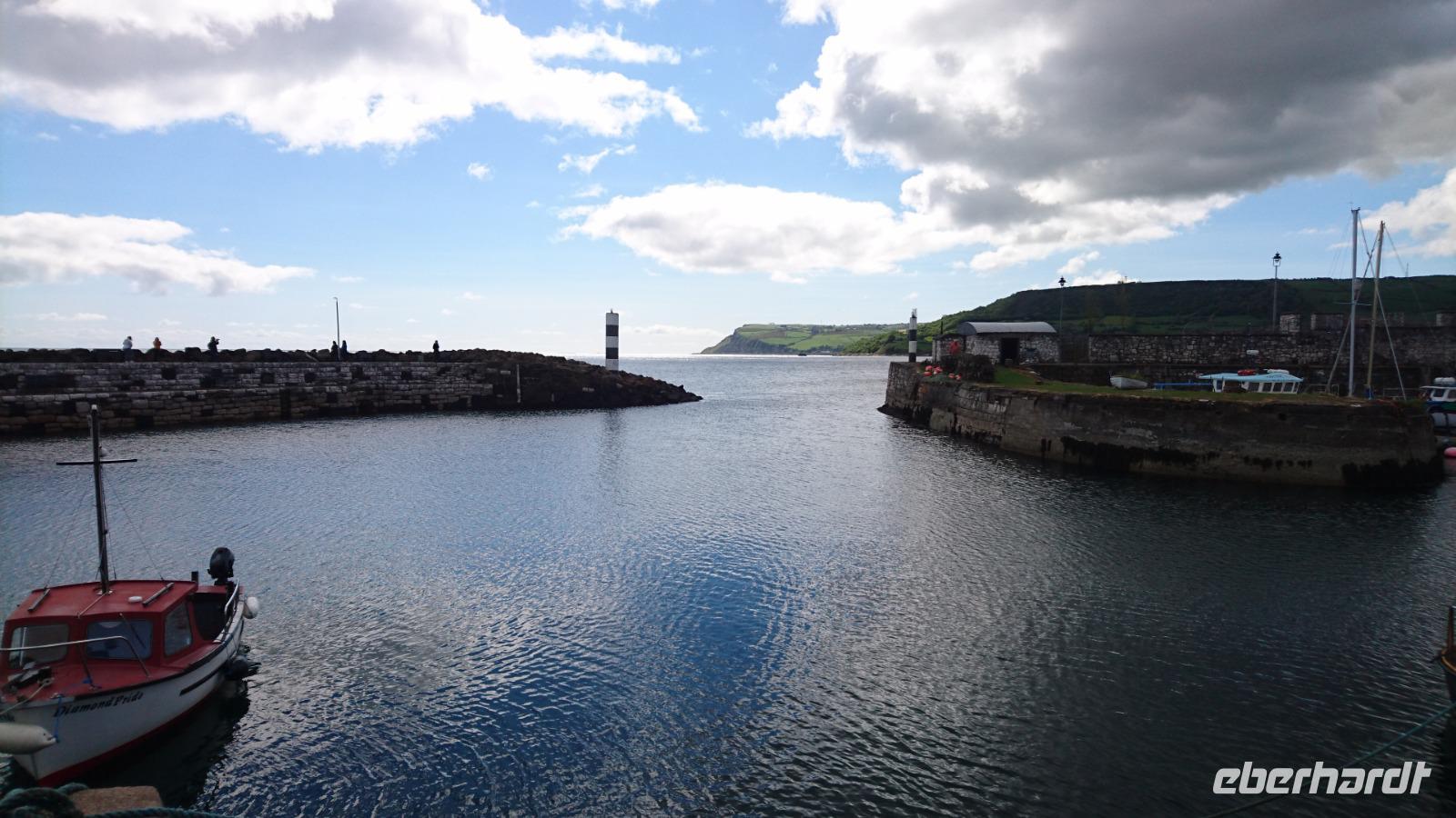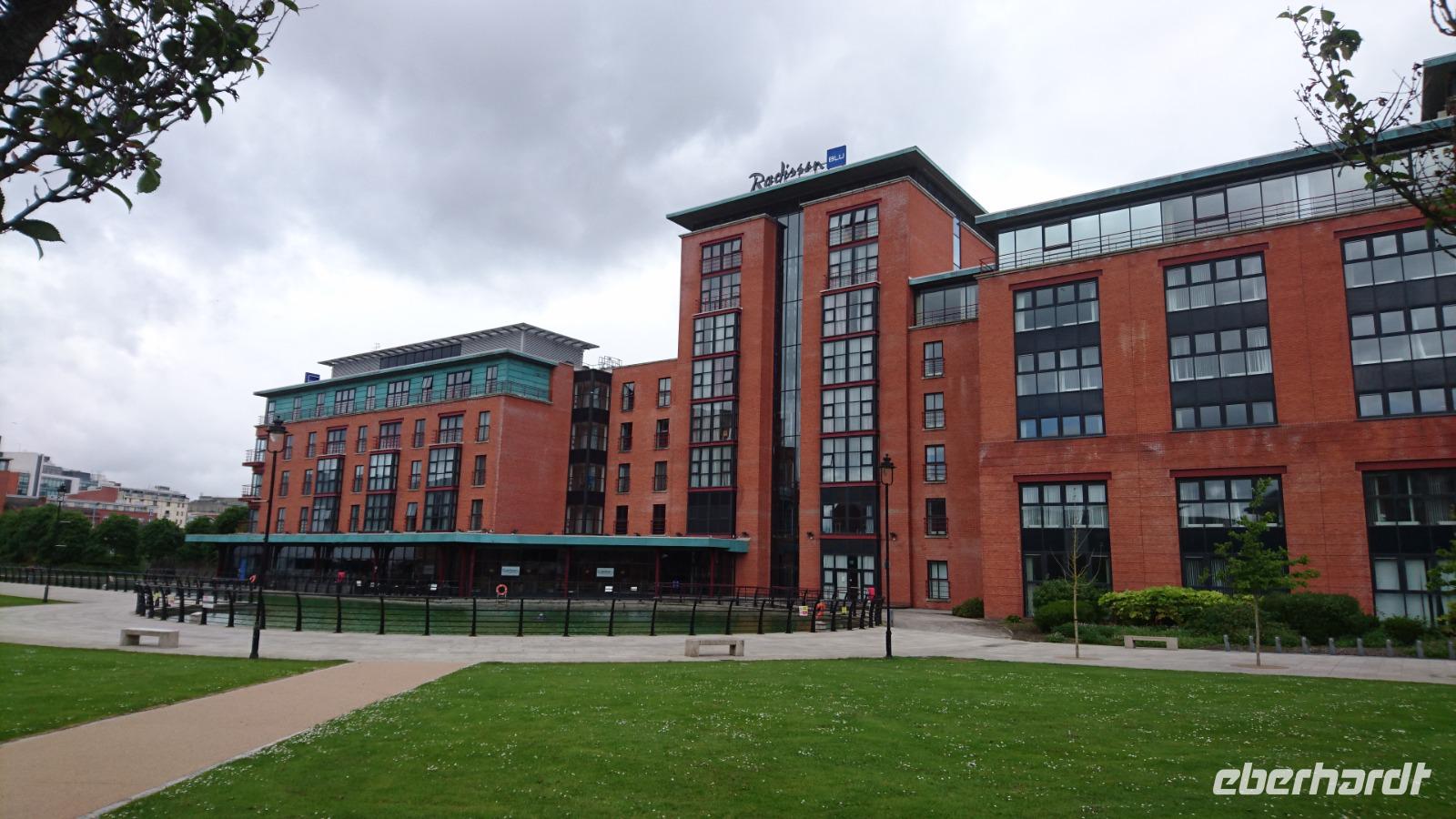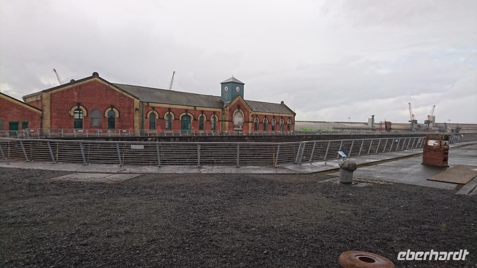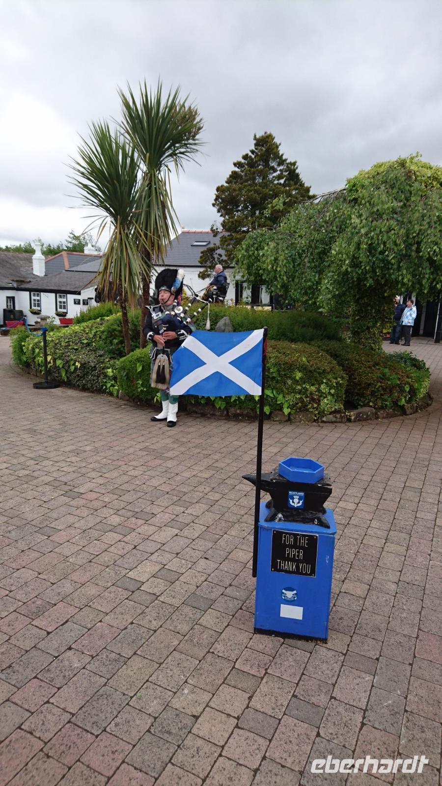 Der Lautsprecher an Bord weckte uns, wie Stefan es uns bereits am Abend vorher ankündigte. Uns blieb genügend Zeit für Dusche, Frühstück und Einpacken unserer wenigen Dinge im Fährgepäck, das wir extra dafür schon zuhause packten, um nicht mit den großen Koffern durch die schmalen Gänge in die kleinen Kabinen an Bord gehen zu müssen. Wir brauchten ja nicht viel in dieser ersten Reisenacht, sodass unsere Koffer gemütlich im Bus schlummern konnten. Dan ging es von Bord und nachdem wir die britischen Einreisemodalitäten erledigten, erwartete uns Peter mit unserem Bus bereits vor dem Terminal. Schnell verteilten er und Stefan noch einige Getränke, dann erklang schon die britisch-englische Nationalhymne und wir sahen die britische und die englische Fahne, die Stefan schwenkte und uns gleich in ihrer Zusammensetzung erläuterte. Wir waren jetzt also in Großbritannien, genauer gesagt in England. Doch das sollte sich im Laufe des Vormittags noch ändern. Erst einmal ging es entlang des Hadrianswalles auf englischer Seite in Richtung Carlisle, dort dann gen Norden nach Schottland hinein, wo wir wieder Fahne und Hymne zur Begrüßung geboten bekamen, ehe wir unsere Mittagspause in Gretna Green, direkt bei der Hochzeitsschmiede einnahmen und gleich noch einen Dudelsackspieler und die Geschichte des Ortes und der Schmiede an der englisch-schottischen Grenze erfuhren, ehe wir wieder weiter fuhren. Wir sahen bereits, dass Peter und Stefan etwas besorgt waren, doch alles ging gut, auf die Minute genau erreichten wir den nächsten Fährhafen, denn wir mussten heute noch einmal übers Wasser, von der Insel Großbritannien nach Irland. Die Fähe legte bald ab und wir fuhren unserer Urlaubsinsel entgegen, erreichten sie am zeitigen Abend und fuhren unter den Klängen der inoffiziellen nordirischen Hymne und unser dem Schwenken der nordirischen Fahne von Bord, dann durch Belfast und als wir dann schließlich am richtigen Hotel, einem Radisson Blue gleich am River Lagan unweit der Innenstadt, ankamen, begrüßten wir auch gleich unsere Fluggäste, die erst am Morgen in Deutschland starteten und schon hier waren, auf uns warteten und wenig später im schönen Restaurant mit uns das Abendessen einnahmen. Auch heute waren wir müde, hatten viel gesehen und erlebt und ruhten uns kurz darauf für Kommendes aus.