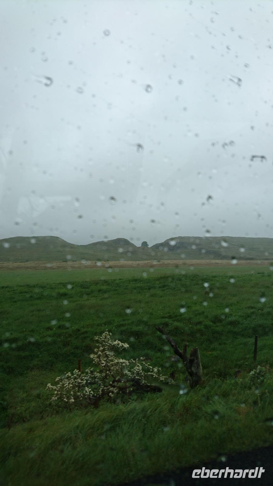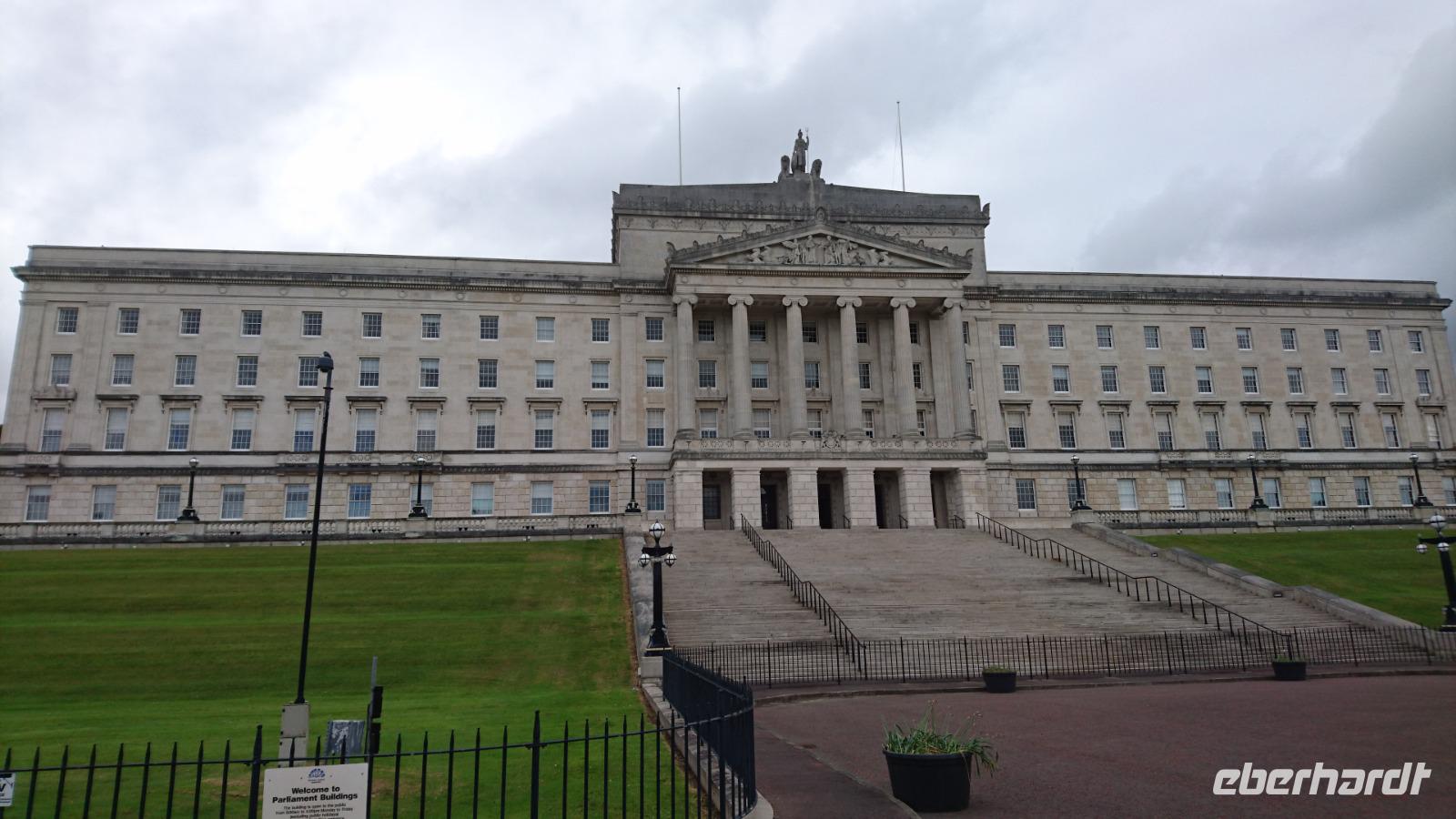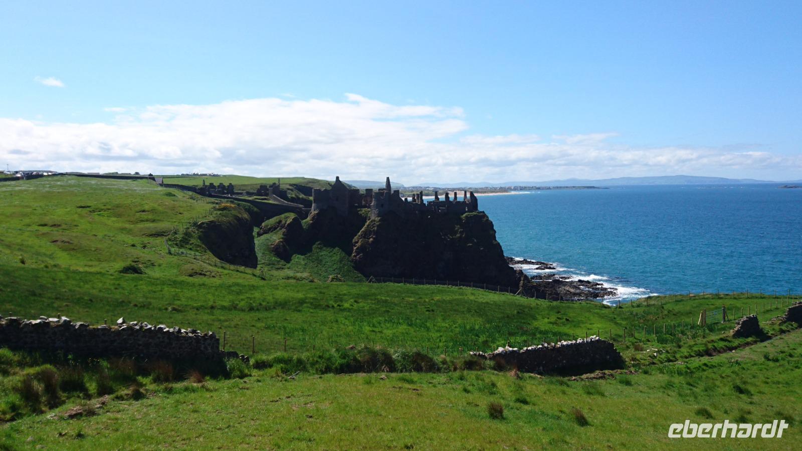Der Lautsprecher an Bord weckte uns, wie Stefan es uns bereits am Abend vorher ankündigte. Uns blieb genügend Zeit für Dusche, Frühstück und Einpacken unserer wenigen Dinge im Fährgepäck, das wir extra dafür schon zuhause packten, um nicht mit den großen Koffern durch die schmalen Gänge in die kleinen Kabinen an Bord gehen zu müssen. Wir brauchten ja nicht viel in dieser ersten Reisenacht, sodass unsere Koffer gemütlich im Bus schlummern konnten. Dan ging es von Bord und nachdem wir die britischen Einreisemodalitäten erledigten, erwartete uns Peter mit unserem Bus bereits vor dem Terminal. Schnell verteilten er und Stefan noch einige Getränke, dann erklang schon die britisch-englische Nationalhymne und wir sahen die britische und die englische Fahne, die Stefan schwenkte und uns gleich in ihrer Zusammensetzung erläuterte. Wir waren jetzt also in Großbritannien, genauer gesagt in England. Doch das sollte sich im Laufe des Vormittags noch ändern. Erst einmal ging es entlang des Hadrianswalles auf englischer Seite in Richtung Carlisle, dort dann gen Norden nach Schottland hinein, wo wir wieder Fahne und Hymne zur Begrüßung geboten bekamen, ehe wir unsere Mittagspause in Gretna Green, direkt bei der Hochzeitsschmiede einnahmen und gleich noch einen Dudelsackspieler und die Geschichte des Ortes und der Schmiede an der englisch-schottischen Grenze erfuhren, ehe wir wieder weiter fuhren. Wir sahen bereits, dass Peter und Stefan etwas besorgt waren, doch alles ging gut, auf die Minute genau erreichten wir den nächsten Fährhafen, denn wir mussten heute noch einmal übers Wasser, von der Insel Großbritannien nach Irland. Die Fähe legte bald ab und wir fuhren unserer Urlaubsinsel entgegen, erreichten sie am zeitigen Abend und fuhren unter den Klängen der inoffiziellen nordirischen Hymne und unser dem Schwenken der nordirischen Fahne von Bord, dann durch Belfast und als wir dann schließlich am richtigen Hotel, einem Radisson Blue gleich am River Lagan unweit der Innenstadt, ankamen, begrüßten wir auch gleich unsere Fluggäste, die erst am Morgen in Deutschland starteten und schon hier waren, auf uns warteten und wenig später im schönen Restaurant mit uns das Abendessen einnahmen. Auch heute waren wir müde, hatten viel gesehen und erlebt und ruhten uns kurz darauf für Kommendes aus.