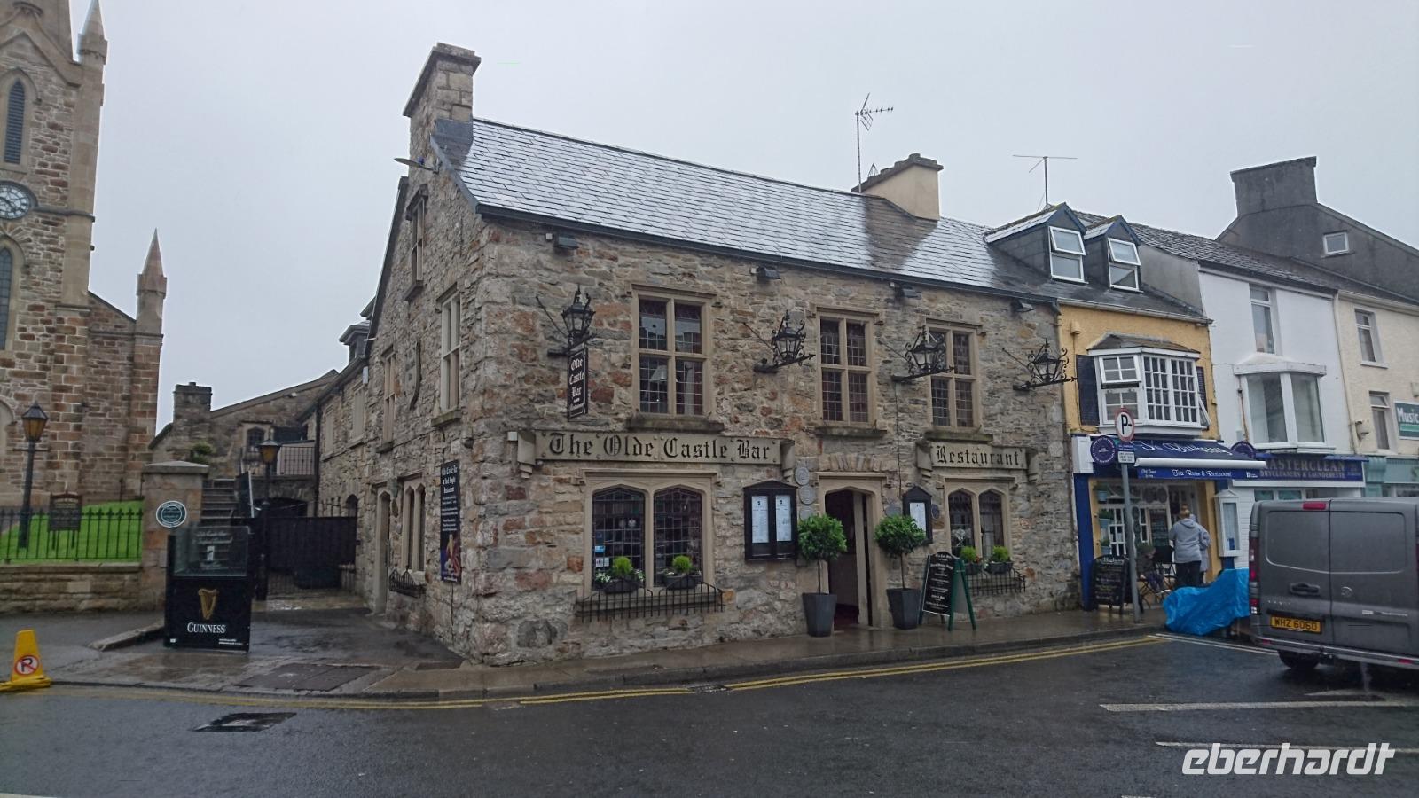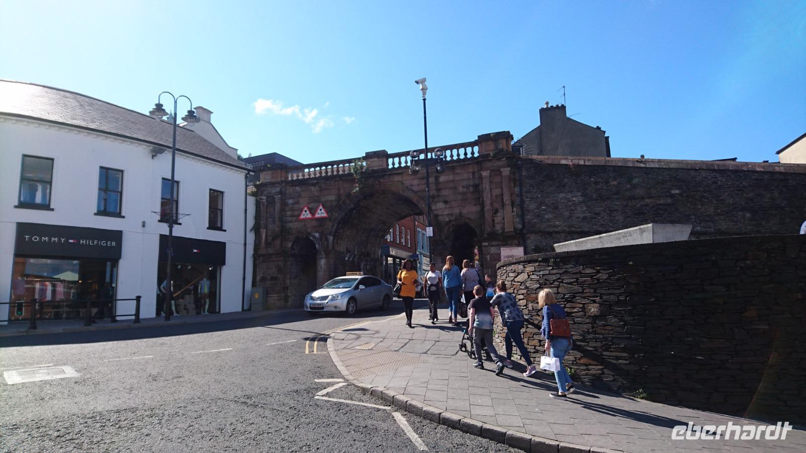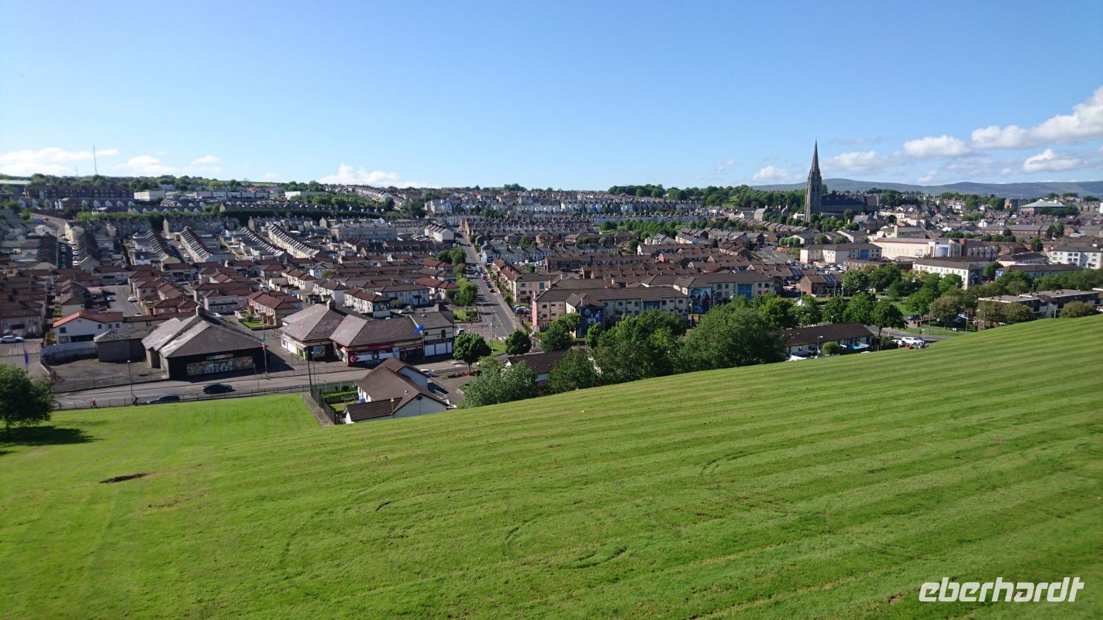 Stefan meinte am Morgen, als wir nach dem Frühstück mit unseren Koffern am Bus standen, dass wir nun eine große irische Stadt kannten, nun aber Naturschönheiten der Insel sehen sollten. So waren wir begeistert, als wir die Antrim-Coast und die Causeway-Route entlang gen Norden fuhren, erst in Carrickfergus am Schloss für Fotos stoppten, dann in Cairnalough einen der Drehorte von Game of Thrones sahen und schließlich, vorbei an Mull of Kintyre in Schottland und der Rathlin-Insel, Giants Causeway erreichten. Stefan reichte nicht nur die Ausflugsliste herum, in der wir uns eintragen konnten, wenn wir am kommenden Tag den Glenveagh-Nationalpark und an einem der späteren Tage eine irische Stepp-Show in Tralee besuchen wollten, sondern erzählte uns auch die mystische Geschichte von der Erschaffung und Zerstörung des Dammes der Riesen, wie Giants Causeway ja auch genannt wird. Hier am Atlantik hatten wir Zeit, um die Natur, den Basalt und die Felsen auf uns wirken zu lassen, probierten Irish Stew im Besucherzentrum und fuhren später weiter nach Westen, stoppten an der Ruine des schottisch-irischen Schlosses Dunluce Castle und erreichten schließlich Derry... oder besser Londonderry? Na ja, man ist sich nicht wirklich einig. Die Royalisten wählen den langen Namen, die Republikaner den kurzen und so weiß nicht einmal die Behörde, wie man die Stadt nennen soll. So bezeichnen viele sie als ‚Die Stadt mit dem Schrägstrich', eben Derry/Londonderry. Stefan lud uns ein zu einem Spaziergang auf der völlig erhaltenen Stadtmauer. Hier sahen wir, ähnlich wie in Belfast und doch noch viel ergreifender, die absolute Trennung der Stadt. Tore auf den Mauern waren in den Angeln gut geölt, die Mauerseite zur Bogside, der Seite der Republikaner in Derry, war durch Netze und Geflechte hoch versperrt und irgendwie hatte man das Gefühl, mitten in einem riesigen und nicht wirklich nachvollziehbaren Schlamassel zu sitzen, obwohl wir liefen und bald wieder aus Derry abfuhren, um Nordirland heute und für unsere Tour zu verlassen. Unser Weg führte uns entlang des River Foyle zur nordirisch-irischen Grenze, die man kaum wahrnahm. Wie meinte Stefan? Die Straßenschilder sind in Irland nun in Gälisch und englisch beschriftet, die Geschwindigkeiten und Entfernungen metrisch dargestellt und an den Straßenrändern sehen wir gelbe anstatt weißer Linien. Ansonsten ist alles gleich. So erreichten wir bald die irische Stadt Letterkenny und bezogen bald darauf unser Hotel, das Station House am alten Bahnhof, und ließen uns das Abendessen schmecken, ehe wir die vielen heutigen Erlebnisse beim Ausruhen für kommende Tage verarbeiteten.