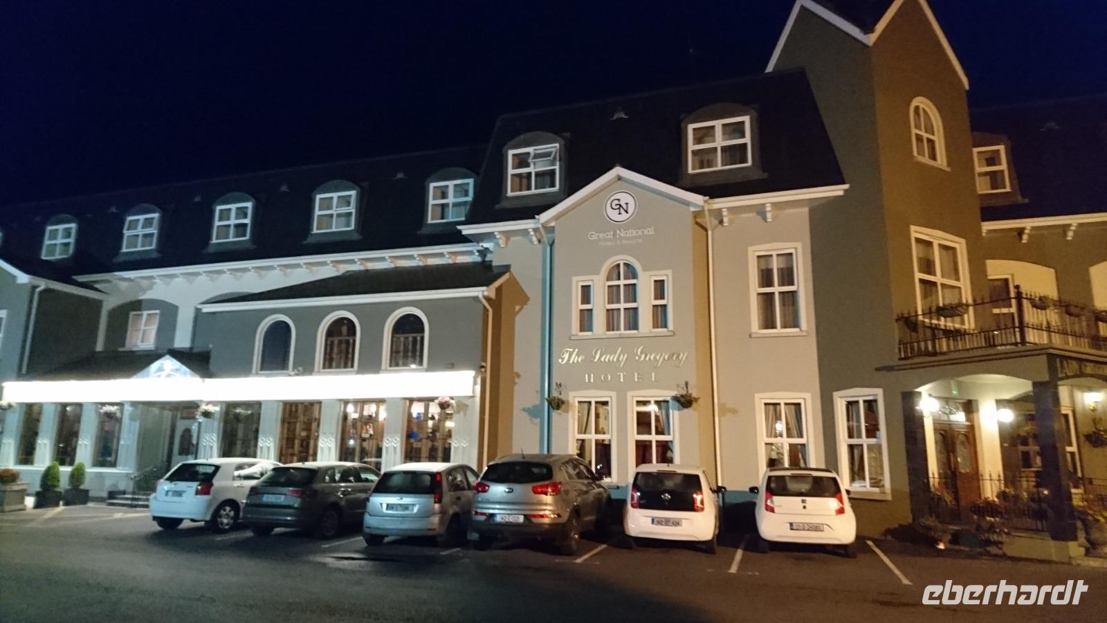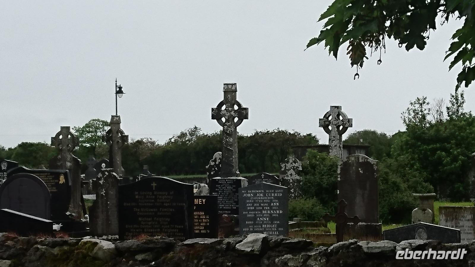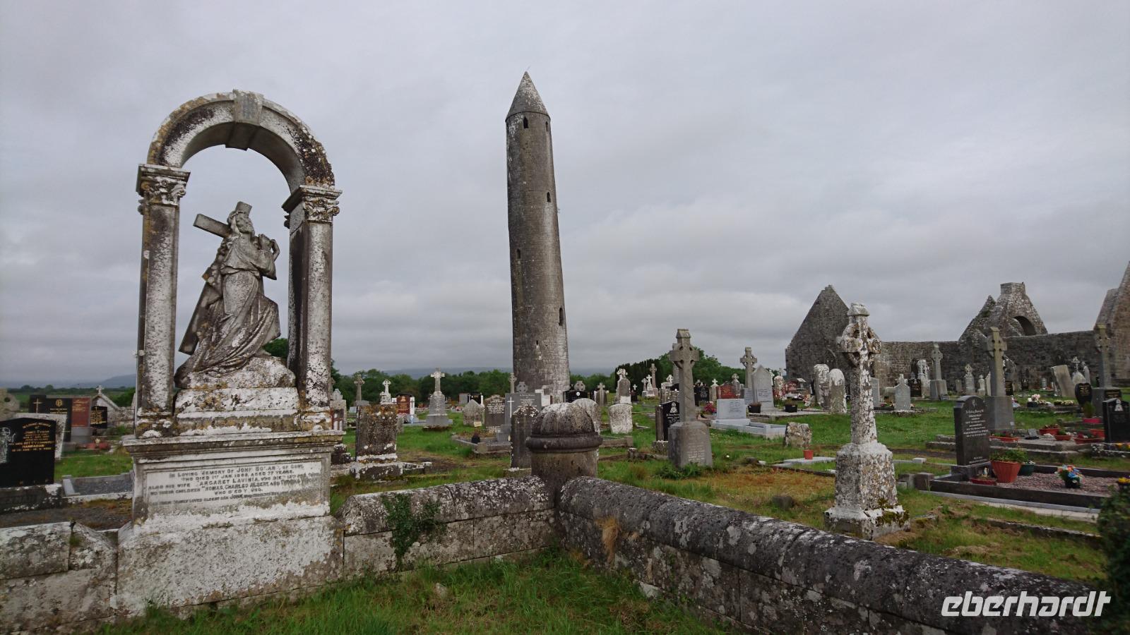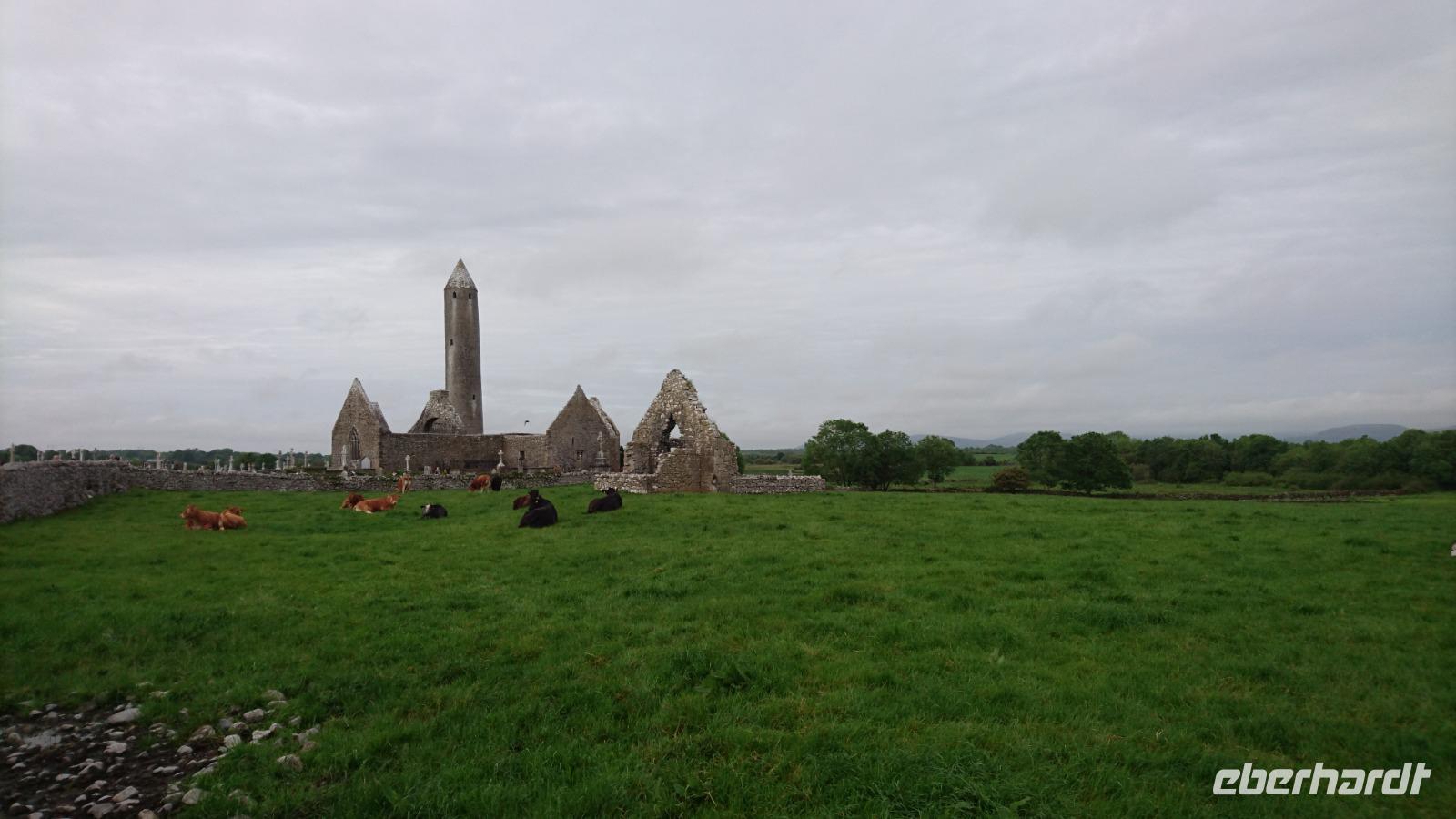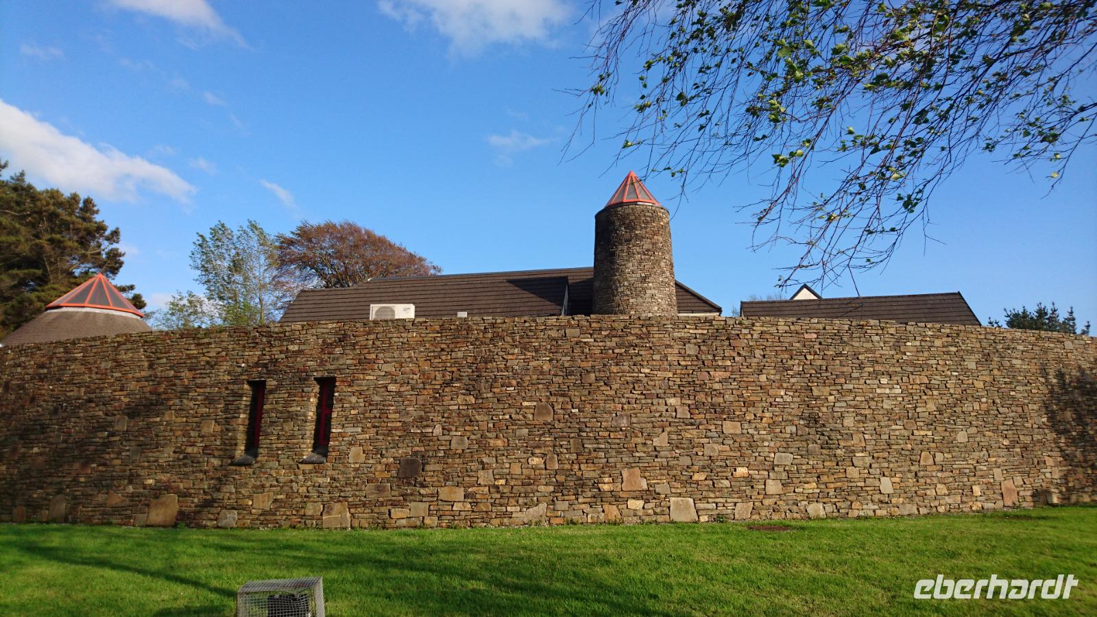 Wieder hieß es: Koffer packen. Peter lud all unser Gepäck mit einer Ruhe und genauer Planung ins Busfach und wir staunten über seine tetrisartige Arbeit, ehe er und Stefan wieder die Morgengetränke im Bus verteilten und sich unser Fahrzeug gen Süden in Bewegung setzte. Längst hatten wir die Antrimküste verlassen und befanden uns nun auf dem Wild Atlantic Way, der uns nun noch einige Tage auf unserer weiteren Tour begleiten und führen sollte. Erst einmal ging es aus Letterkenny hinaus gen Süden, noch einmal an Donegal vorbei und schließlich verließen wir an einer sehr schmalen Stelle die Hauptstraße und fuhren hinein ins ursprüngliche Irland. Bald schon tauchte es vor uns auf, Schloss Mulaghmore, das Castle der Montbattens, die einst den indischen Vizekönig stellten und direkte Verwandte von Prinz Charles sind. Stefan erzählte uns die Geschichte des Todes desletzten wichtigen Lords der Familie, aber auch, wie vor einigen Jahren ein erster Staatsbesuch von Prinz Charles und seiner Lady Camilla Stefans Reiseprogramm einen Tag lang total durcheinanderbrachte. Dazu genossen wir die schroffen Küstenabschnitte dieser Tour und erreichten wenig später Drumcliff, welches ebenso mit der irischen Geschichte eng verknüpft ist, denn zum einen liegt dort der irische Nationaldichter E.B. Yeats begraben, zum Anderen steht da ein Baum, gepflanzt von Prinz Charles und zum Dritten findet man dort ein altes keltisches Hochkreuz und jenen Rundturmstumpf, der eines Tages zusammenbrechen soll, wenn der klügste Mensch der Welt daran vorbei geht. Nun ja, wir wollten den Iren den Turm nicht kaputt machen und ließen diesen Test einfach mal aus, fuhren lieber weiter und erreichten bald ebenso irische Geschichte, wenn auch sehr frühe. Denn nun ging es bis ins Jahr 4.000 und weiter vor Christus zurück. Das alte Megalithgräberfeld in Carrowmore legte Zeugnis ab von einer hohen Totenkultur eines Volkes, das plötzlich kam und ebenso plötzlich 2.000 Jahre nach seinem Eintreffen wieder verschwand, ohne dass man bis heute nachvollziehen kann, woher und wohin. Aber wir wussten, wohin wir heute noch wollten und nach Stefans Führung über die alte Grabanlage gab es Mittagswürstchen am Bus und dann den Aufbruch weiter nach Süden, wo wir den größten und wichtigsten irischen Wallfahrtsort, Knock, erreichten, dort nicht nur die riesige WC-Anlage nutzten, sondern ebenso die große Kirche besichtigten. Danach fuhren wir weiter, vorbei an Galway nach Gort, wo wir am Abend unser neues Hotel, das der Lady Gregory, bezogen und bald zu Abend aßen, ehe wir uns wieder ausruhten für kommende Erlebnisse.