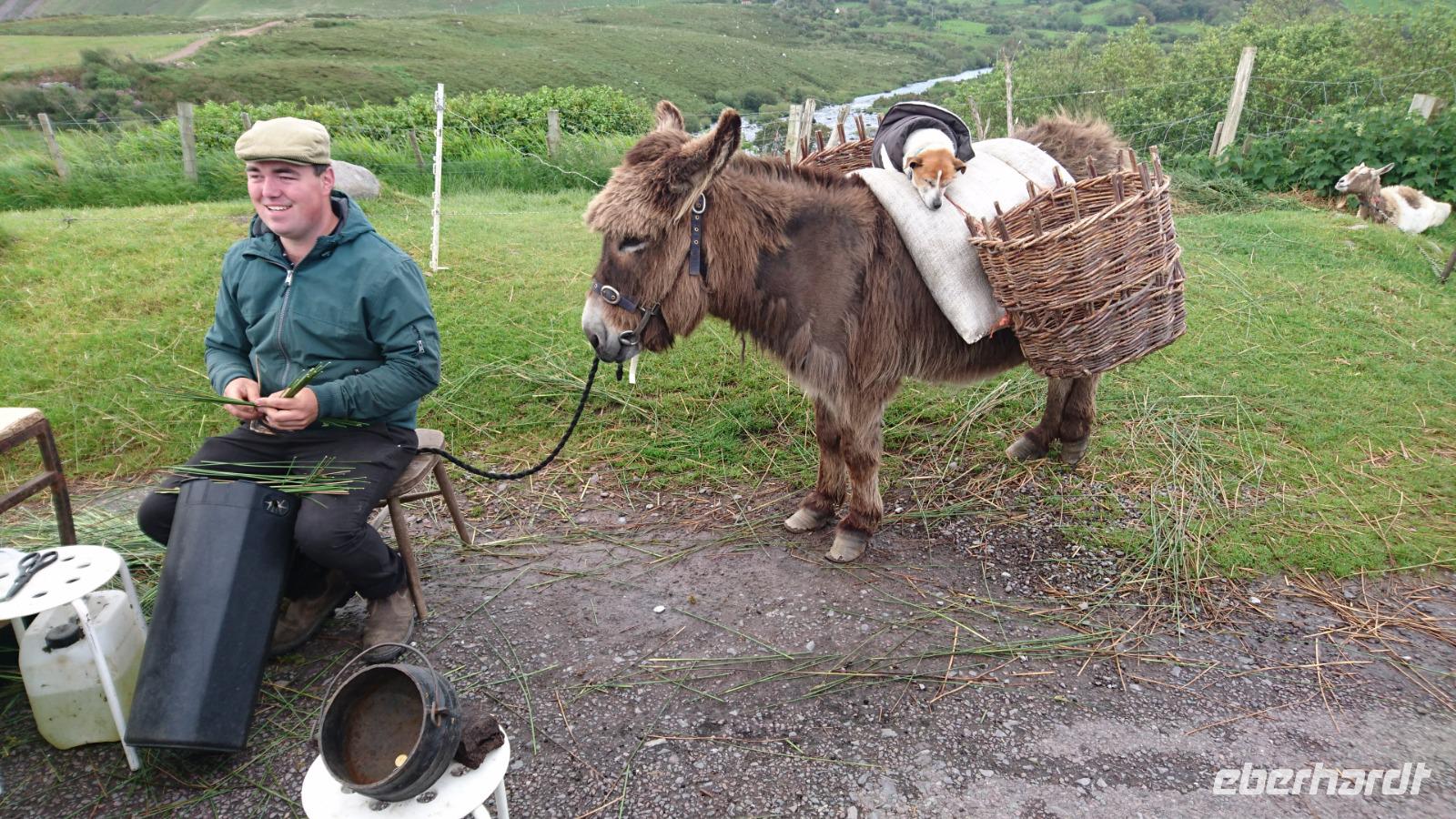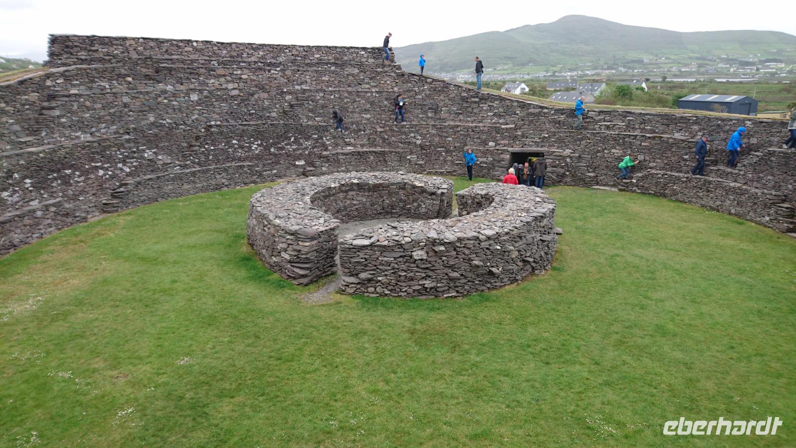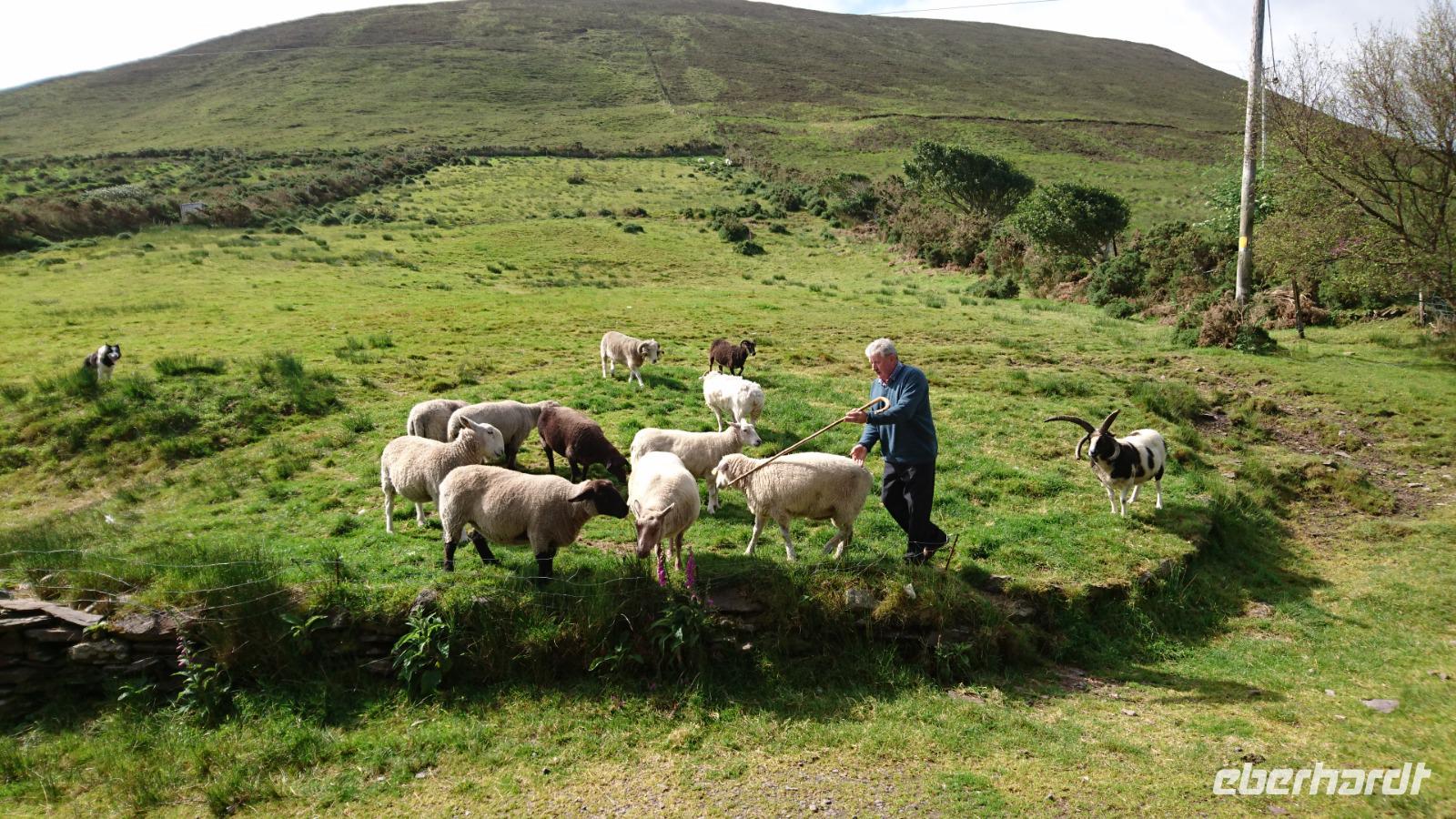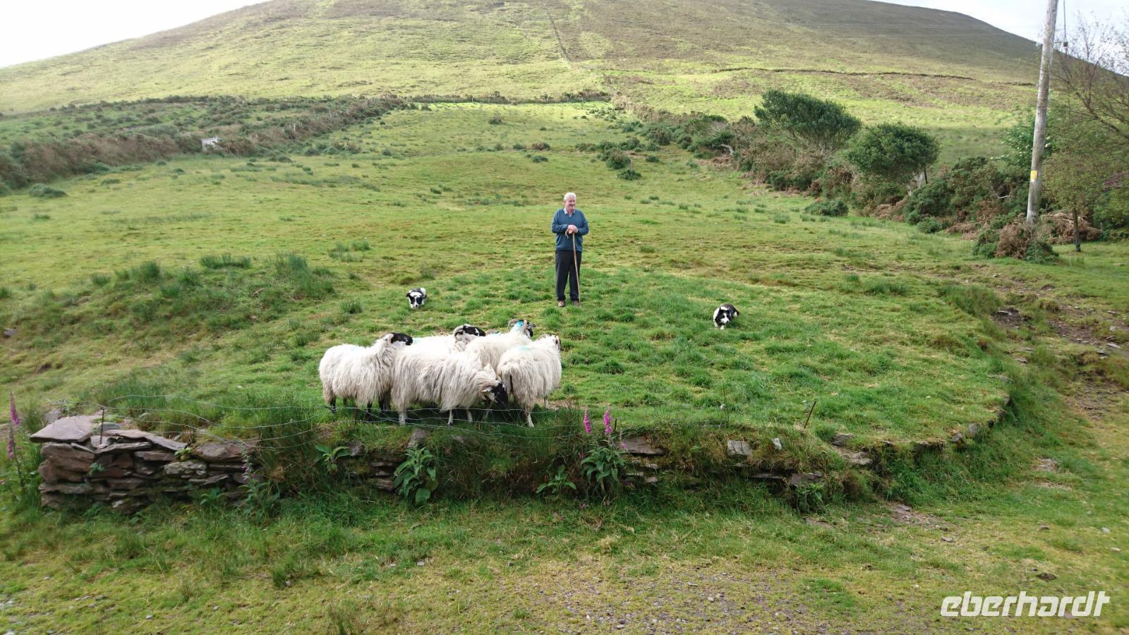 Am Morgen hielt ein Taxi vor der Hoteltür und Peter und Stefan waren wieder vor Ort. Auch wenn sie ihre Koffer mitbrachten, weil sie am Abend in unserem Hotel wohnen durften, konnten wir heute unsere Koffer auf den Zimmern lassen. Es ging ab zur Panoramafahrt auf der Halbinsel Iveragh, dem legendären Ring of Kerry. Aufgrund schmaler Straßen muss man dort in eine bestimmte Richtung, nämlich entgegen des Uhrzeigersinnes fahren, um Begegnungen gerade breiter Fahrzeuge an sehr schmalen Stellen am Ring zu vermeiden. Zuerst stoppten wir natürlich für Fotos an schönen Weiten und am Blick nach Dingle, der nördlich von Iveragh gelegenen Halbinsel der fünf Finger, die man beim genauen Hinsehen auf eine irische Karte am südwestlichen Rand der Insel erkennen kann. Dann kamen wir zur Schaffarm, auf der uns der Schäfer den Trieb der Tiere mittels seiner speziell ausgebildeten Bordercollies erläuterte und uns auch noch verschiedenste Schafrassen vorstellte. Dann sahen wir uns noch das umfangreiche Angebot an Schafwollprodukten an, genossen einen Irish Coffee und setzten unsere fahrt entlang des Ringes weiter fort. Bald schon erreichten wir Caherciveen, den Ort, in dem Daniel o'Connel das Licht der Welt erblickte, dem wohl einzigen Ort Irlands, der eine Kirche besitzt, die nicht nach einem Heiligen, sondern eben diesem o'Connel benannt ist, und dem Ort, wo es noch eine alte Kaserne in Form eines Wohnturmes gibt. Wir fuhren erst einmal über die alte Brücke und besichtigten ein altes irisches Rundfort, einen Ort, wo früher irische Familien lebten. In Irland sind noch einige hundert dieser Forts nachweisbar, dieses dort bei Caherciveen war besonders gut erhalten und wir konnten es von außen bestaunen, nach innen gehen und sogar hinaufklettern und trotz des aufkommenden Windes eine schöne Umsicht genießen. Dann ging es nach einem Entspannungsstopp in Caherciveen weiter nach Waterville, dem beliebtesten Urlaubsort des Ringes und gleichzeitig auch von Charlie Chaplin, dem der Ort sogar eine lebensgroße Statue widmete und ihn überall weiterleben lässt. Seine Töchter besitzen wohl noch Häuser dort. Wir wollten hier kein Haus haben, sondern nutzten den Aufenthalt als Mittagspause, ehe es weiter ging, hinauf in die Berge, durch kleine Dörfer und hinein nach Sneem, einem winzigen und doch von Touristen gern besuchten Ort mit hübschen Läden, einem kleinen Markt, einem Garten der Sinne und einem Lagen mit irischer Musik, den wir alle nicht nur umlagerten, sondern auch nutzten, um uns mit irischer Musik auf CD für zuhause einzudecken. Später fuhren wir durch die engen Straßen aus Sneem heraus und weiter mach Killarney, wo gerade ein Motorradtreffen stattfand. Hatten wir am Morgen noch Kontakt mit einem örtlichen Radrennen, war nun die Stadt verstopft von Motorradfans. Doch wir kamen irgendwann hindurch und erreichten später Tralee, wo wir heute zeitig zu Abend aßen und dann noch etwas Besonderes vor uns hatten. Alle die mochten, besuchten heute die irische Steppshow der irischen Nationaltheaters Siamsa Tire. Zu Beginn gab Stefan noch einen Irish Coffee aus und dann sahen wir die Show, die nur so von Lebensfreude strotzte und uns seht erfreute, ehe wir am späten Abend, eher mitten in der Nacht zu Bett gingen. Morgen wurde ja wieder gereist. Also... ausruhen!