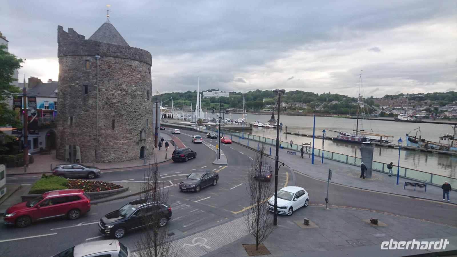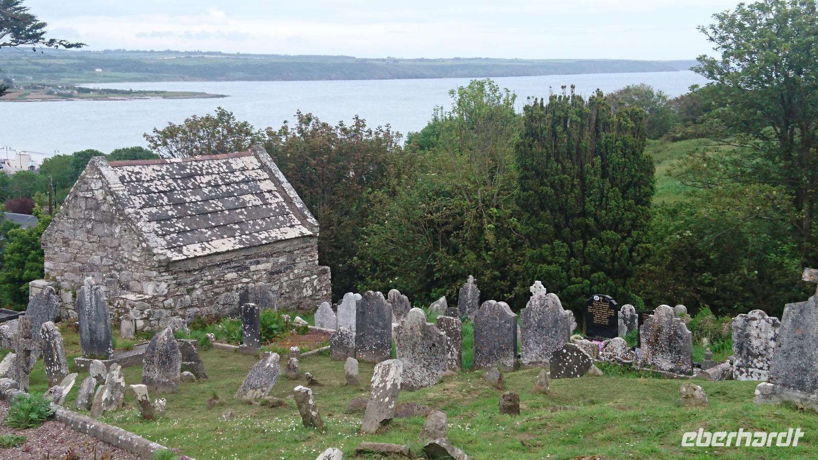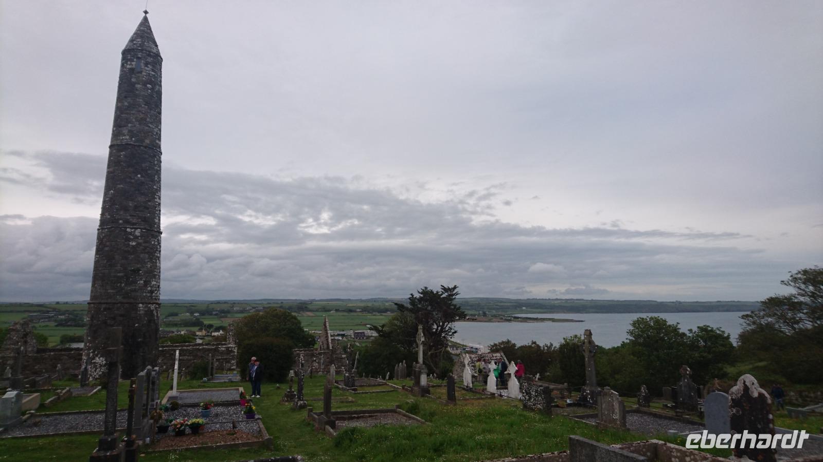 Ging es die letzten Tage nach Süden, schwenkte unser Kompass heute nach Osten. Peter puzzelte wieder all unsere Koffer ins Busfach und ab ging es, weiter herum um die Insel. Nach einiger Zeit erreichten wir Macroom für eine kleine Pause und die Besichtigung von Ort, Kirchhof und Castlefront, dann ging es vorbei an der größten Spielzeugsoldatenfirma der Welt und an Cork nach Cobh, der ehemaligen Hafenstadt von Cork und dem letzten Ort, wo die Titanic anlegte und hunderte von Iren aufnahm, die nach Amerika auswandern wollten. Damals hieß der Ort nach Königin Victoria noch Queenstown, doch mit der irischen Unabhängigkeit wollte man sich in der Republik Irland von den alten Königsnamen trennen und gab dem Ort wieder seinen alten irisch-gälischen Namen zurück. Wir besichtigten Ort, Pubs, Läden, Kathedrale, Denkmäler für untergegangene Schiffe und erfolgreiche Sportler und fuhren dann, gestärkt mit Würstchen aus dem Bus und eingenommen am Heritage-Center des Ortes am Busparkplatz, weiter nach Midleton, dort natürlich zu Jameson, der größten Whiskey-Produktionsfirma Irlands. Hier organisierte Stefan den schnellen Beginn unserer Führung und übersetzte dann auch gleich, was uns die Führerin erläutern wollte. Die Verkostung, erst im Vergleich zwischen schottischem, amerikanischen und irischen Whisk(e)y, dann mit einem Getränk unserer Wahl an der Formen-Museums-Theke, war auch toll und wir kamen ins Erzählen und bemerkten kaum, wie die Zeit verging. Nun noch schnell etwas im Souvenirshop einkaufen für daheim und dann ab in den Bus. Manch einer ließ sich sogar einen kleinen Flachmann mit seinem Namen gravieren, ehe wir wieder auf die Piste fuhren und weiter gen Osten kamen. Natürlich hatte Stefan wieder die passende irische Musik dabei und so hörten wir während der gesamten Tour viele bekannte oder auch für uns völlig neue irische Lieder, nun jedoch Pub-Musik, wie es nach der Verkostung auch passte. Aber wir fuhren jetzt nicht so einfach durch zum Hotel, obwohl der Tag ja schon fortgeschritten war. Irgendwann bog Peter, geführt von Stefan, ab gen Meer und wir erreichten Ardmore, einen kleinen Kirchhof mit einem gut erhaltenen Rundturm, einer Abteiruine und der ältesten noch erhaltenen Kapelle Irlands und einem wunderbaren Blick hinunter zum Strand von Ardmore und aufs Meer. Nach noch einmal vielen Fotos und einem interessanten Wendemanöver unseres Peter-Busses waren wir wieder auf der Straße und ab ging es nach Waterfort zu unserem heutigen Tower-Hotel direkt am Hafen und am Wikingermuseum. Denn Waterfort ist die älteste Stadt Irlands, einst, wie Dublin, gegründet durch die Wikinger und schön gelegen und gestaltet. Wir bezogen unsere Zimmer, aßen zu Abend und bummelten noch etwas durch die Stadt, ehe wir uns für die letzte Besichtigungsetappe unserer Tour zum Ausruhen niederlegten.