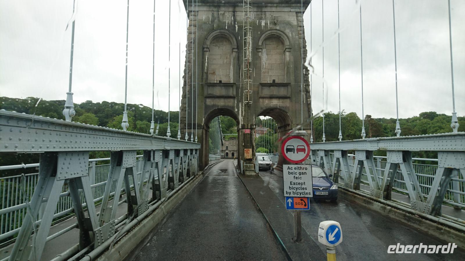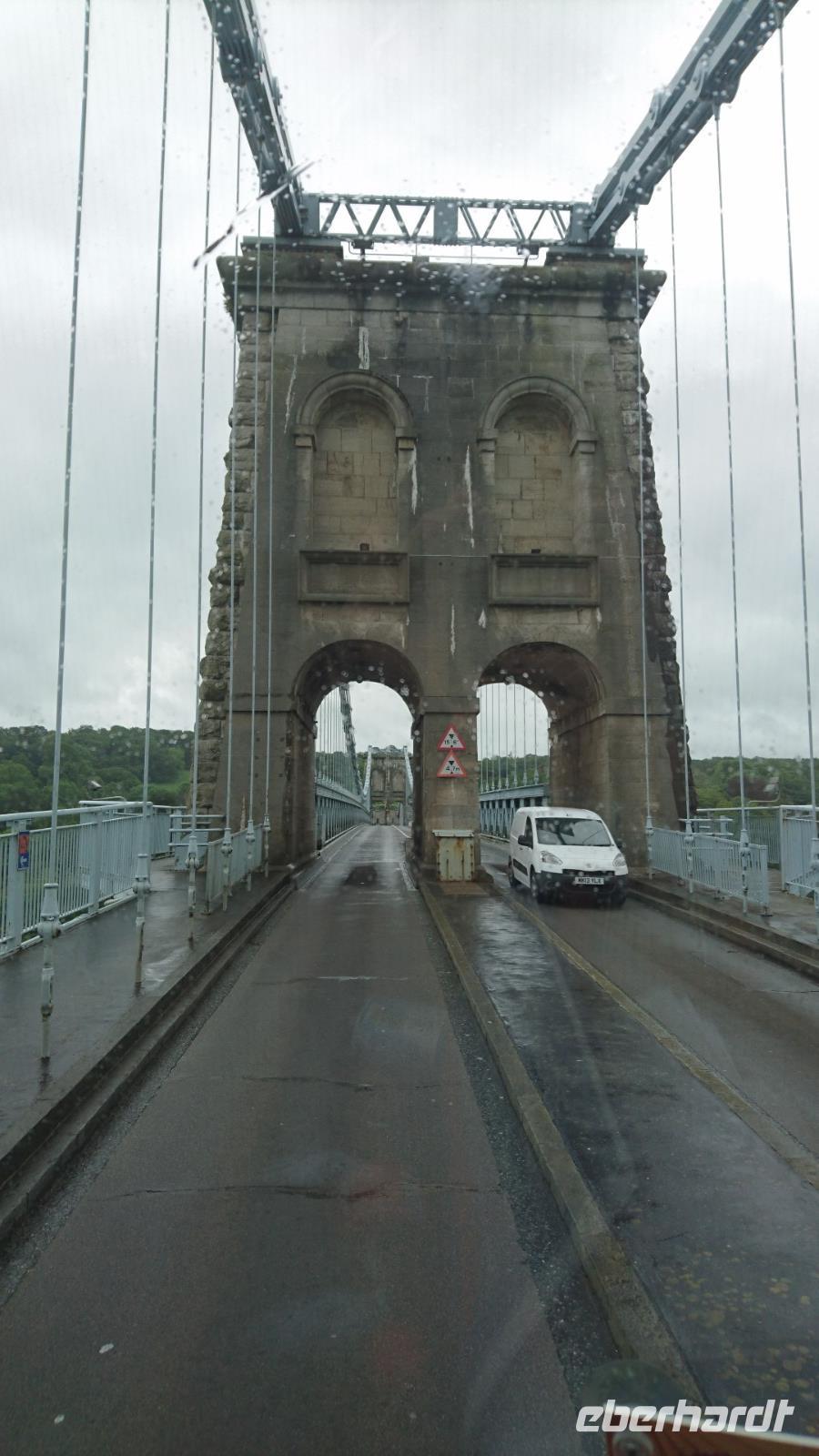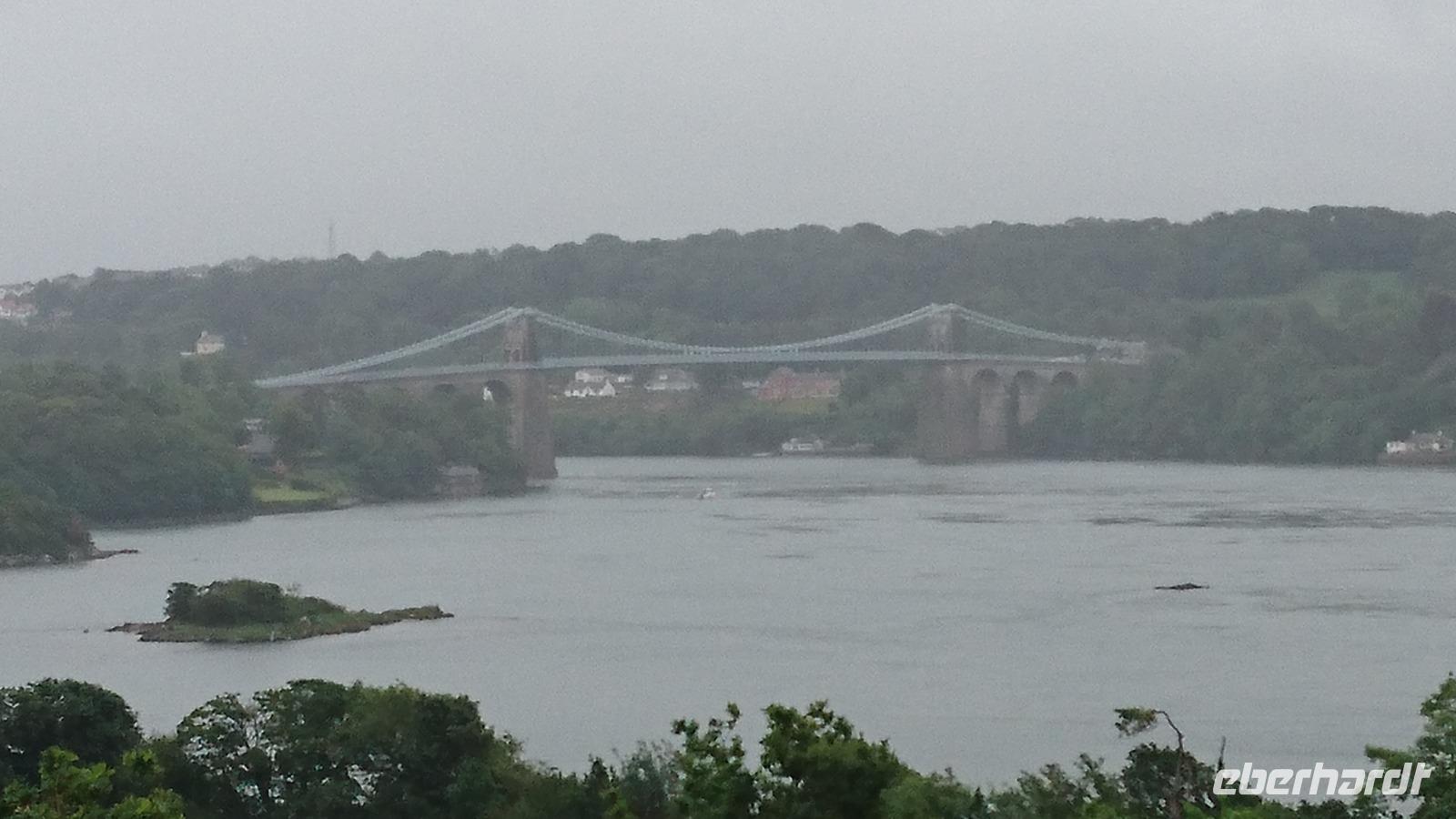Der frühe Vogel... Na ja, wir waren eben früh munter und dann ging es für die Busgäste zum Bus, die Koffer wurden schon nach Aus- und Umsteigestellen in Deutschland verladen und nach den Morgengetränken ging es ab in den Fährhafen, wo wir wenig später an Bord der Ulysses fuhren, mit der wir nach über drei Stunden drüben in Wales ankommen wollten. Die Überfahrt verlief glatt und bald schon rollte unser Bus wieder, vorbei an den britischen Kontrolleuren auf walisische Straßen und dort bald zum Ort mit dem längsten Bahnhofsnamen der Welt, abgekürzt Llanfair PD. Hier nutzten wir die Möglichkeiten zur Entspannung und zum Umsatz der letzten Pfunde aus Nordirland, ehe wir von da weiter an den östlichen Rand der Insel Anglesey, an die Menaistraße fuhren, wo wir mit herrlichem Blick auf die Menai- und die Britannia-Bridge unser Mittag am Bus einnahmen. Dann wagten Peter und Stefan die enge Überfahrt über die Menaibridge, die natürlich gut ging. Drüben auf dem walisischen insel-Festland angekommen, fuhren wir mit flinken Reifen nach Conwy, sahen uns dort im Vorbeifahren Stadtmauer und Burg an und waren bald schon in England, südlich von Liverpool, wozu Stefan natürlich die Beatles über die Lautsprecher erklingen ließ. Nach einem Entspannungsstopp am Birch-Service, dem Birken-Autohof, ging es vorbei an der etwas Golden-Gate-Flair verbreitenden Humber-Bridge nach Hull und dort quer durch die Stadt zum Fährhafen, wo wir ebenso pünktlich wie überall auf unserer Tour eintrafen, Peter und Stefan mit unseren Ausweisen unsere Tickets holten, wir dann durch die britische Sicherheitskontrolle fuhren und schließlich auf die Fähre kamen, unsere Kabinen bezogen und individuell mit unseren Essensgutscheinen den Abend und das Abendessen an Bord gestalteten, während unser Schiff auslief und sich auf den weiten Weg nach Rotterdam machte. Manch einer sah sich die Show im großen Theaterraum an, nutzte die Angebote der Piano-bar am Oberdeck oder trank noch ein letztes irisches Ale in der Irish Bar, ehe wir die Augen schlossen und auf den nächsten tag warteten.