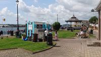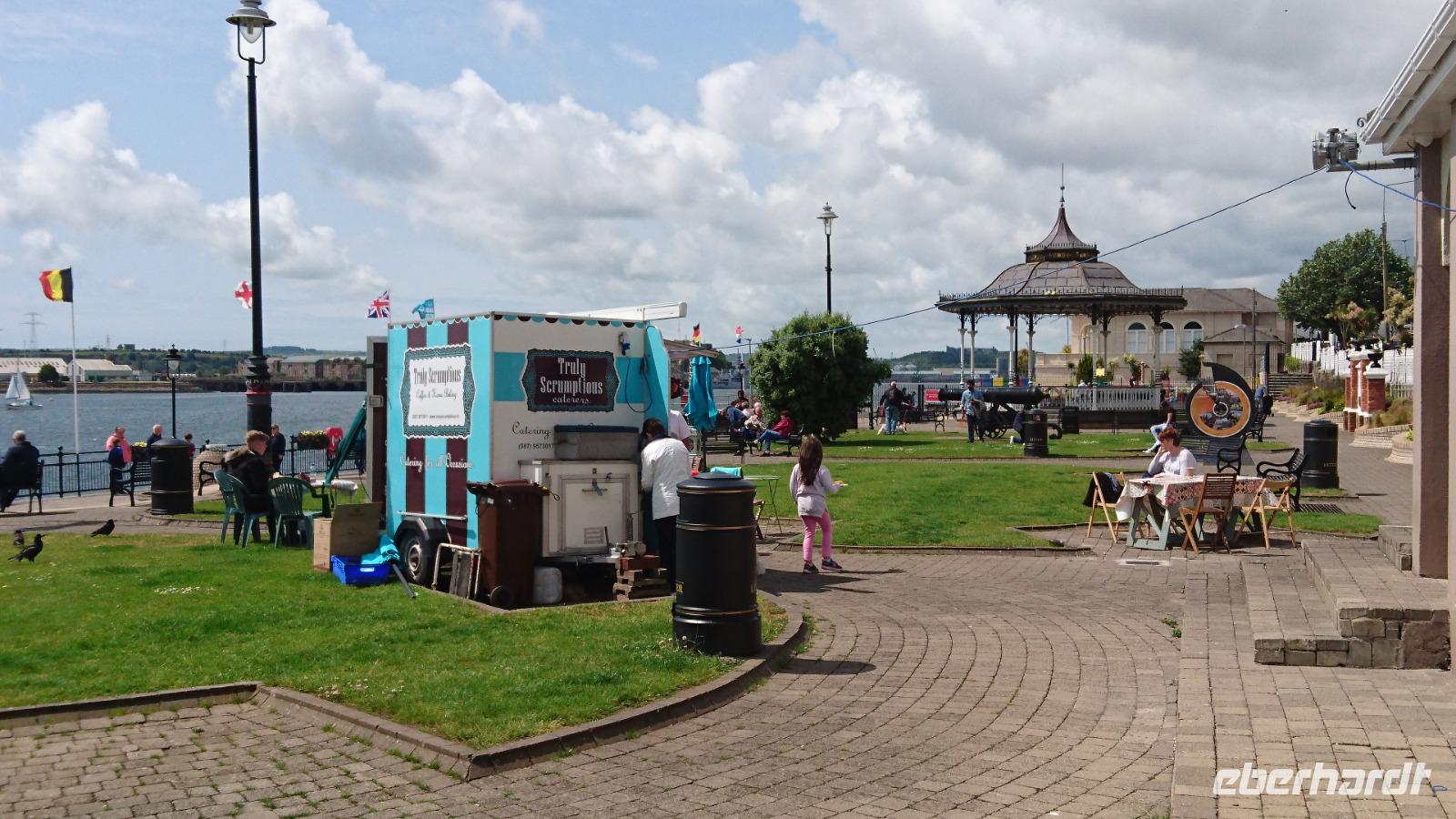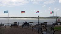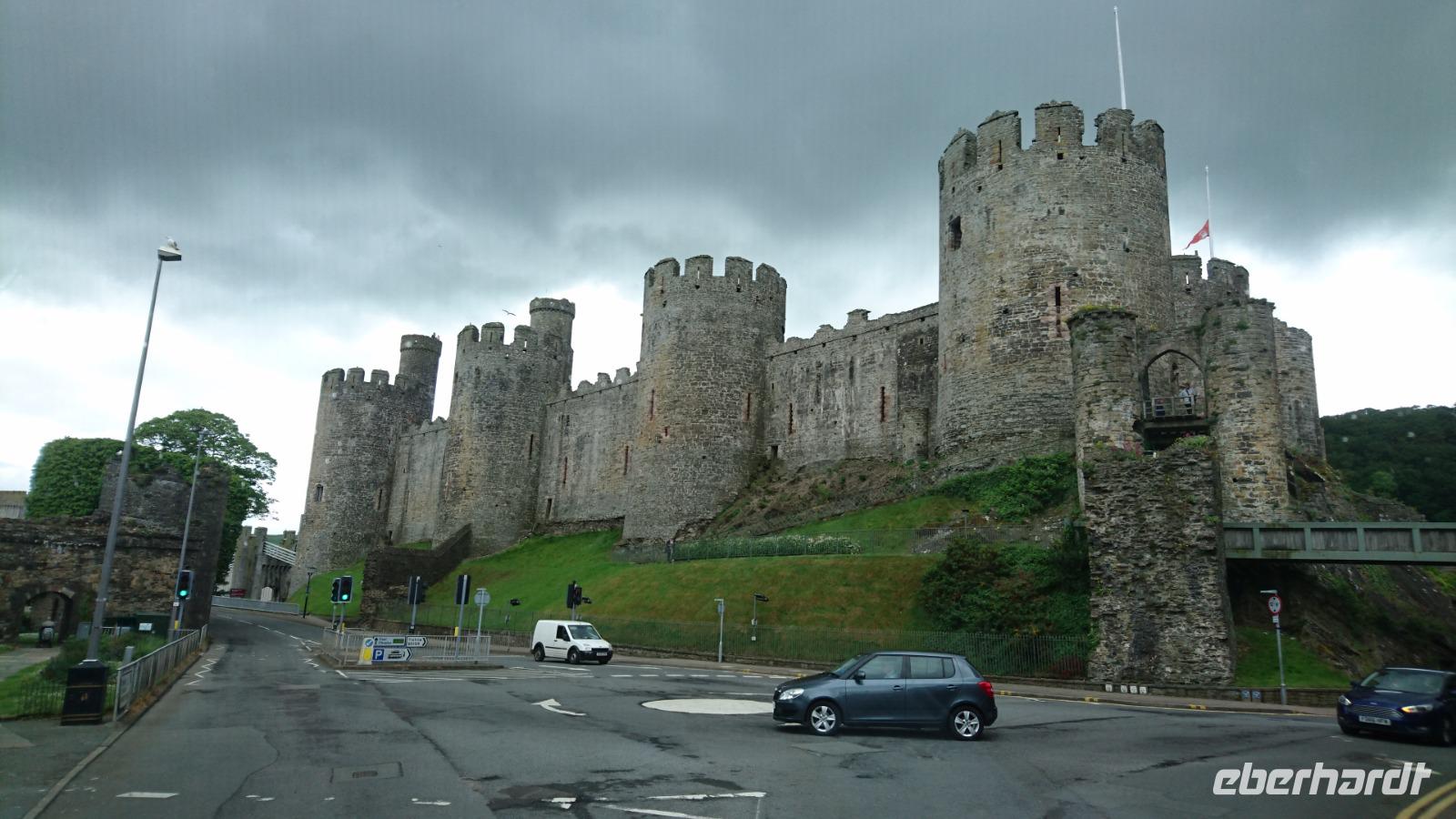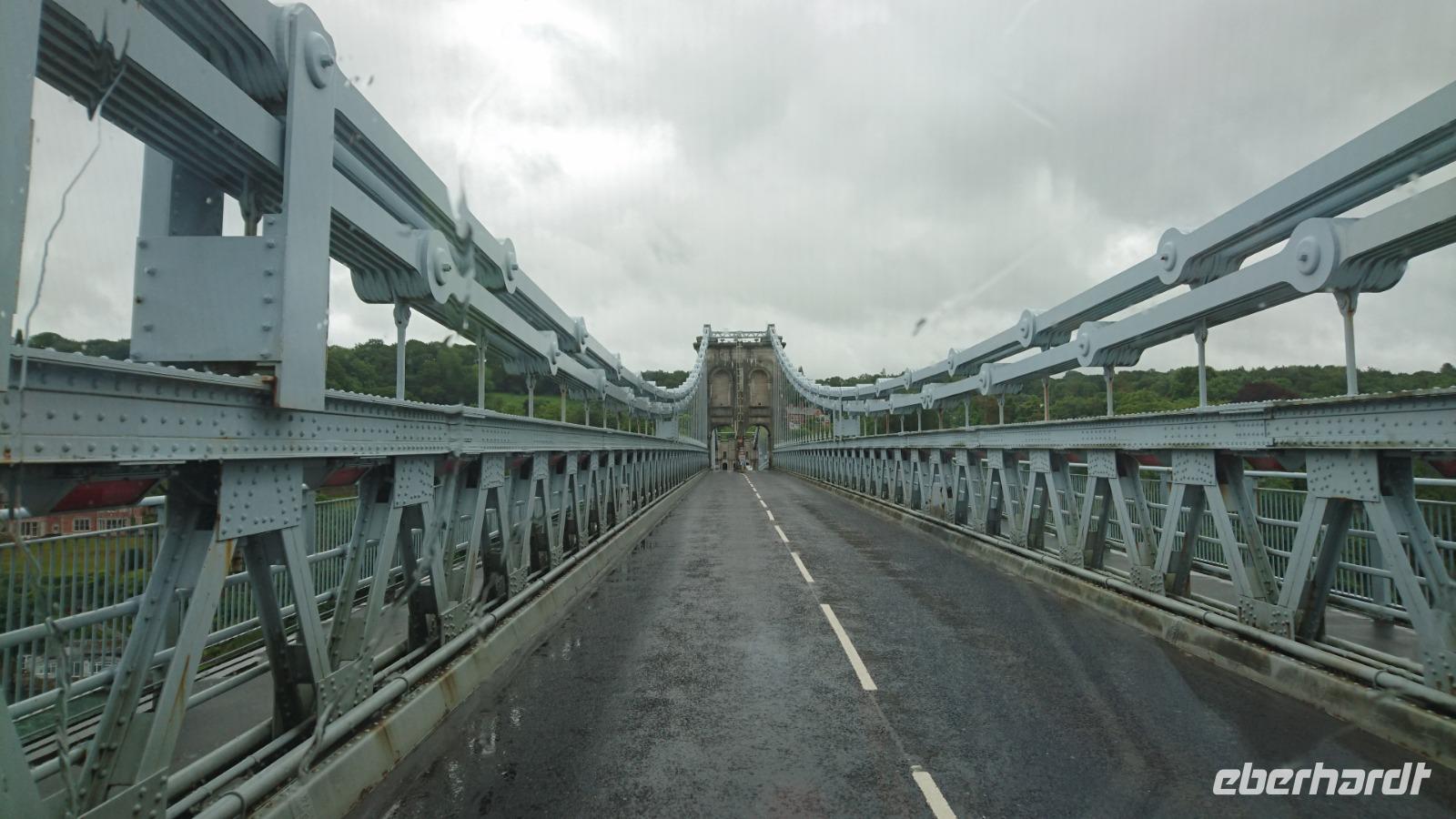 Der frühe Vogel... Na ja, wir waren eben früh munter und dann ging es für die Busgäste zum Bus, die Koffer wurden schon nach Aus- und Umsteigestellen in Deutschland verladen und nach den Morgengetränken ging es ab in den Fährhafen, wo wir wenig später an Bord der Ulysses fuhren, mit der wir nach über drei Stunden drüben in Wales ankommen wollten. Die Überfahrt verlief glatt und bald schon rollte unser Bus wieder, vorbei an den britischen Kontrolleuren auf walisische Straßen und dort bald zum Ort mit dem längsten Bahnhofsnamen der Welt, abgekürzt Llanfair PD. Hier nutzten wir die Möglichkeiten zur Entspannung und zum Umsatz der letzten Pfunde aus Nordirland, ehe wir von da weiter an den östlichen Rand der Insel Anglesey, an die Menaistraße fuhren, wo wir mit herrlichem Blick auf die Menai- und die Britannia-Bridge unser Mittag am Bus einnahmen. Dann wagten Peter und Stefan die enge Überfahrt über die Menaibridge, die natürlich gut ging. Drüben auf dem walisischen insel-Festland angekommen, fuhren wir mit flinken Reifen nach Conwy, sahen uns dort im Vorbeifahren Stadtmauer und Burg an und waren bald schon in England, südlich von Liverpool, wozu Stefan natürlich die Beatles über die Lautsprecher erklingen ließ. Nach einem Entspannungsstopp am Birch-Service, dem Birken-Autohof, ging es vorbei an der etwas Golden-Gate-Flair verbreitenden Humber-Bridge nach Hull und dort quer durch die Stadt zum Fährhafen, wo wir ebenso pünktlich wie überall auf unserer Tour eintrafen, Peter und Stefan mit unseren Ausweisen unsere Tickets holten, wir dann durch die britische Sicherheitskontrolle fuhren und schließlich auf die Fähre kamen, unsere Kabinen bezogen und individuell mit unseren Essensgutscheinen den Abend und das Abendessen an Bord gestalteten, während unser Schiff auslief und sich auf den weiten Weg nach Rotterdam machte. Manch einer sah sich die Show im großen Theaterraum an, nutzte die Angebote der Piano-bar am Oberdeck oder trank noch ein letztes irisches Ale in der Irish Bar, ehe wir die Augen schlossen und auf den nächsten tag warteten.