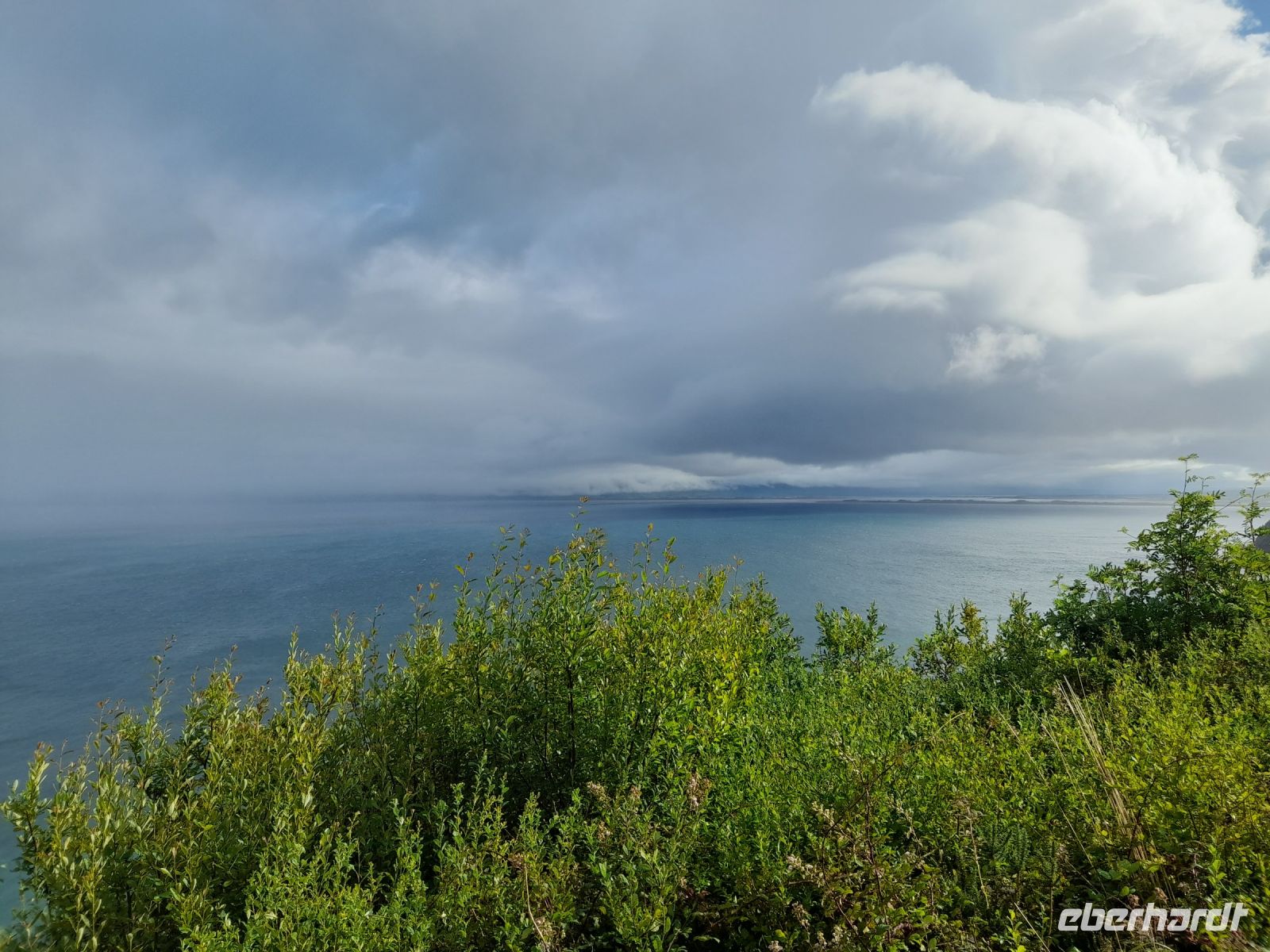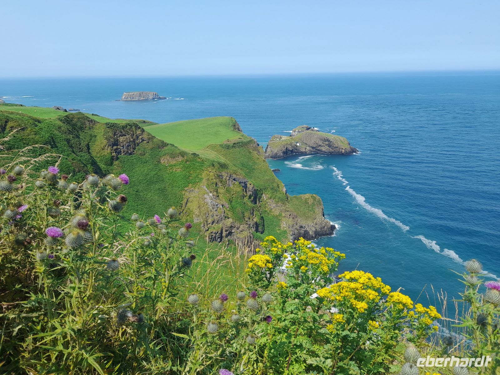 Gegen Mittag fahren wir dann noch einmal ein Stück zurück entlang der Küste und machen unsere Mittagpause an einem Aussichtspunkt, von dem man einen wunderbaren Blick auf die Steilküste und die vorgelagerte Insel Carrick-a-Reed genießen kann.