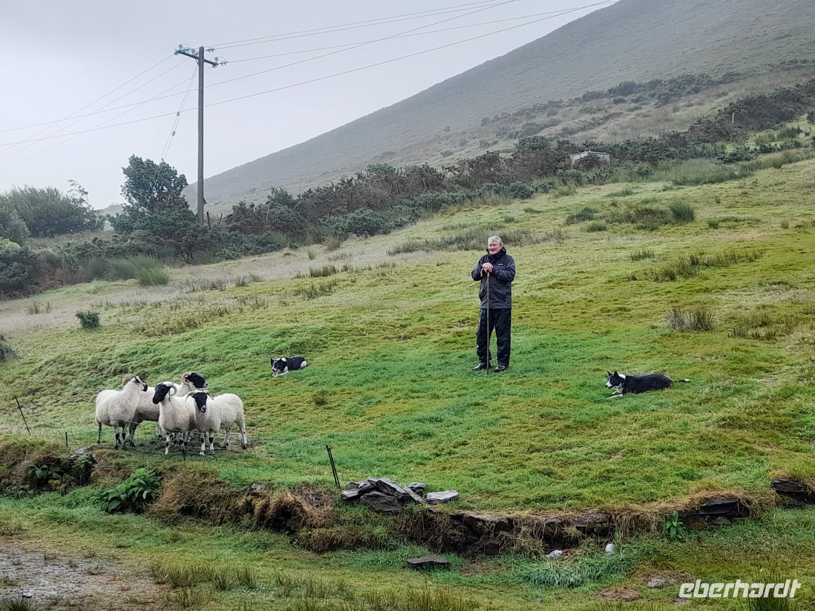Ein paar Kilometer weiter haben wir dann die Möglichkeit uns von der Lokalprominenz, Schäfer Brandon Ferries, einen Einblick in dessen Beruf geben zu lassen – immerhin gibt es über 8 Millionen Schafe in Irland. Zunächst stellt er uns verschiedene Schafrassen vor. Im Anschluss demonstriert er uns dann die Arbeit mit seinen beiden Bordercollies, die ihm dabei helfen, die Schafherde zusammenzutreiben und zu lenken. Das Schauspiel ist wirklich beeindruckend.