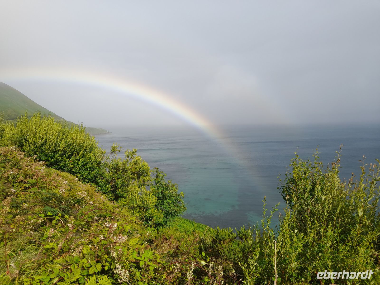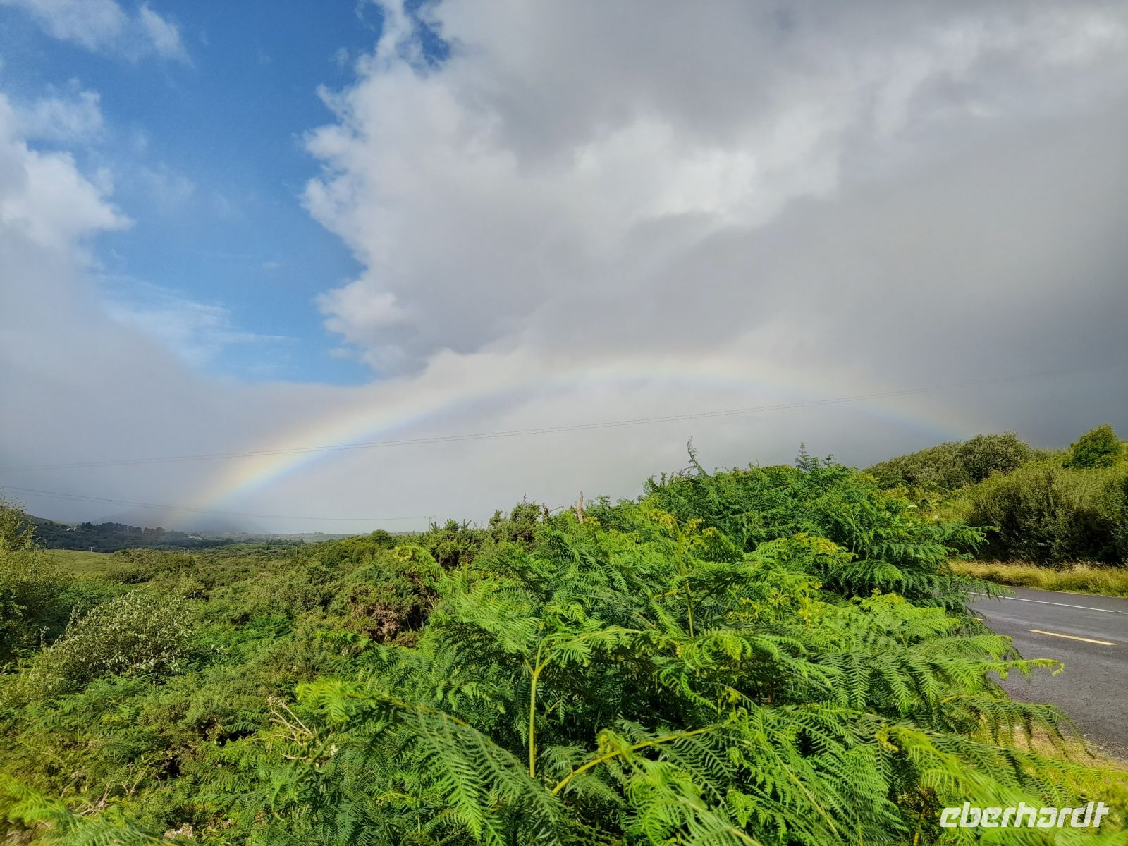 Der Wetterbericht war für heute nicht besonders positiv, trotzdem hoffen wir das Beste und starten dennoch mit guter Laune zu unserem Tagesausflug zum Ring of Kerry. Die 179 Kilometer lange Panoramastraße entlang der Küste der Halbinsel Iveragh gilt als das Sinnbild der Grafschaft Kerry. Grasende Schafe und Kühe in grünen Hügellandschaften. Unberührte Sandstrände vor atemberaubenden Klippen. Und mystische Seen und Wasserfälle gepaart mit mittelalterlichen Burgruinen und prächtigen Herrenhäusern – so zumindest in den Katalogen des Ireland Tourism zu sehen. Für Reisebusse besteht eine Einbahnstraßenregelung, so beginnen wir in Killorglin. Das Wetter zeigt sich von seiner irischsten Seite bis wir sogar Sonne und Regen gleichzeitig haben und tatsächlich auch ein Regenbogen nicht lange auf sich warten lässt. Zum Glück tut sich für uns recht schnell der perfekte Fotostopp-Punkt auf – nur den Goldschatz des Leprichaun am Ende des Regenbogens, den findet leider niemand.