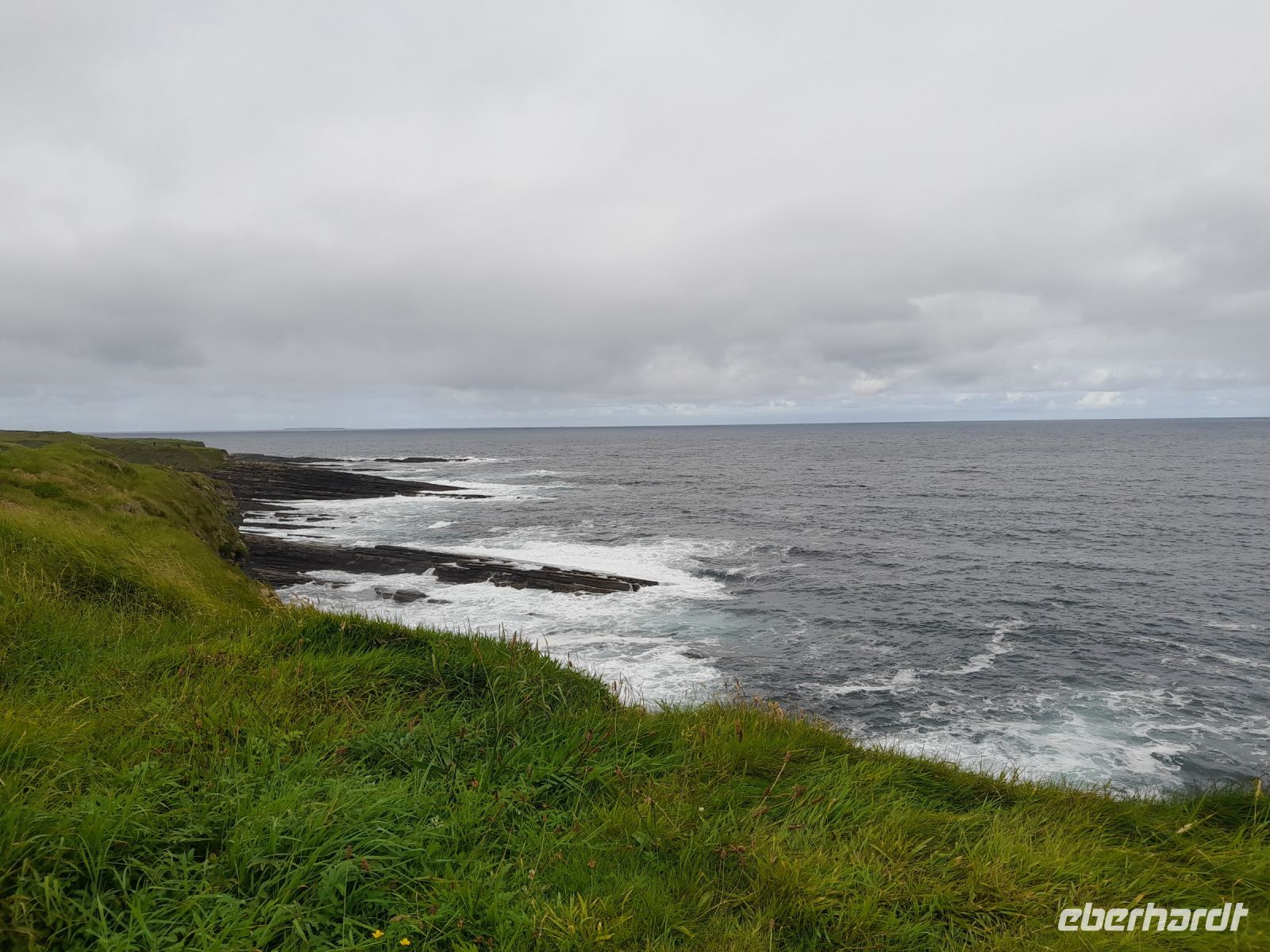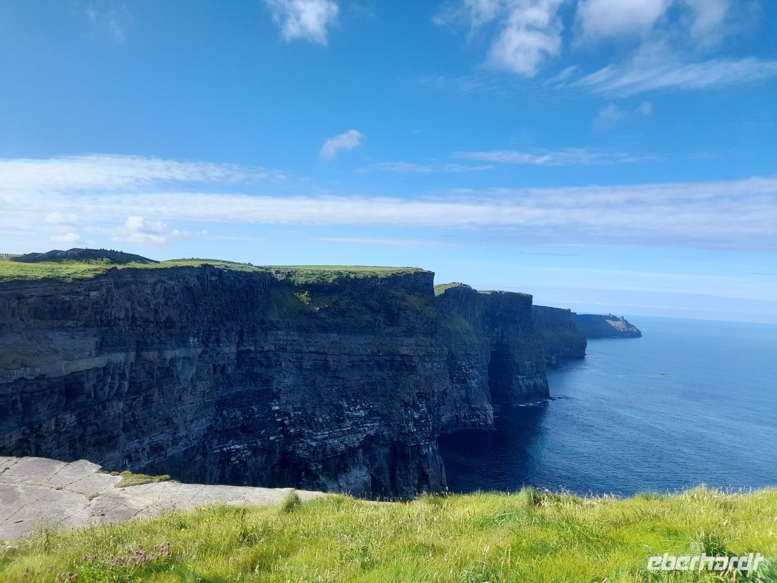 Die fast zehn Kilometer lange Steilklippenformation ragt fast senkrecht aus dem Atlantik. Am Südende, dem Hag’s Head, haben sie eine Höhe von ungefähr 120?m, nördlich des O’Brien’s Tower erreichen sie sogar 214?m. Am Kliff leben 30 Arten von Seevögeln, die bekanntesten sind die winzigen Papageientaucher, die sich in die entlegensten Ecken zurückziehen um dort zu Brüten. Das launische irische Wetter meint es wirklich gut mit uns und so können wir zwei Stunden im strahlenden Sonnenschein auf den Wanderwegen entlang der Klippen genießen. Wer noch ein wenig mehr Hintergrund zu Flora und Fauna, sowie zur Regionalgeschichte möchte, kann das informative Besucherzentrum besichtigen.