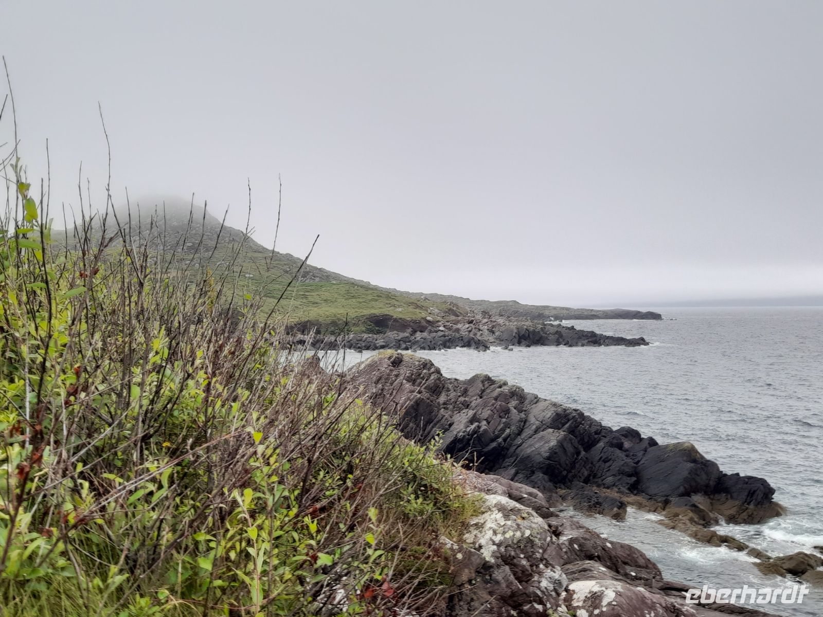 Bergan zum 210 Meter hohen Coomakesta Pass ist es zwar trocken, doch je höher wir kommen, desto dichter wird der Nebel. Die Aussicht auf die Ballinskelligs Bay und die Bucht des Kenmare Rivers bleiben uns leider verwehrt, aber wir nehmen es sportlich, immerhin klart des dann auf der anderen Seite des Passes wieder ein wenig auf und wir können die Küste wieder sehen. Über Caherdaniel, Castle Cove und Sneem geht es weiter entlang der N70, dann landeinwärts bis nach Moll's Gap. Seinen Namen hat der Ort von Moll Kissane, welche hier in den 1820er Jahren einen illegalen Gasthof betrieb, zu Zeiten als die Straße gerade im Bau gewesen ist. Wo einst die Hofdamen Queen Victorias die oberen Seen des Killarney Nationalparks bestaunten, bekommen wir am sogenannten Lady's View zumindest eine Idee dessen, was sich im Nebel unter uns befindet.