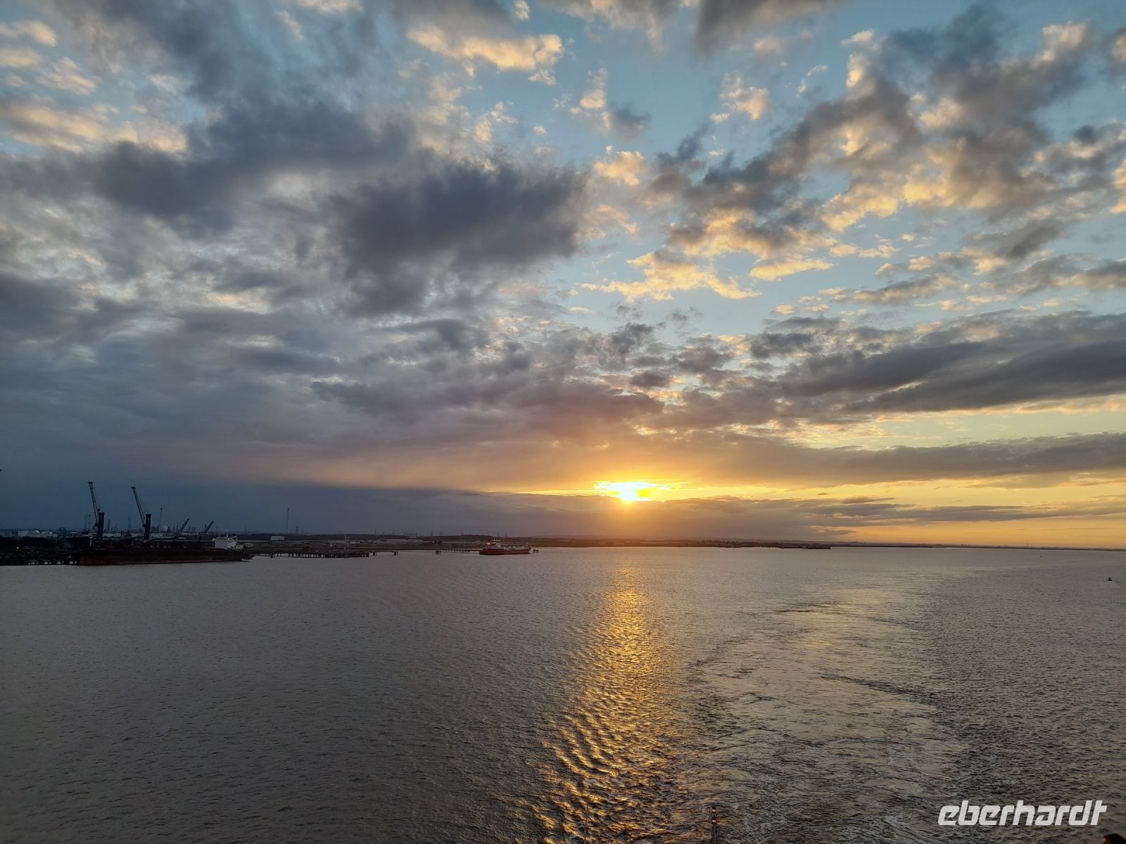 Auf der Princess Seaways stechen wir am Abend in See und fahren wortwörtlich in den Sonnenuntergang.
