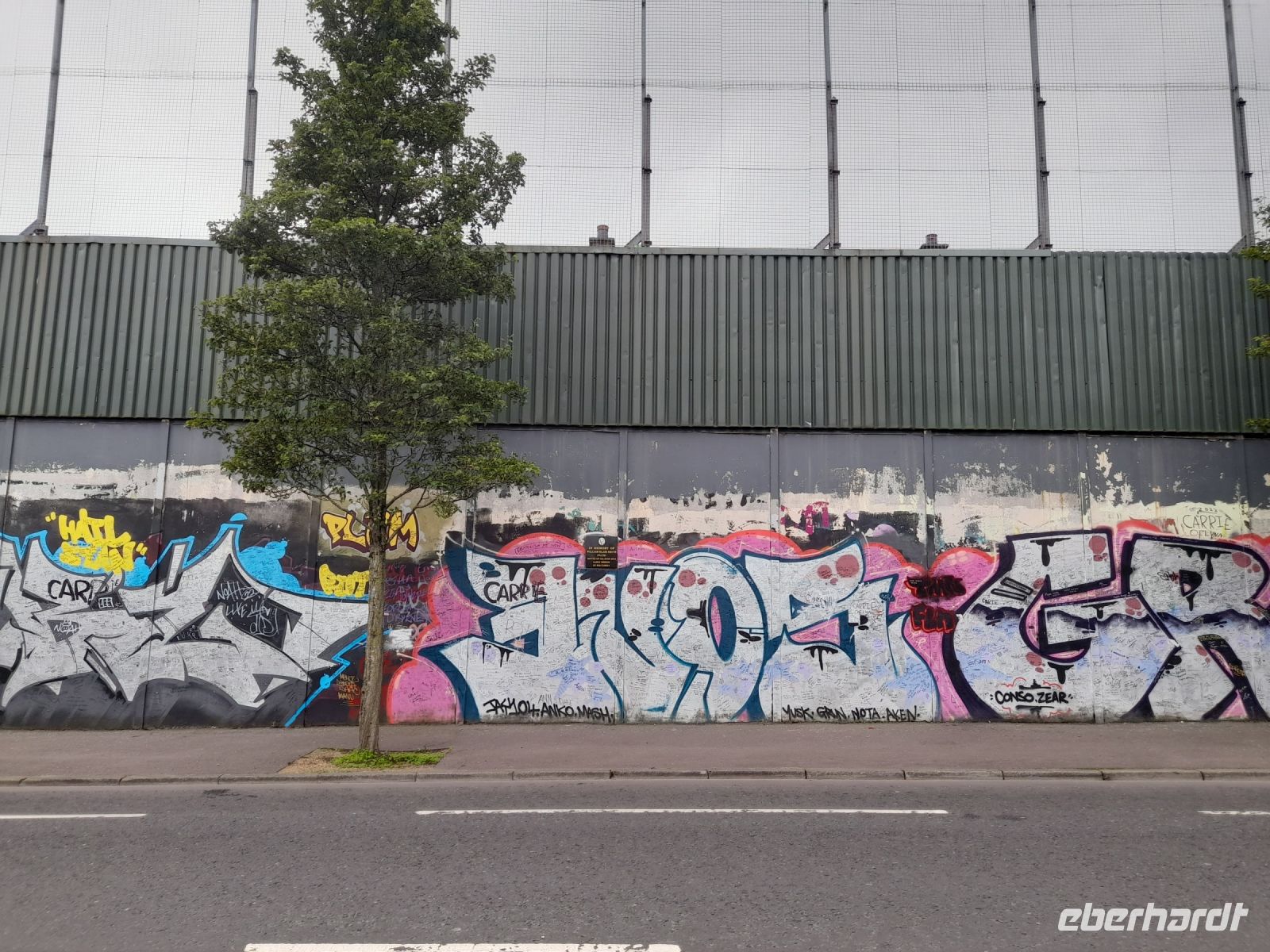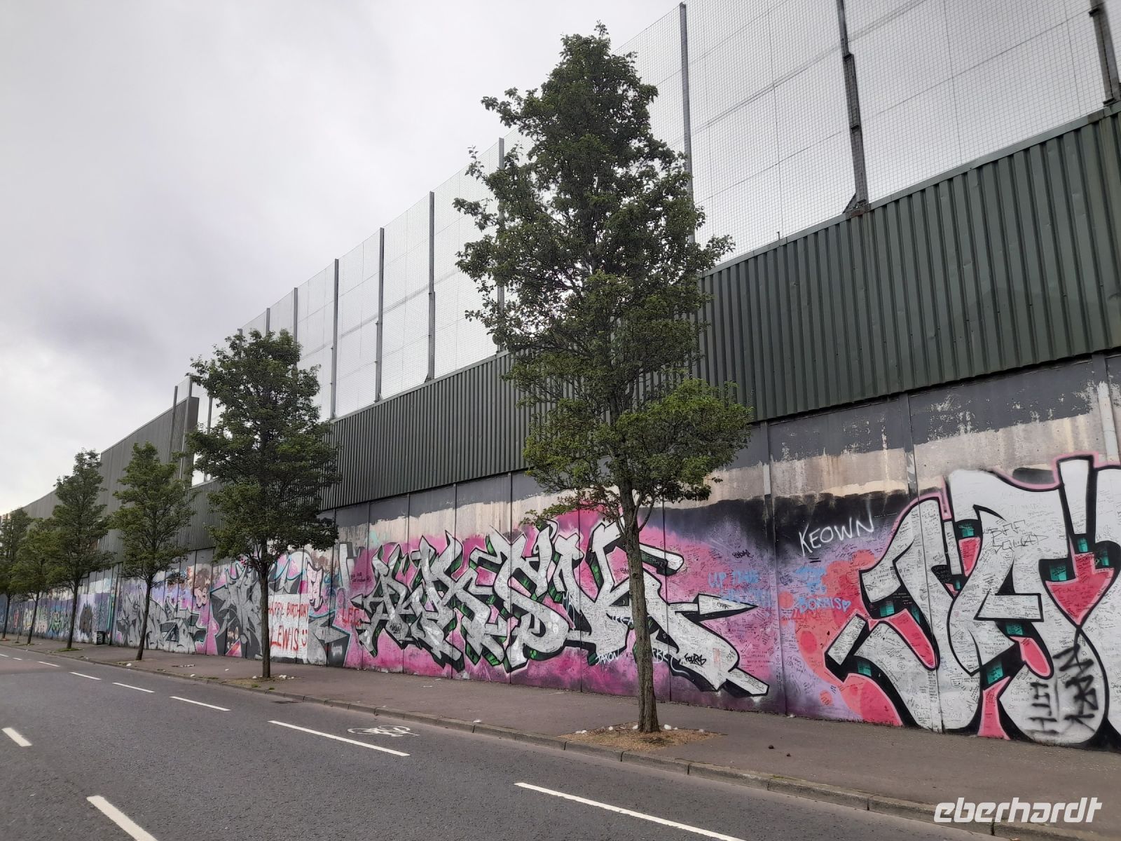 Dann geht es weiter auf Pfaden der bewegten Geschichte Nordirlands. Als Folge der jahrhundertelangen Unterdrückung der irischen Bevölkerung durch die Kolonialherren aus England war es schon seit dem 16. Jahrhundert immer wieder zu politischen und religiösen Spannungen gekommen. Ende des 17. Jahrhunderts wurde der Druck auf die katholische Landbevölkerung durch das Verbot der gälischen Sprache und der Ausübung der Religion, sowie Zugangsbeschränkungen zu Schulbildung und politischen Ämtern soweit erhöht, dass viele Iren das Land verließen, andere radikalisierten sich. 1801 wurde Irland schließlich offiziell dem Vereinigten Königreich angeschlossen. Obwohl die Unterdrückung der Katholiken gesetzlich verboten wurde, besserten sich die Lebensbedingungen nicht, im Gegenteil, mehrere Jahre der Hungersnot vertrieben noch mehr Iren in die Diaspora. Ab Ende des Jahrhunderts gab es dann eine starke Unabhängigkeitsbewegung im vermehrt katholischen Süden des Landes, die schlussendlich 1920 zur Trennung führte: 1922 wurde die Republik Irland geboren, sechs Grafschaften der Provinz Ulster verblieben als Nordirland im Vereinigten Königreich. Doch die Spannungen zwischen Protestanten und Katholiken löste dies nicht, im Gegenteil. Aus Angst vor Unterdrückung und wirtschaftlichen Nachteilen wurden in Nordirland, mit Unterstützung der britischen Regierung, systematisch Einschränkungen für Katholiken etabliert. Wohnung, Bildung, Arbeit und Wahlrecht wurden dahingehend getrennt, dass sich eine regelrechte Parallelgesellschaft bildete. In der Mitte des 20. Jahrhunderts führte dies schließlich zu gewaltvollen Auseinandersetzungen, in die bald das Militär eingriff. Die IRA rächte sich im Gegenzug mit Anschlägen auf zivile Ziele, vor allem in Belfast. Erst 2001 wurden die sogenannten „Troubles“ mit einem Waffenstillstand beendet, doch die Auswirkungen der Parallelgesellschaften lassen sich in Belfast noch heute deutlich erkennen. Friedensmauern trennen bis heute katholische von protestantischen Wohnsiedlungen. Geschmückt sind sie heute mit Wandgemälden, die sich mit politischen Themen beschäftigen. Wie viele andere Nordiren ist auch sie der Meinung, dass zunächst die Mauern in den Köpfen der Leute eingerissen werden müssen, bevor die physischen Mauern weichen können.