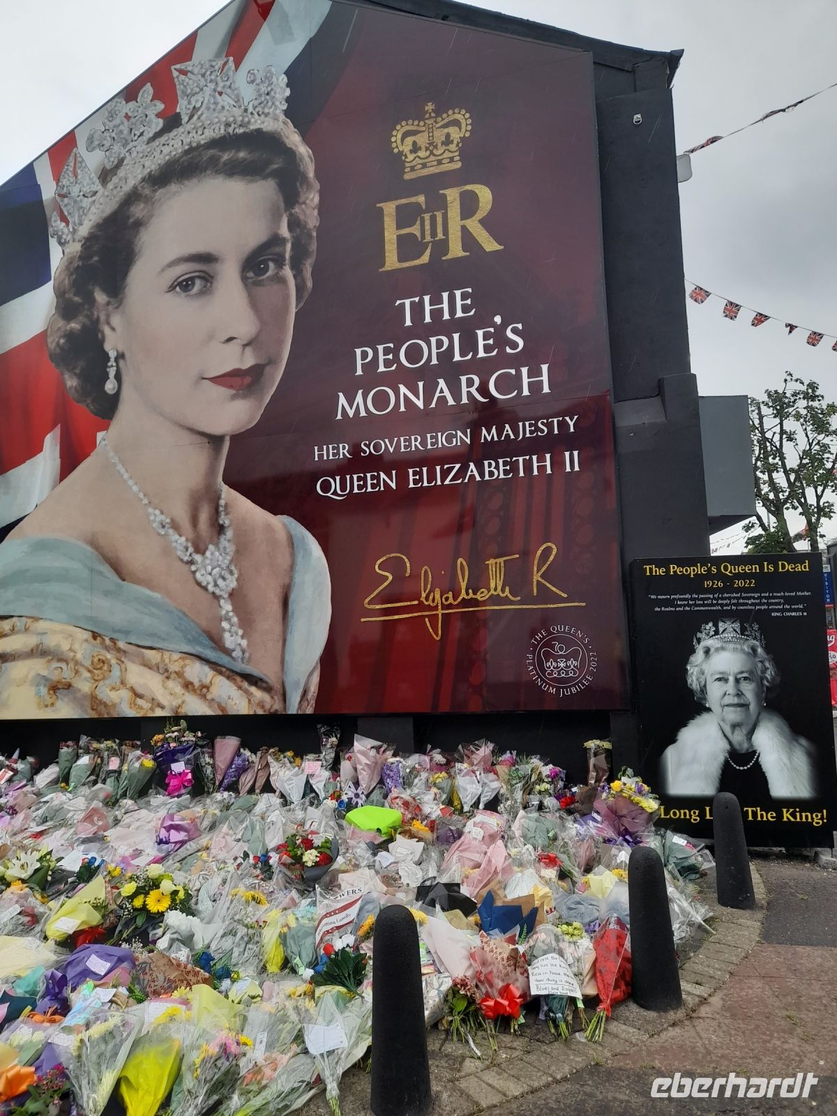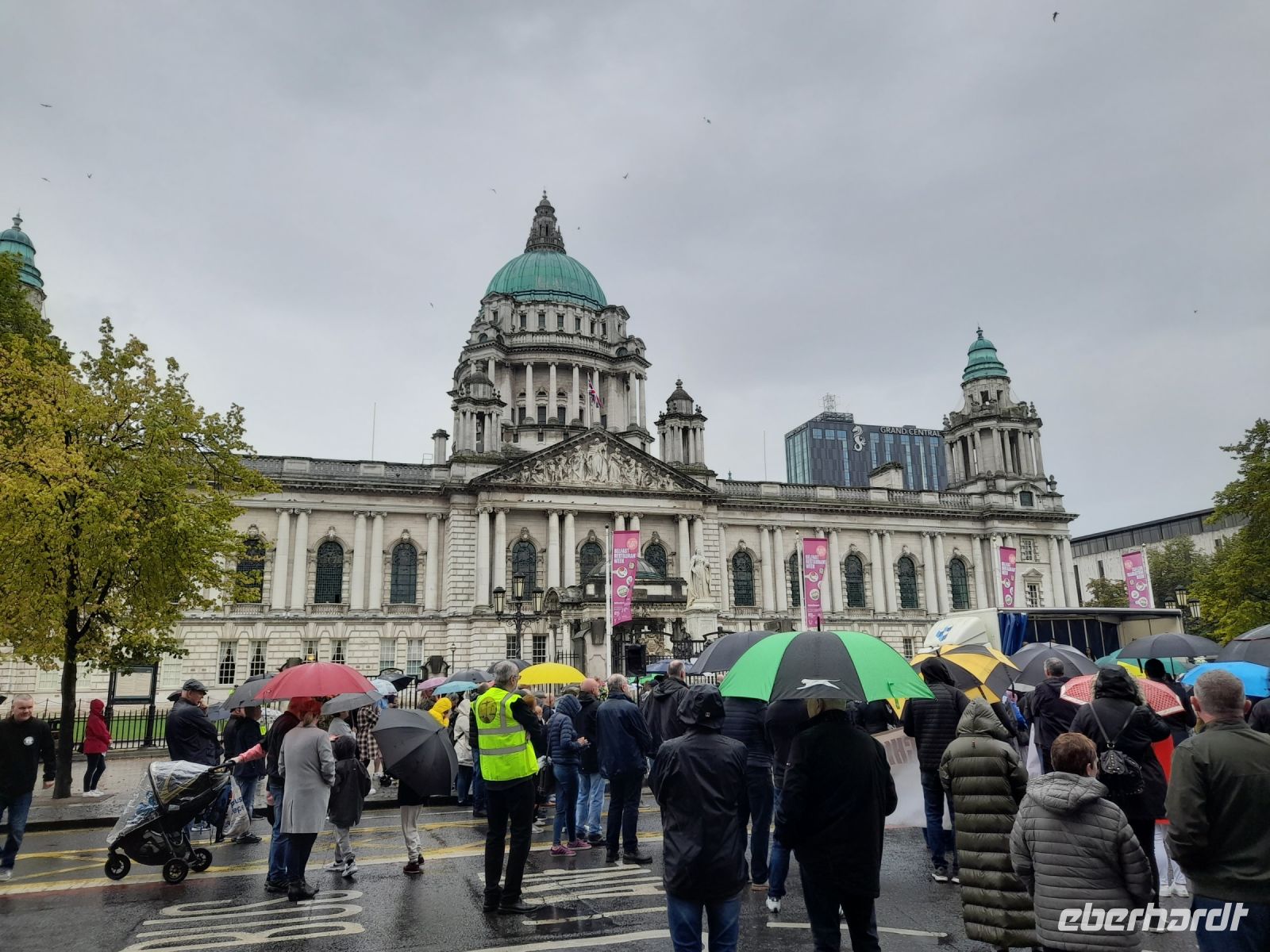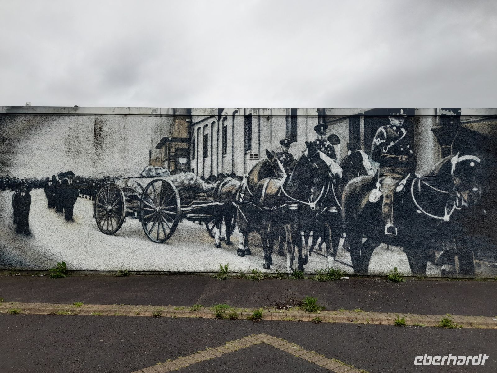 Weiter geht es im Anschluss durch die berühmte Shankill Road, die auch von den Loyalisten genutzt wird um ihre Trauer über den Tod Königin Elizabeths Kund zu tun. Das Wandgemälde, das zum Thronjubiläum angefertigt wurde, ist nun zentraler Ort, an dem Blumen und Beileidsbekundungen niedergelegt werden. Auch der Himmel scheint an der Trauerstimmung teilzunehmen, denn langsam beginnt es nun zu regnen.