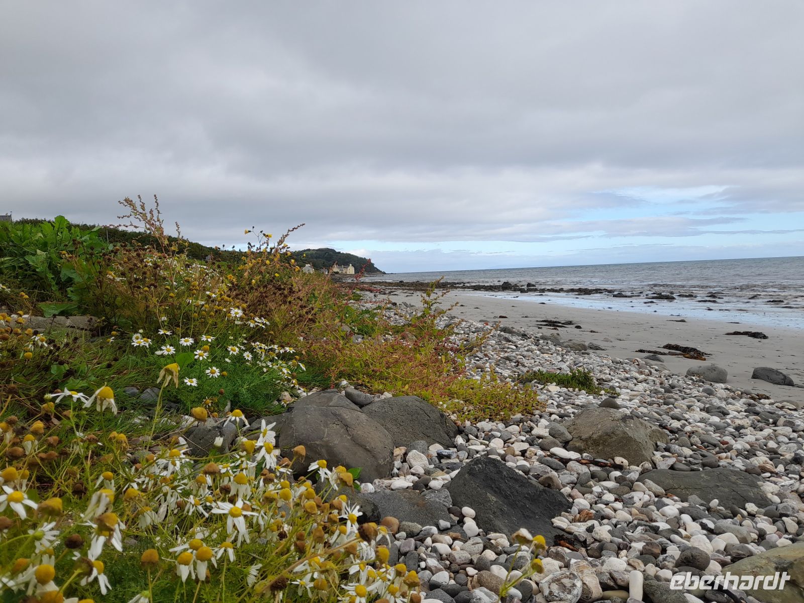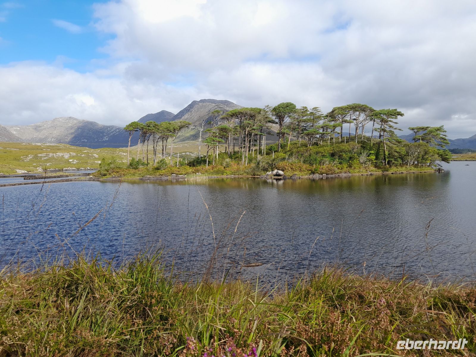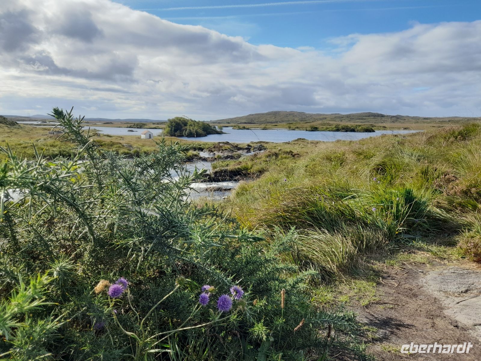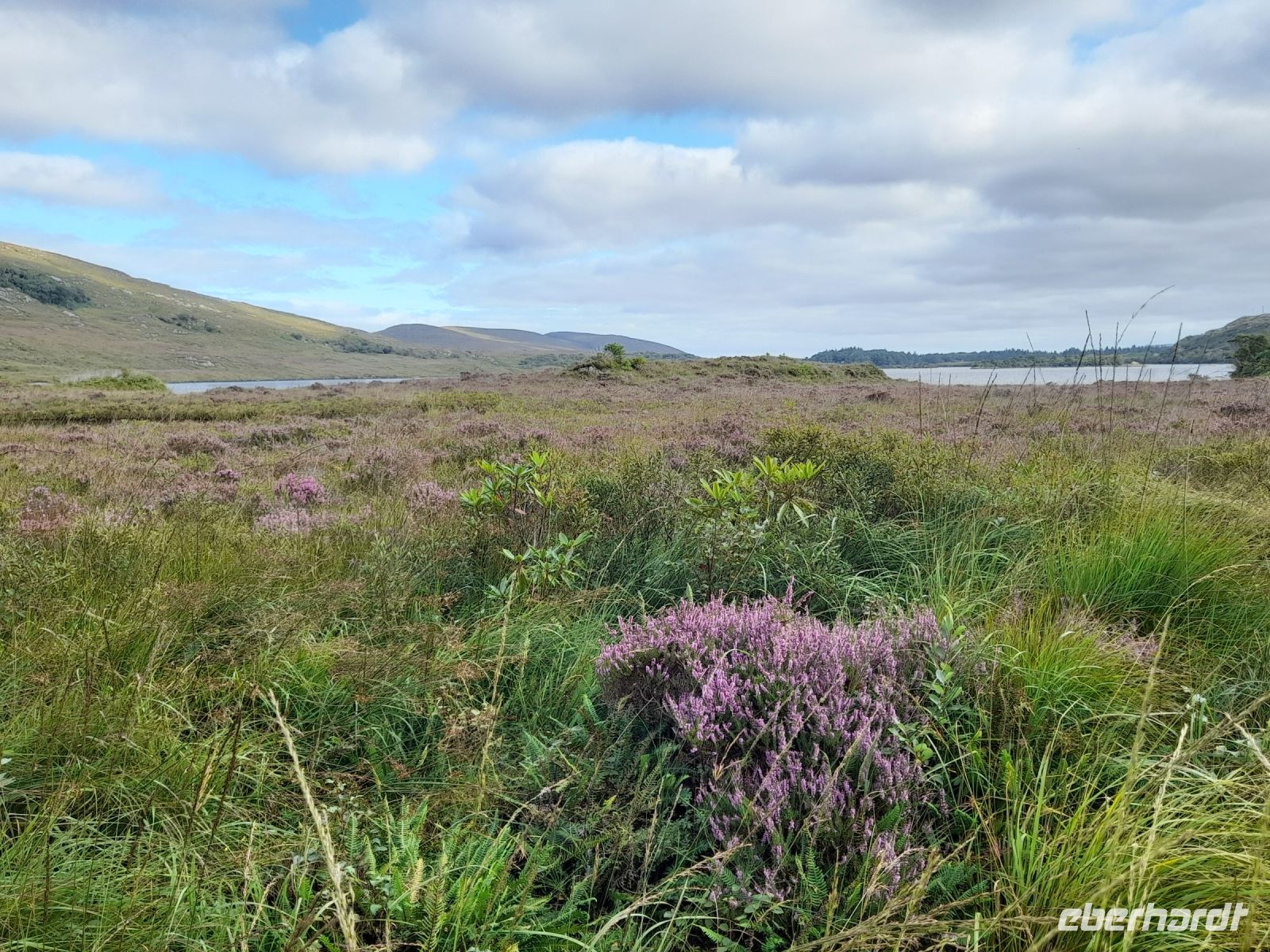 Wir fahren zunächst durch noch einmal durch Galway und folgen dann der Küste der Galway-Bucht bis nach Spiddal, wo wir einen ersten kurzen Stopp einlegen. Dann geht es hinein in die wilde Landschaft Connemaras, die zu dieser Jahreszeit geprägt ist durch die blühende Heide.