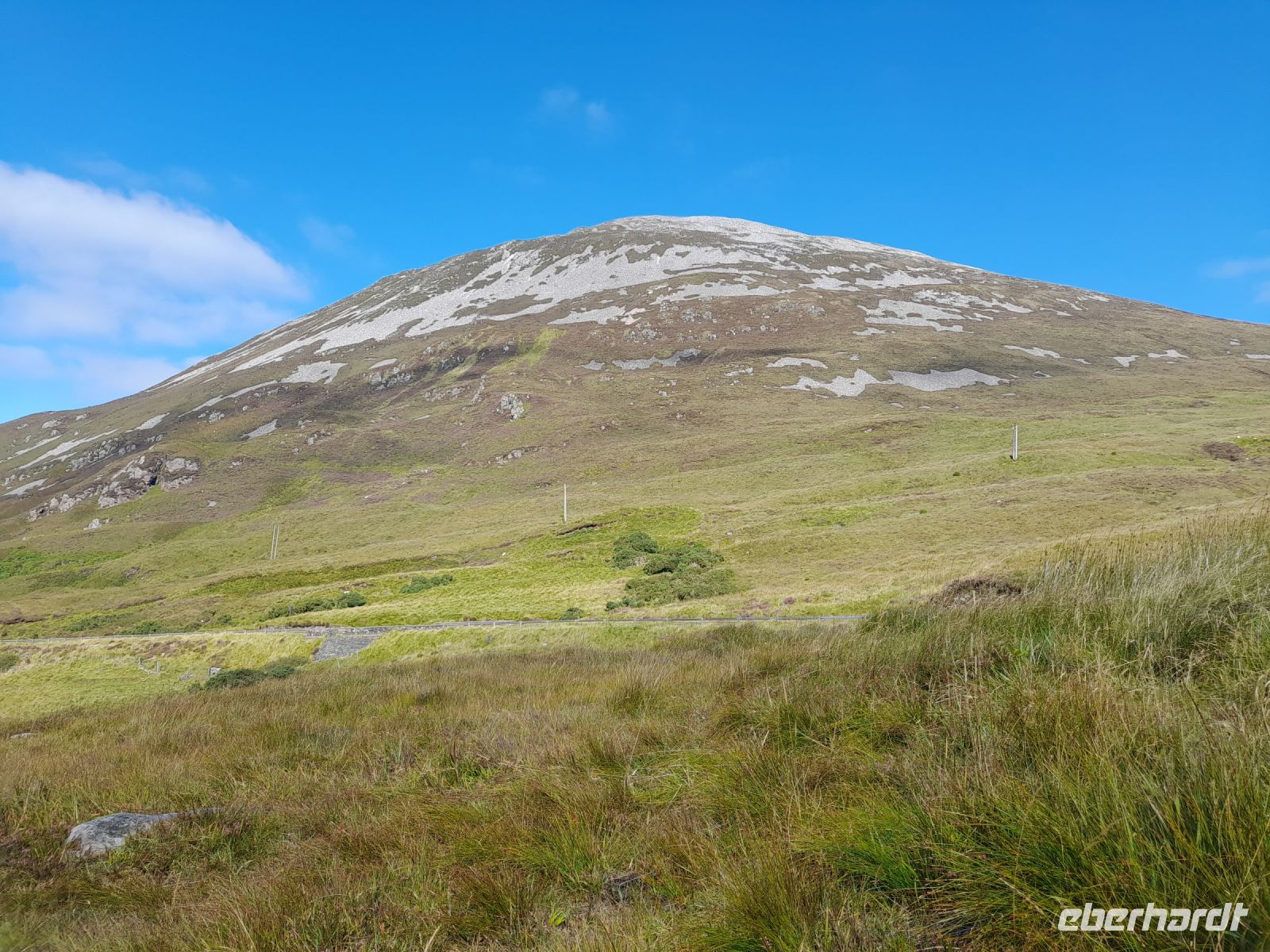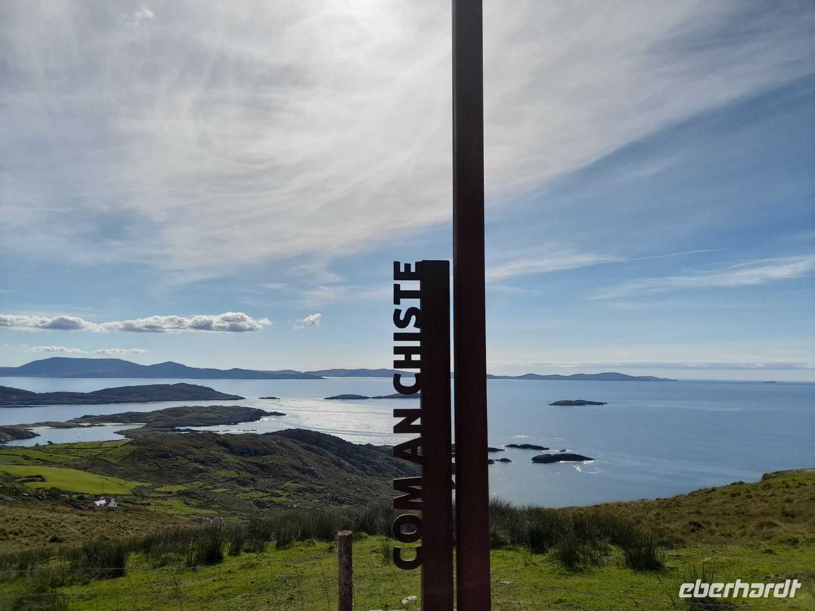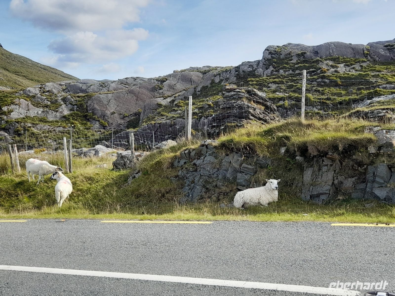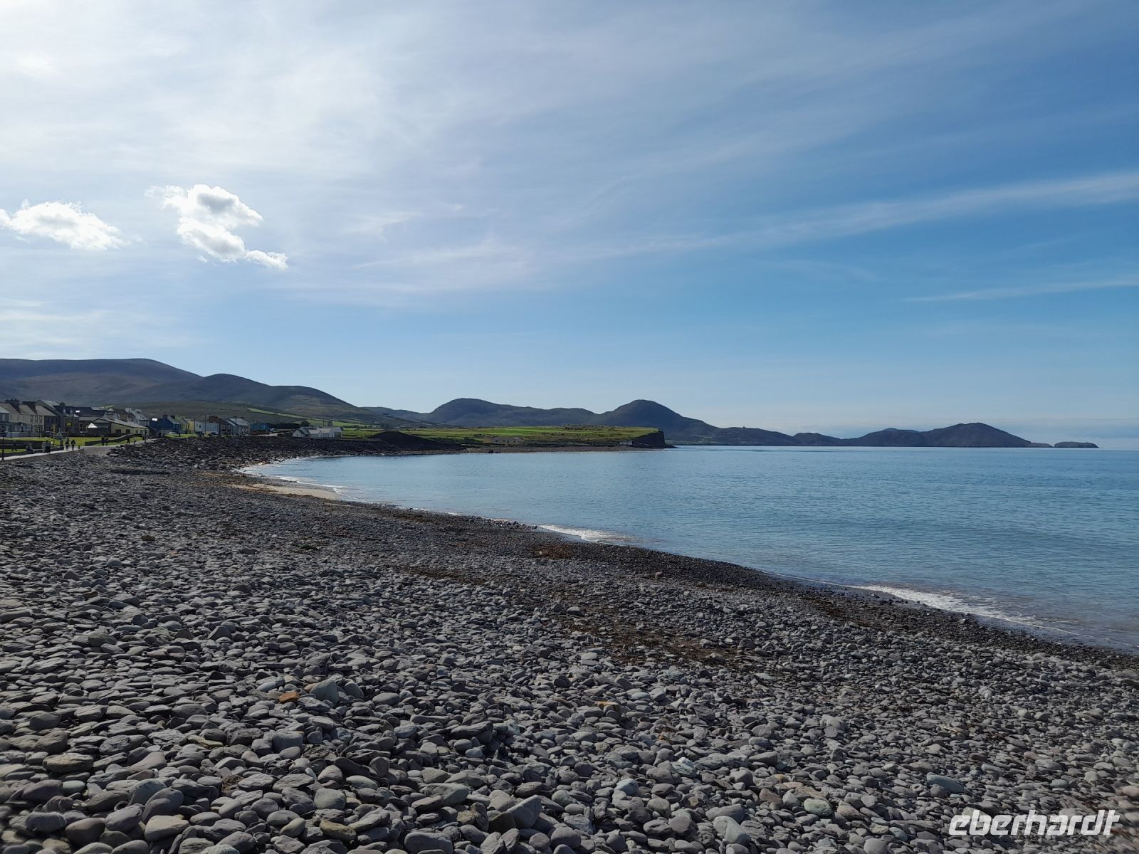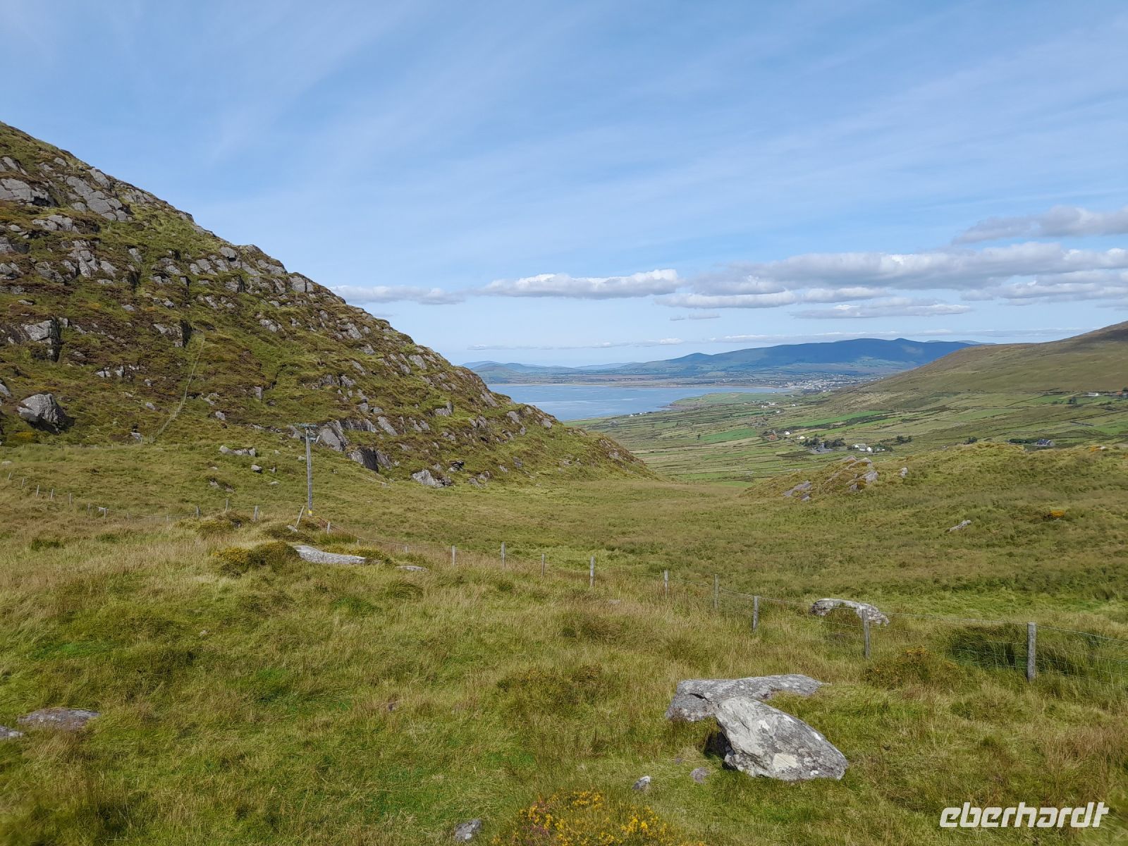Weiter geht es dann bergan zum 210 Meter hohen Coomakesta Pass. Auf dem Weg eröffnet sich der Blick auf die Skellig Michael, von oben hat man dann eine fantastisch klare Sicht auf die Ballinskelligs Bay und die Bucht des Kenmare Rivers. Was für ein Glück wir heute haben!