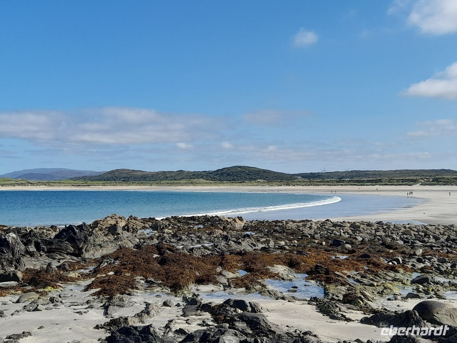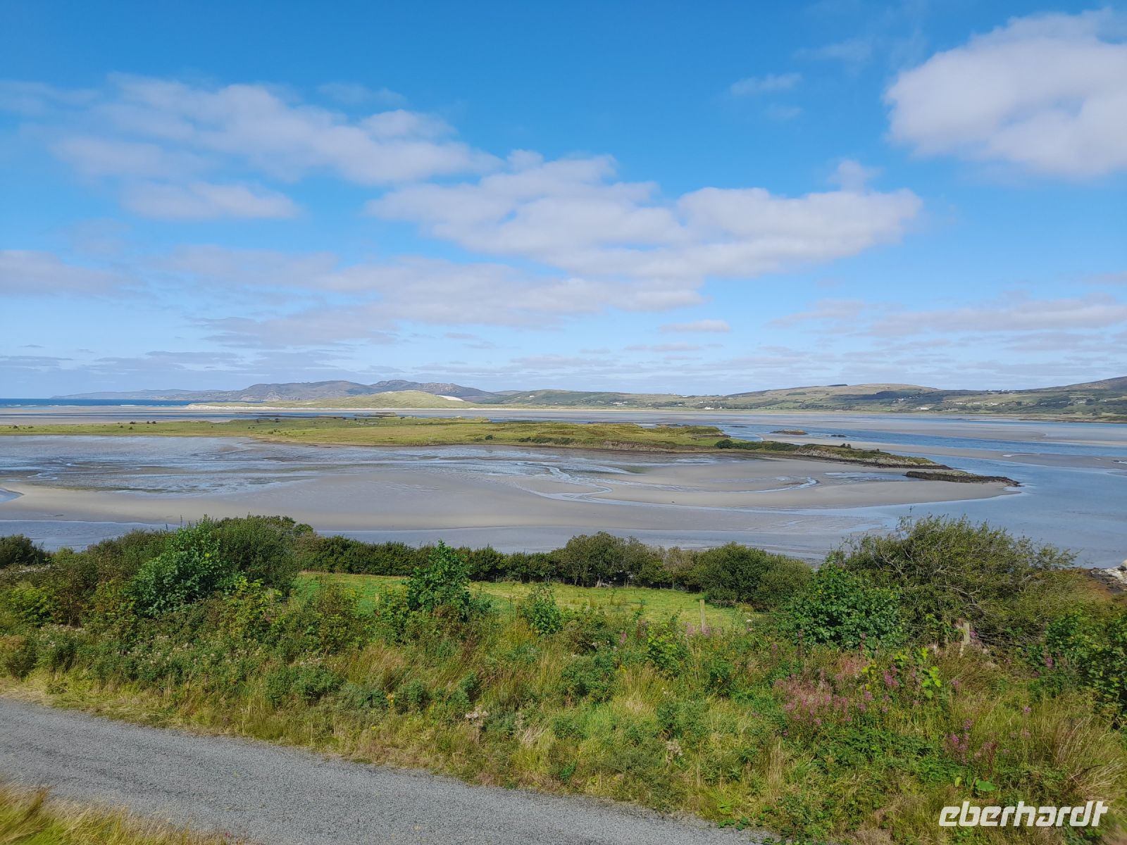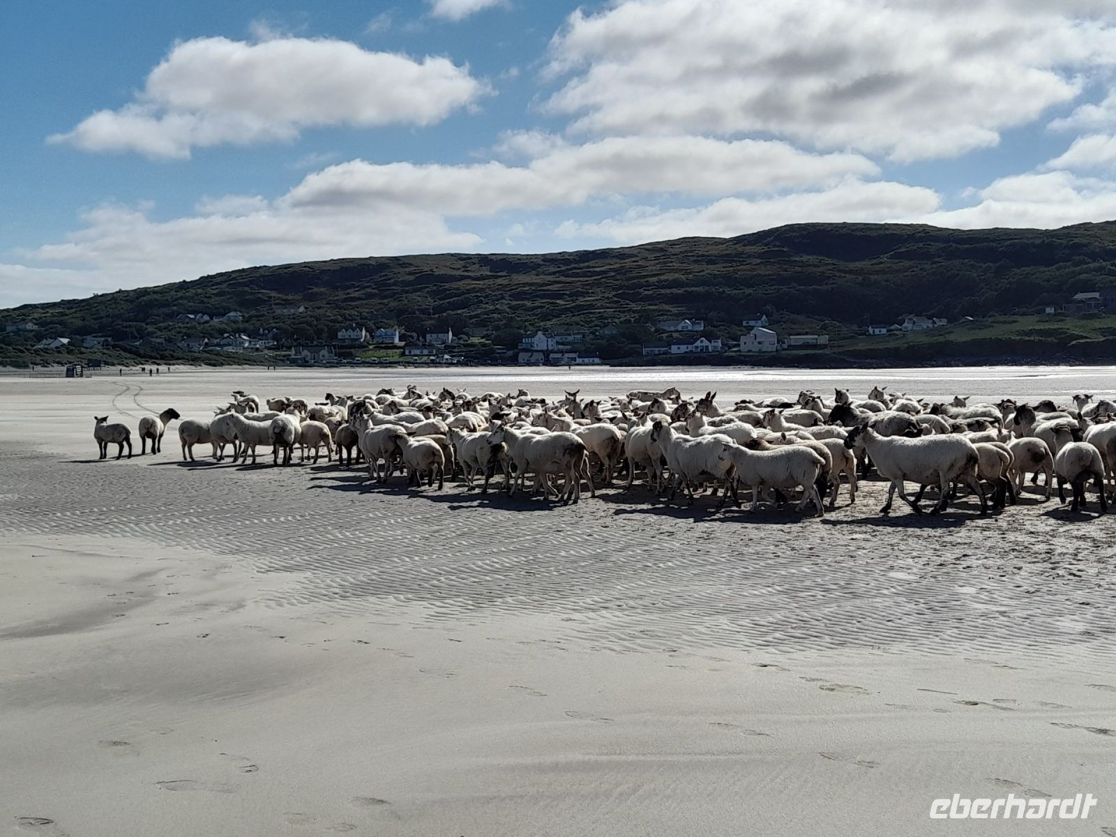 Gegen Mittag geht es dann weiter durch die wildromantische Landschaft Donegals. Bei wunderschönem Wetter legen wir mehrere Fotostopps ein bevor wir dann der Küste entlang des Wild Atlantic Ways nach Süden folgen. Am frühen Nachmittag erreichen wir dann das Örtchen An Fhearthainn oder englisch Narin, das einen der schönsten Sandstrände Donegals aufweisen kann. Im Sonnenschein spazieren wir über den Strand bis hinaus zur Insel Inishkeel, die bei Niedrigwasser zu Fuß erreicht werden kann. Wir werden dann auch noch unverhofft Zeugen eines sehr typischen Spektakels: ein Schäfer treibt zusammen mit seinem Bordercollie und mehreren Helfern seine Schafherde über den Strand und verlädt sie in einen viel zu klein erscheinenden Anhänger.