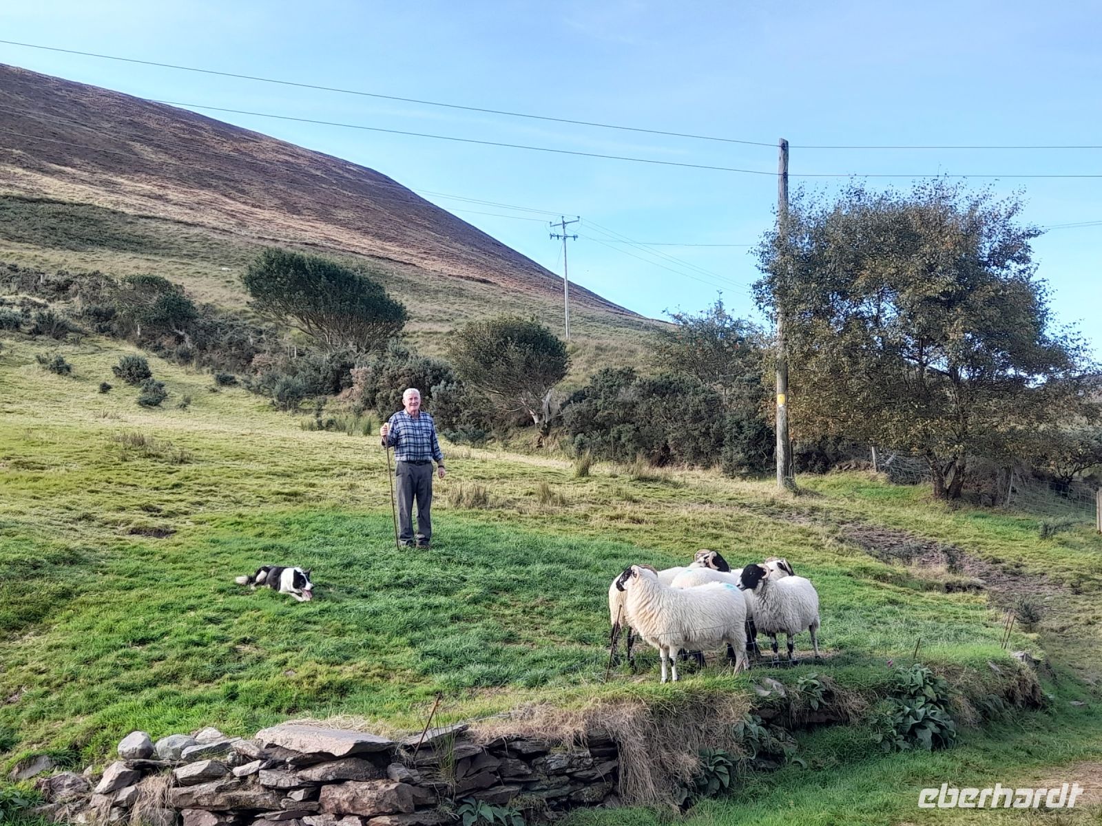 Ein paar Kilometer weiter haben wir dann die Möglichkeit uns von der Lokalprominenz, Schäfer Brandon Ferries, einen Einblick in dessen Beruf geben zu lassen – immerhin gibt es über acht Millionen Schafe in Irland. Zunächst stellt er uns verschiedene Schafrassen vor. Im Anschluss demonstriert er uns dann die Arbeit mit seinen beiden Bordercollies, die ihm dabei helfen, die Schafherde zusammenzutreiben und zu lenken. Das Schauspiel ist wirklich beeindruckend.