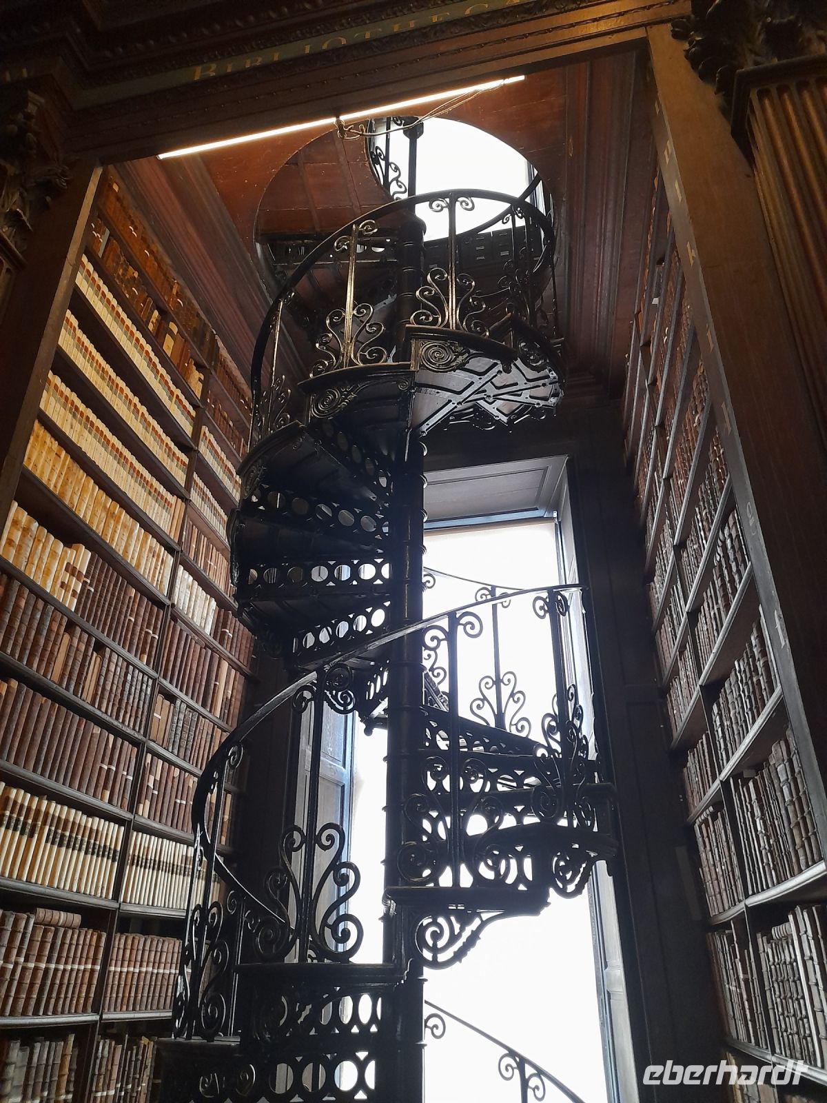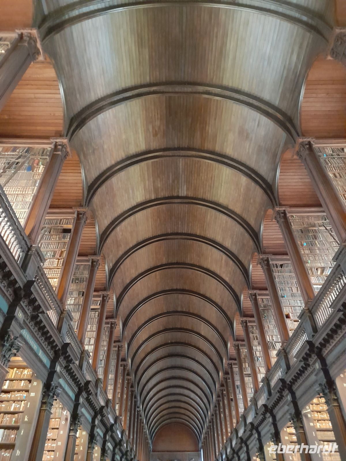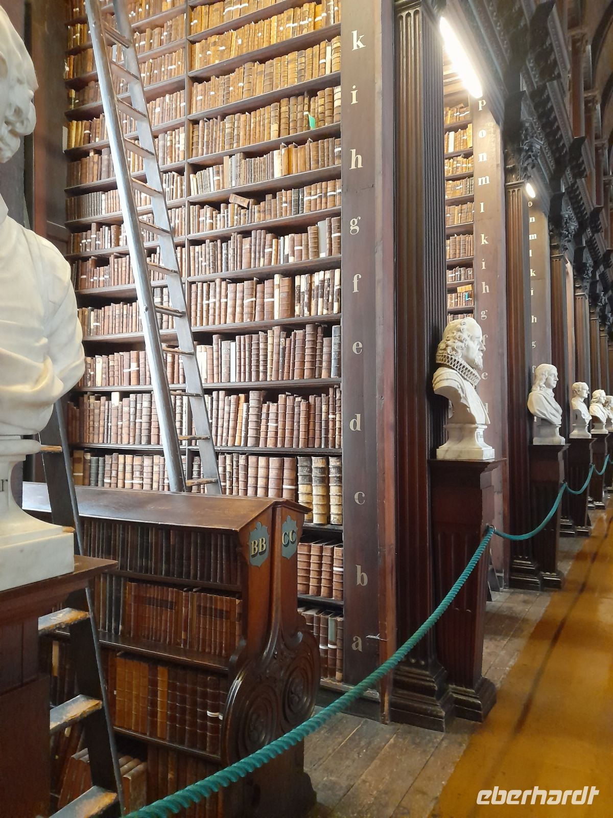 Auf dem Weg sehen wir die erste Fußgängerbrücke der Stadt die Ha'Penny Bridge, die hinüber zum Kulturviertel Temple Bar führt - doch das verschieben wir auf heute Abend. Weiter geht es Richtung O'Connell Street und vorbei am Garden of Rememberance. Das neue Geschäftsviertel Dublins erstreckt sich in die Docklands, das alte Hafenviertel, und beheimatet viele internationale Firmensitze. In direkter Nachbarschaft kann man jedoch immer noch die berühmten bunt gestrichenen "Dublin Doors" finden. Hier in Dublin stehen die gregorianischen Häuser des beginnenden 19. Jahrhunderts dicht an dicht mit modernen Glasfassaden, denn im zweiten Weltkrieg blieb Irland neutral und somit vor Zerstörung verschont. Ein Highlight ist natürlich die St. Patricks Kathedrale, die trotz der großen Anzahl der Katholiken im Land bis heute protestantisch geblieben ist. Dann geht es noch einmal in die Innenstadt: zwischen Grafton Street und Trinity College ist es Zeit, den Bus zu verlassen und über Mittag die Stadt auf eigene Faust zu erkunden. Einige aus der Gruppe haben sich zu einem Besuch der Bibliothek des Trinity Colleges entschieden, um dort die berühmte frühchristliche Handschrift des Book of Kells zu sehen.