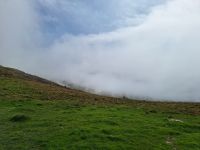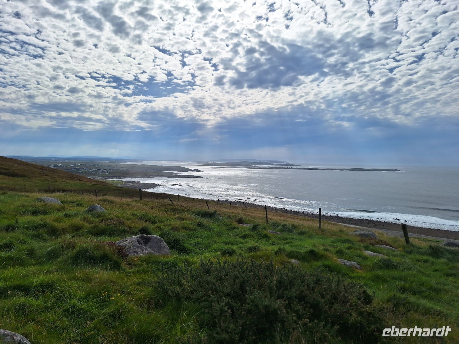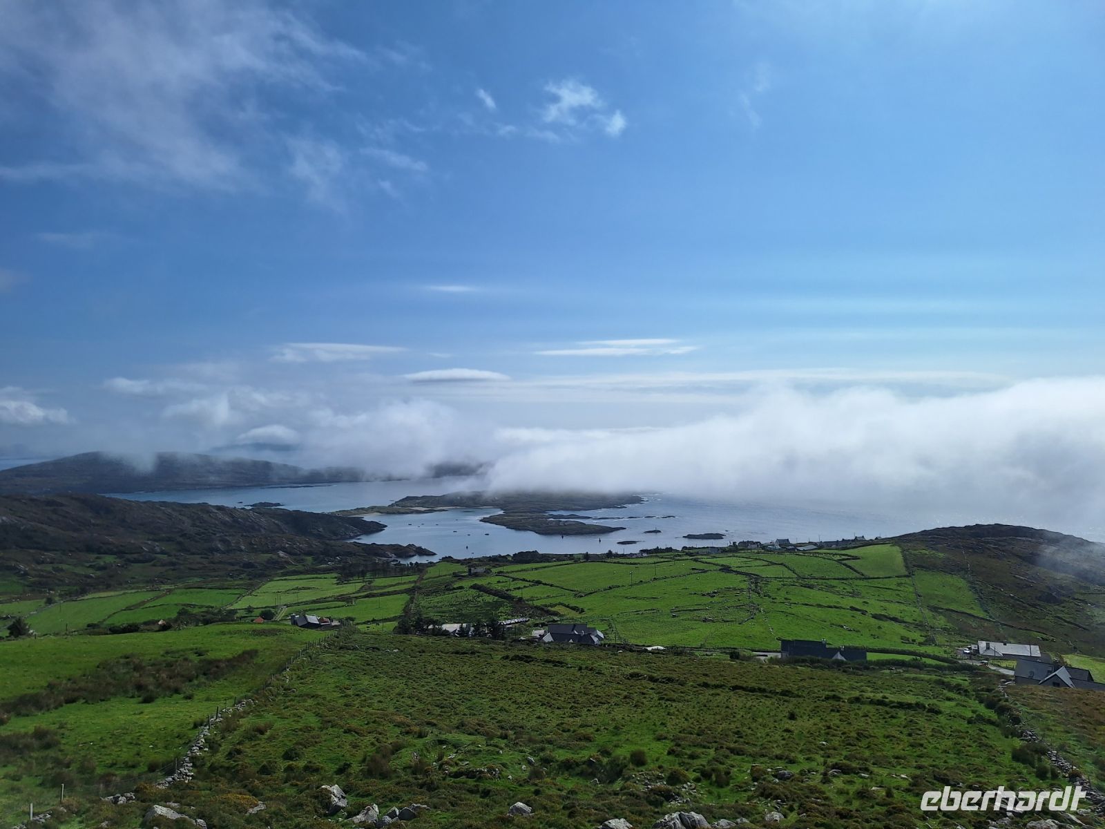 Da wir mit Jan einen sehr guten und sicheren Fahrer haben, wagen wir heute bei diesem wunderbaren Wetter einen Abstecher in Richtung des Skellig Rings. Skelligen sind kleine, felsige und unbewohnte der Küste vorgelagerte Inseln. Die bekannteste ist Skellig Michael, wo sich einst eine Einsiedelei befand, und unter anderem für die Filmreihe Star Wars gedreht wurde. Wir fahren durch das bergige Hinterland, verschrecken ein paar lokale Autofahrer und landen schließlich auf dem Skellig Ring bei Keel. Die Aussicht auf die Skelligen bleibt uns heute aufgrund von Seenebel leider verwehrt, jedoch befindet sich hier auch die Skelligs Chocolate Factory, wo wir mit einer großzügigen Verkostung begrüßt werden - wenn das mal keine gelungene Überraschung ist. Die heiße Schokolade im Anschluss passt nun auch perfekt zu den heute etwas kühleren Temperaturen. Über den kurvenreichen Skellig Ring geht es anschließend wieder für uns zurück in Richtung N70. Im einst mondänen Ort Waterville, wo viele Reiche und Prominente, unter anderem auch Charlie Chaplin, gerne ihren Urlaub verbrachten machen wir heute unsere Mittagspause. Dann geht es bergan zum 210 Meter hohen Coomakesta Pass, der höchsten Stelle des Ring of Kerry. Hier sind wir heute buchstäblich über den Wolken - ab und zu lassen sich dazwischen die Ballinskelligs Bay und die Bucht des Kenmare Rivers sehen - ein reizvoller Anblick, der sich nicht alle Tage darbietet.