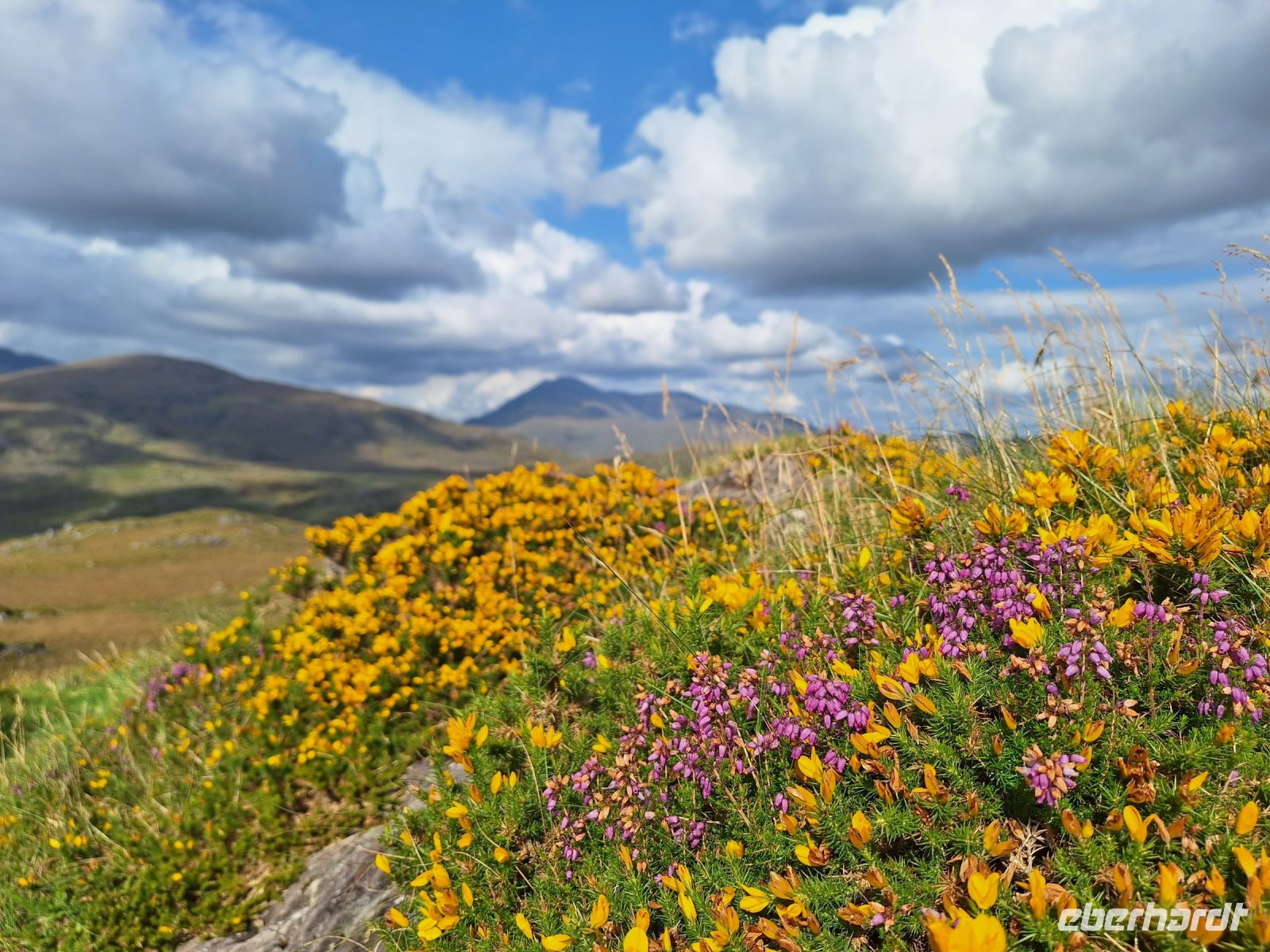 Die Region Connemara in der Grafschaft Galway ist bekannt für ihre herrliche Natur: Torfmoore, zu dieser Zeit des Jahres schon mit ersten sanften Tupfern der lila Heideblüte, und zahlreiche dunkle Seen im Süden, die bis zu 700 Meter hohen Berge „Twelve Bens“ des Connemara-Nationalparks im Norden.