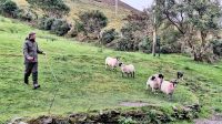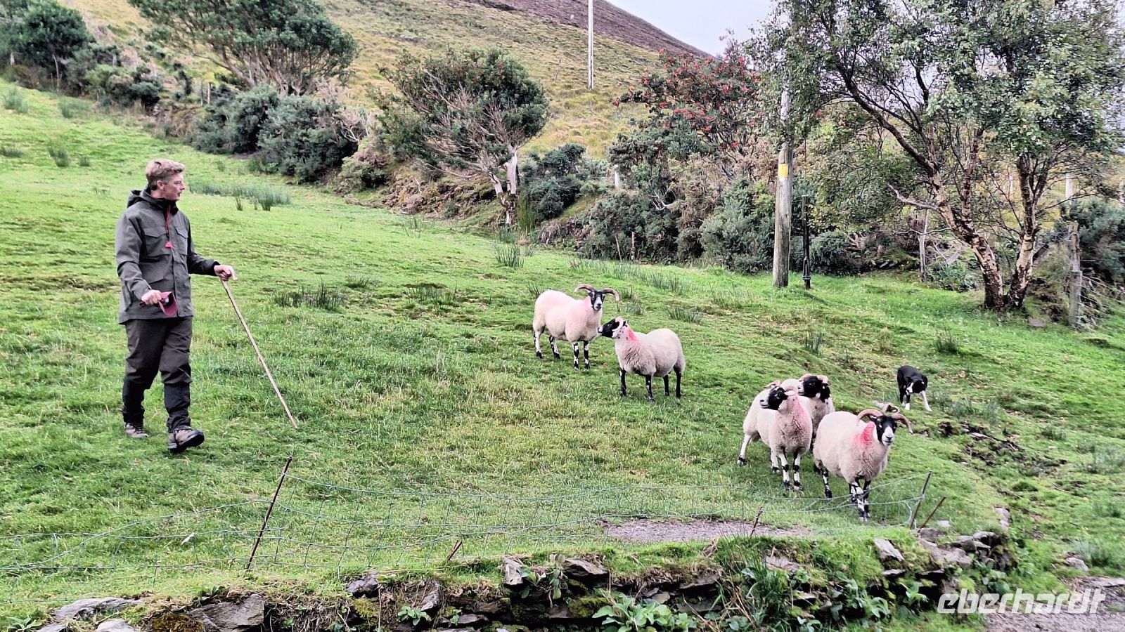 Zu unserer Erleichterung ist das Wetter heute Morgen nicht so schlecht wie zunächst befürchtet und die ersten Aussichten auf die Dingle Halbinsel sind vielversprechend. Bevor wir jedoch weiterfahren legen wir einen Stopp ein in Kells bei Schäfer und Hundetrainer Tom und seiner Frau Mairead, die uns einen Einblick in ihr Berufsleben geben werden - immerhin gibt es über 8 Millionen Schafe in Irland und ohne Hunde wäre die Arbeit im unwegsamen Berggelände gar nicht zu bewältigen. Tom stellt er uns seine Bordercollies vor und demonstriert uns dann wie er mit ihrer Hilfe die Schafherde zusammenzutreiben und lenken kann. Das Schauspiel ist wirklich beeindruckend und Hündin Tess erstaunt uns mit ihrer Gabe, selbst das sturste Schaf zur Raison zu bringen.