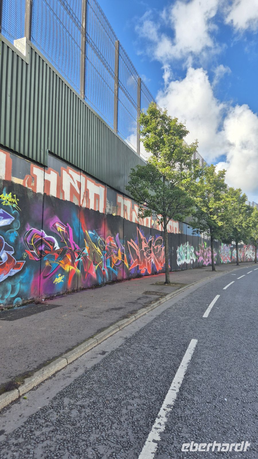 Weiter geht es im Anschluss durch die berühmte Shankill Road, die von den Loyalisten genutzt wird um ihre Gesinnung in Wandgemälden zu manifestieren. Neben dem riesigen Portrait, das zum Thronjubliäum Königin Elizabeth II. angefertigt worden ist, prangt nun an der Hauswand auf der benachbarten Straßenseite auch ein neues Bildnis König Charles III.