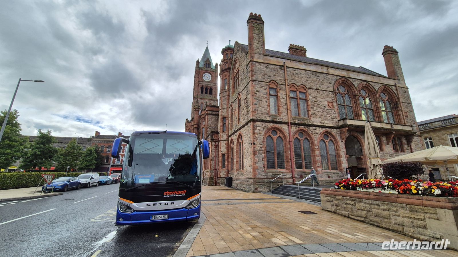 Noch heute zeugen Friedensmauern im katholischen Viertel Bogside von der jüngsten Geschichte der Stadt. Interessant ist allerdings auch die Altstadt Derrys mit der größten anglikanischen Kathedrale Irlands, St. Kolumban und der im 17. Jahrhundert errichteten und fast vollständig erhaltenen 1,6 Kilometer langen Stadtmauer. Nach einer kleinen Rundfahrt und bleibt noch Zeit für einen Spaziergang und den Besuch im der im frühen 20. Jahrhundert wiederaufgebauten Guildhall, die heute als Ausstellungsraum und Rathaus fungiert.