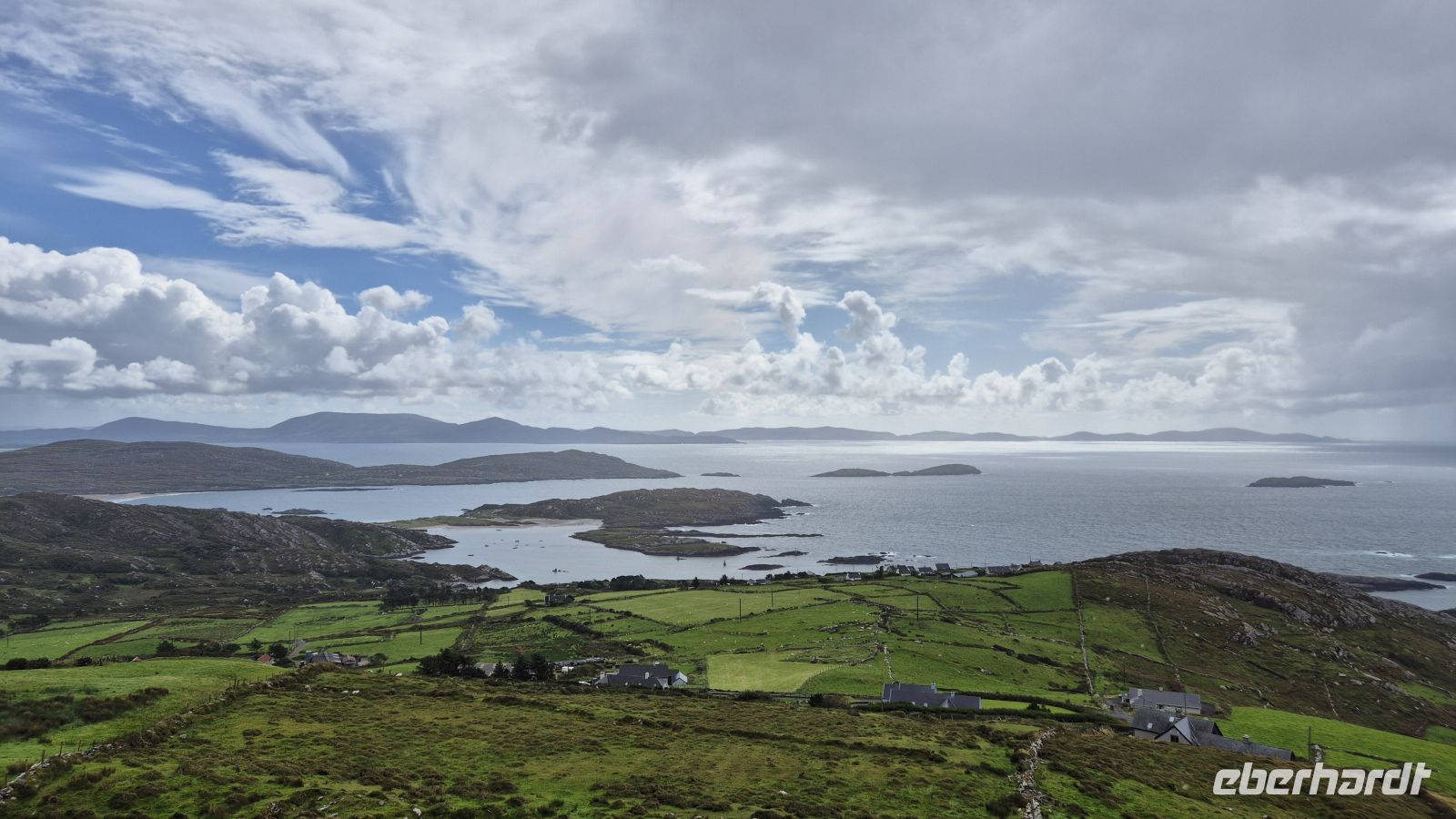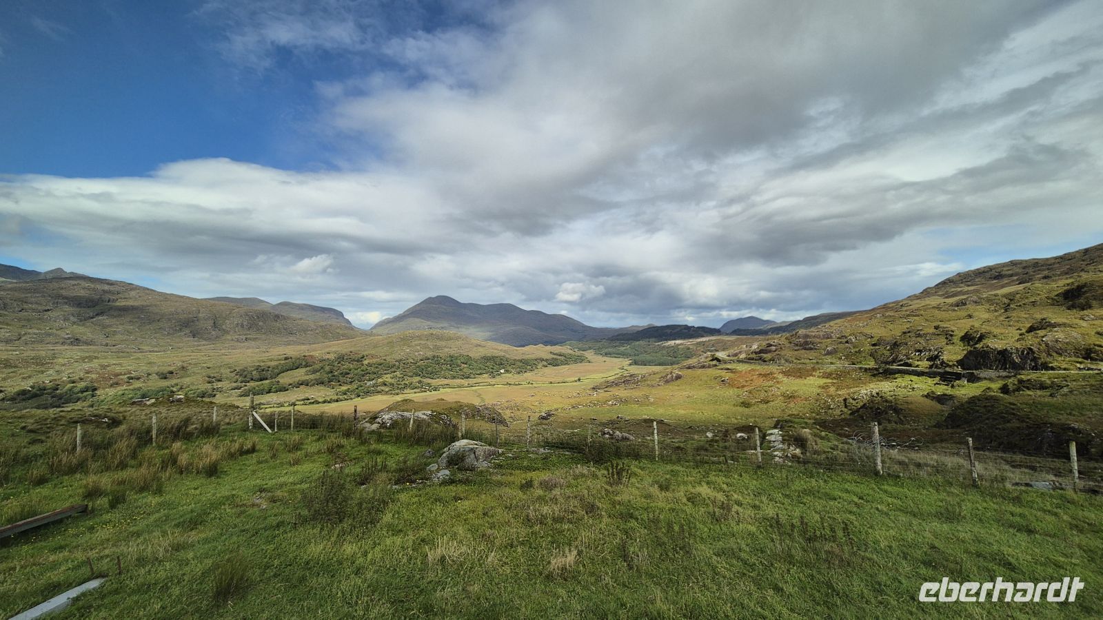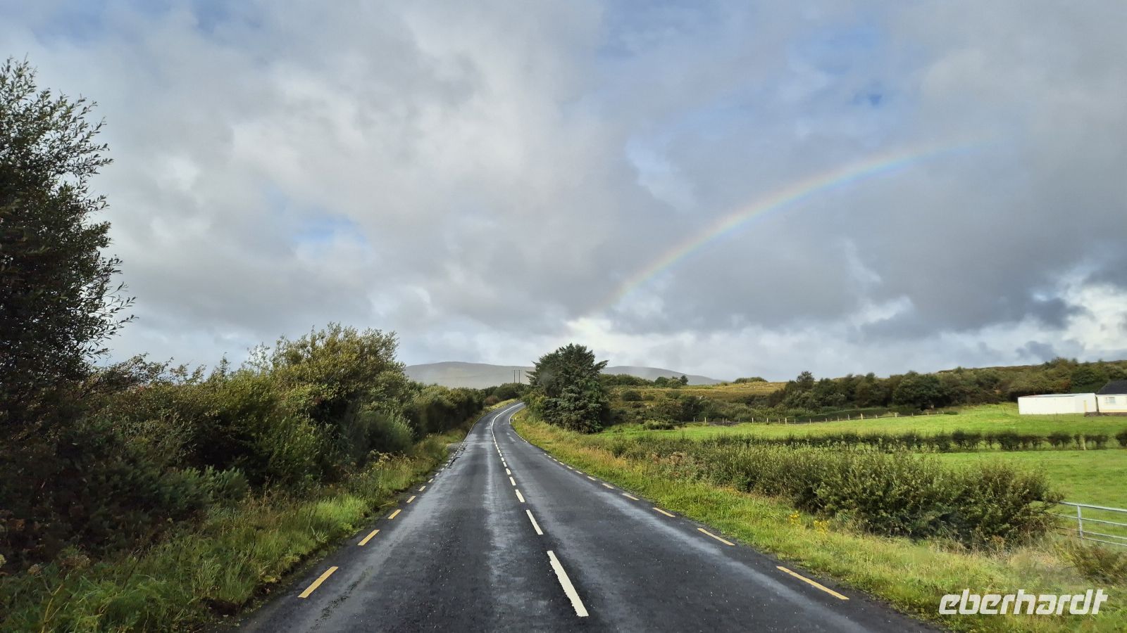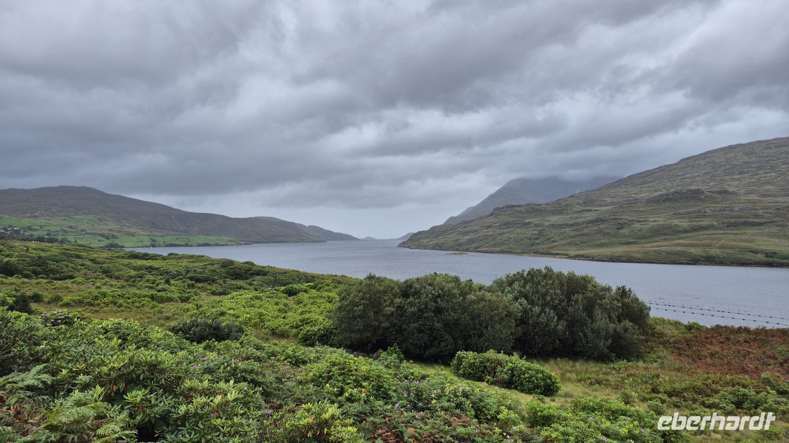 Über den kurvenreichen Skellig Ring geht es anschließend wieder für uns zurück in Richtung N70. Wir passieren den Ort Waterville, wo viele Reiche und Prominente, unter anderem auch Charlie Chaplin, gerne ihren Urlaub verbrachten und immer noch verbringen. Wir legen hier unsere Mittagspause ein, dann geht es bergan zum 210 Meter hohen Coomakesta Pass, der höchsten Stelle des Ring of Kerry. Von hier hat man eine fantastische Sicht auf die Ballinskelligs Bay und die Bucht des Kenmare Rivers. Ein kleiner Regenschauer ereilt uns hier ist aber auch genauso schnell wieder vorbei.