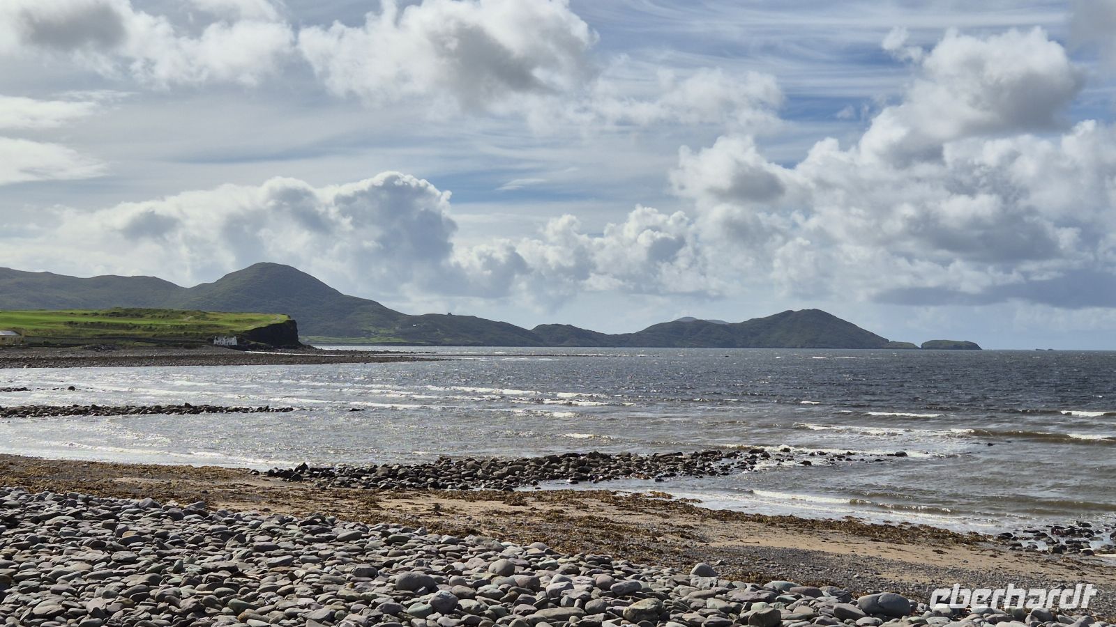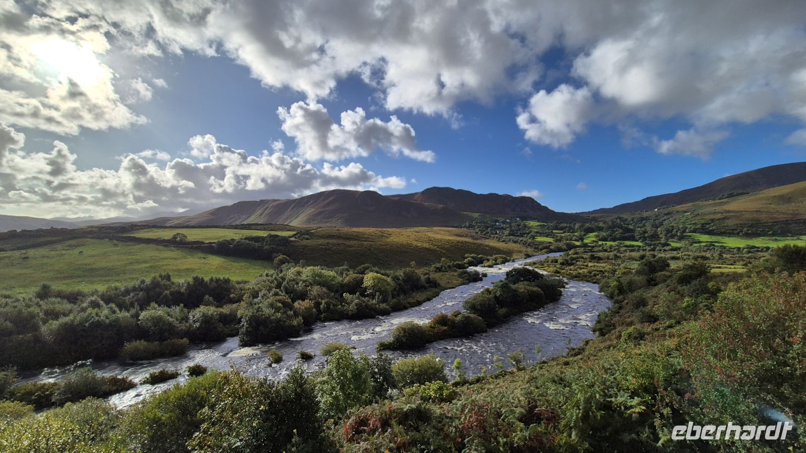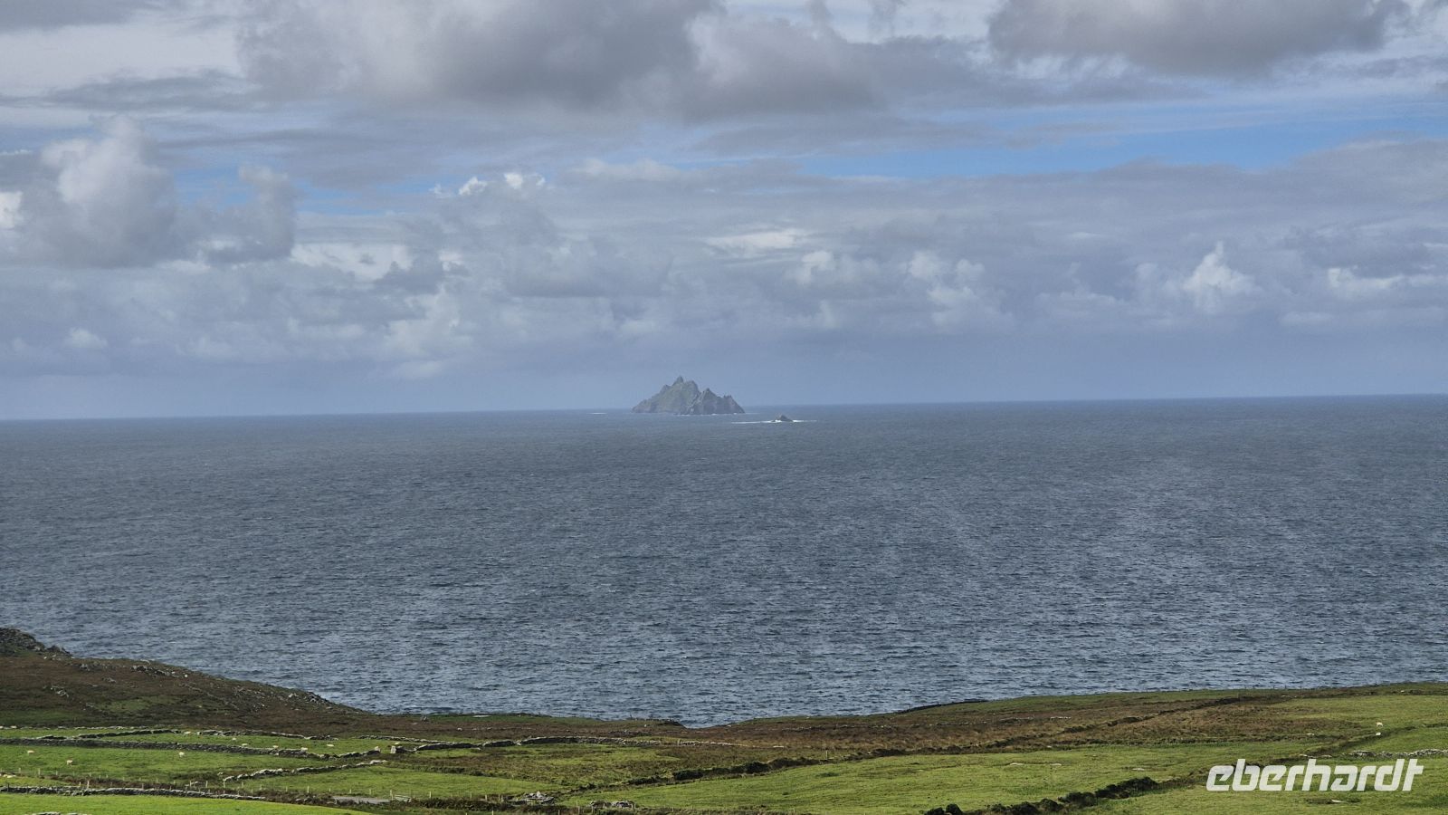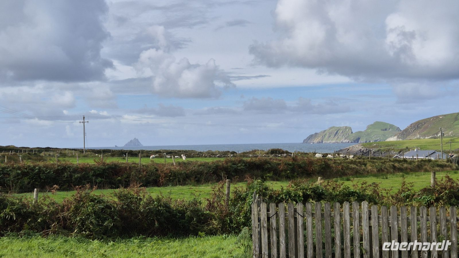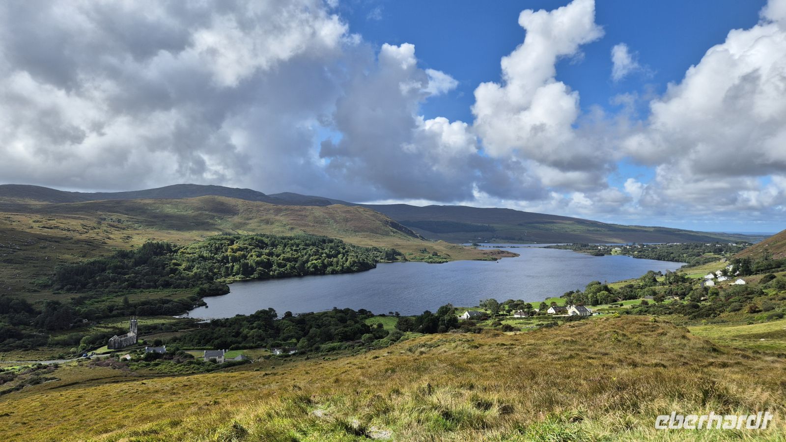 Über den kurvenreichen Skellig Ring geht es anschließend wieder für uns zurück in Richtung N70. Wir passieren den Ort Waterville, wo viele Reiche und Prominente, unter anderem auch Charlie Chaplin, gerne ihren Urlaub verbrachten und immer noch verbringen. Wir legen hier unsere Mittagspause ein, dann geht es bergan zum 210 Meter hohen Coomakesta Pass, der höchsten Stelle des Ring of Kerry. Von hier hat man eine fantastische Sicht auf die Ballinskelligs Bay und die Bucht des Kenmare Rivers. Ein kleiner Regenschauer ereilt uns hier ist aber auch genauso schnell wieder vorbei.