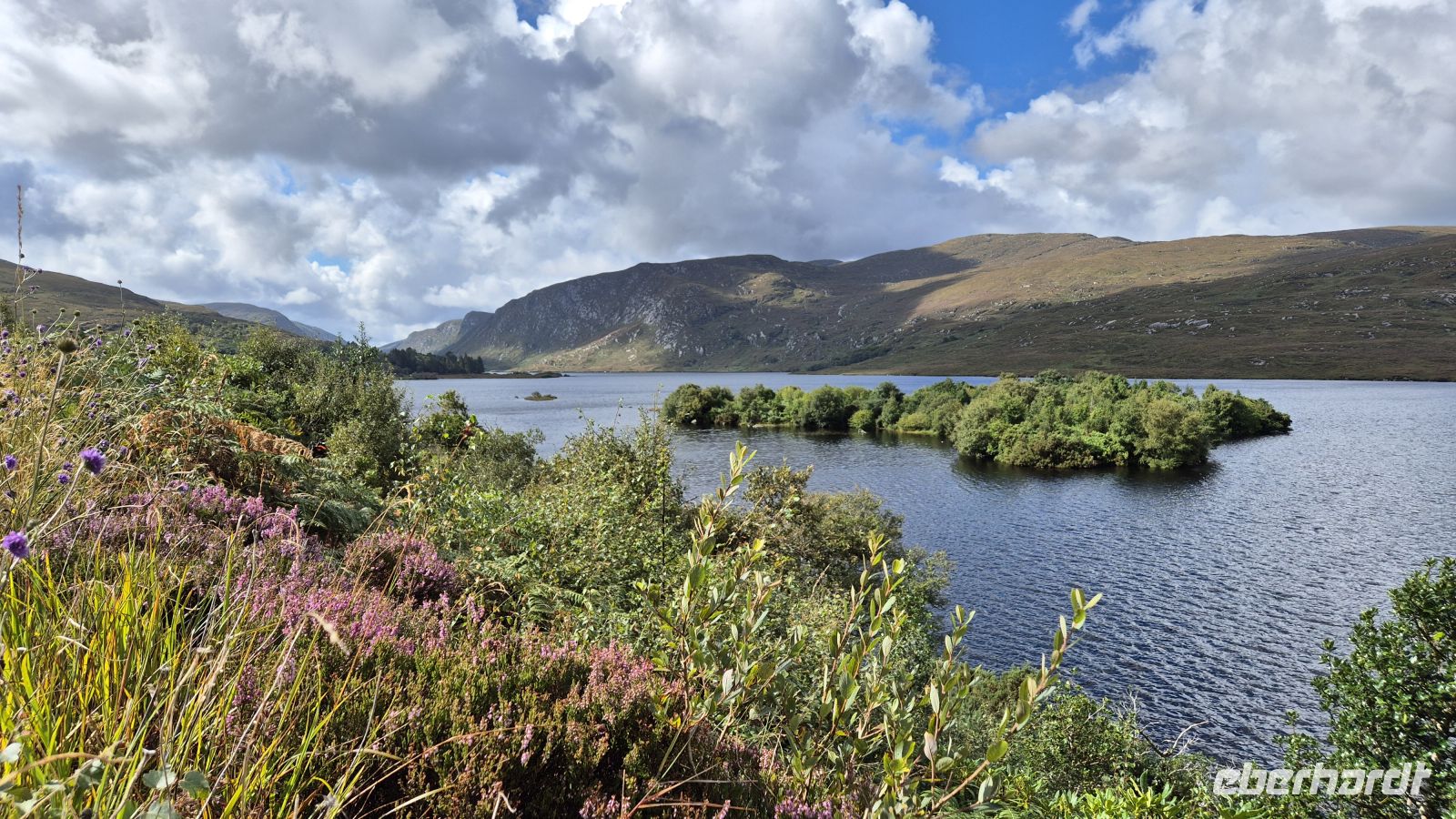 Nach einem typisch irischen Frühstück führt uns unser Weg heute morgen zunächst in den nur wenige Kilometer entfernten Glenveagh Nationalpark. Der Name leitet sich ab vom irischen „Gleann Bheatha“ und bedeutet „Tal der Birke“. Das etwa 16.000 Hektoar große Gebiet umfasst zahlreiche Seen, Schluchten und Wälder, sowie Teile der Derryveagh Mountains mit den drei höchsten Bergen der Grafschaft Donegal: Mount Errigal, Slieve Snacht und den Tafelberg Mount Muckish. Im Nationalpark wurde in den 2000er Jahren der Steinadler erfolgreich wieder eingegliedert. Ansonsten beherbergt er eine der größten Rotwild-Herden Irlands.