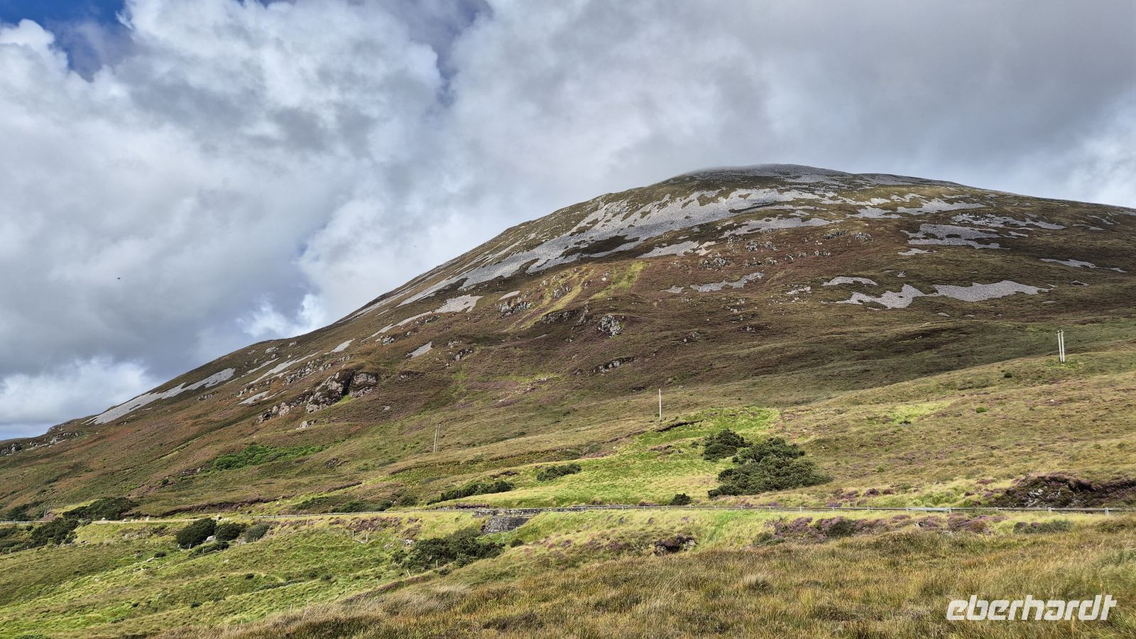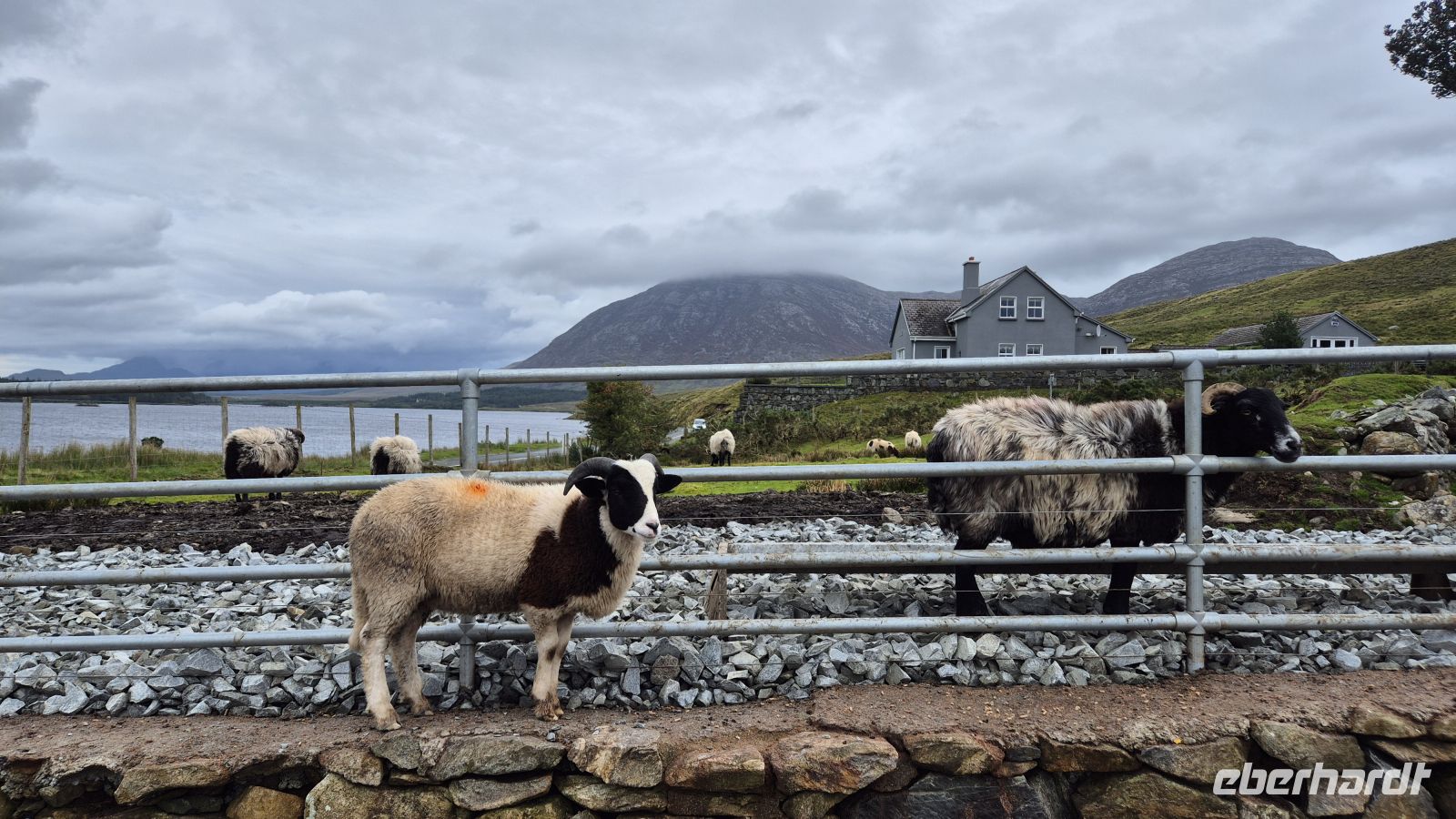 Im Inagh Tal legen wir einen ausgedehnten Fotostopp ein. Hier treffen wir neben den typischen Scottish Blackface Schafen auch auf eine ganz besondere Rasse: die Jakobs-Schafe. Sie sind die wohl ältesten Schafrasse der Welt, wurden schon in der Bibel erwähnt und tragen zwischen einem und sechs Hörner auf ihren Köpfen - ein lustiger Anblick, vor allem weil die Tiere auch recht gefräßig sind und regelrecht darum betteln gefüttert zu werden.