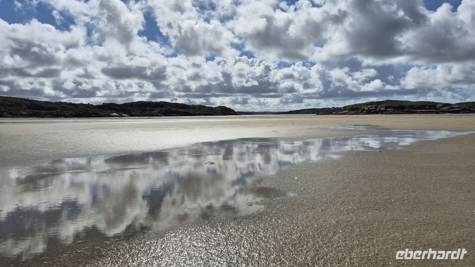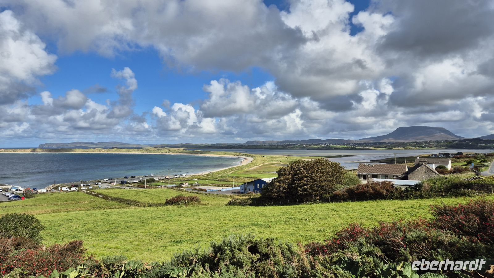 Gegen Mittag geht es dann weiter durch die wildromantische Landschaft Donegals. Wir durchqueren die Derryveagh Mountains und mit herrlichem Blick auf den höchsten Berg Donegals, Mount Errigal, und ins gegenüberliegende Tal, legen wir einen kleinen Stopp ein. An der Küste angekommen folgen wir dem Wild Atlantic Ways ein Stückchen nach Norden und legen eine Pause ein am malerischen Strand von Bunbeg. Ein großes Staunen geht durch den Bus - wer würde so einen herrlichen Sandstrand an der Nordküste Irlands erwarten?