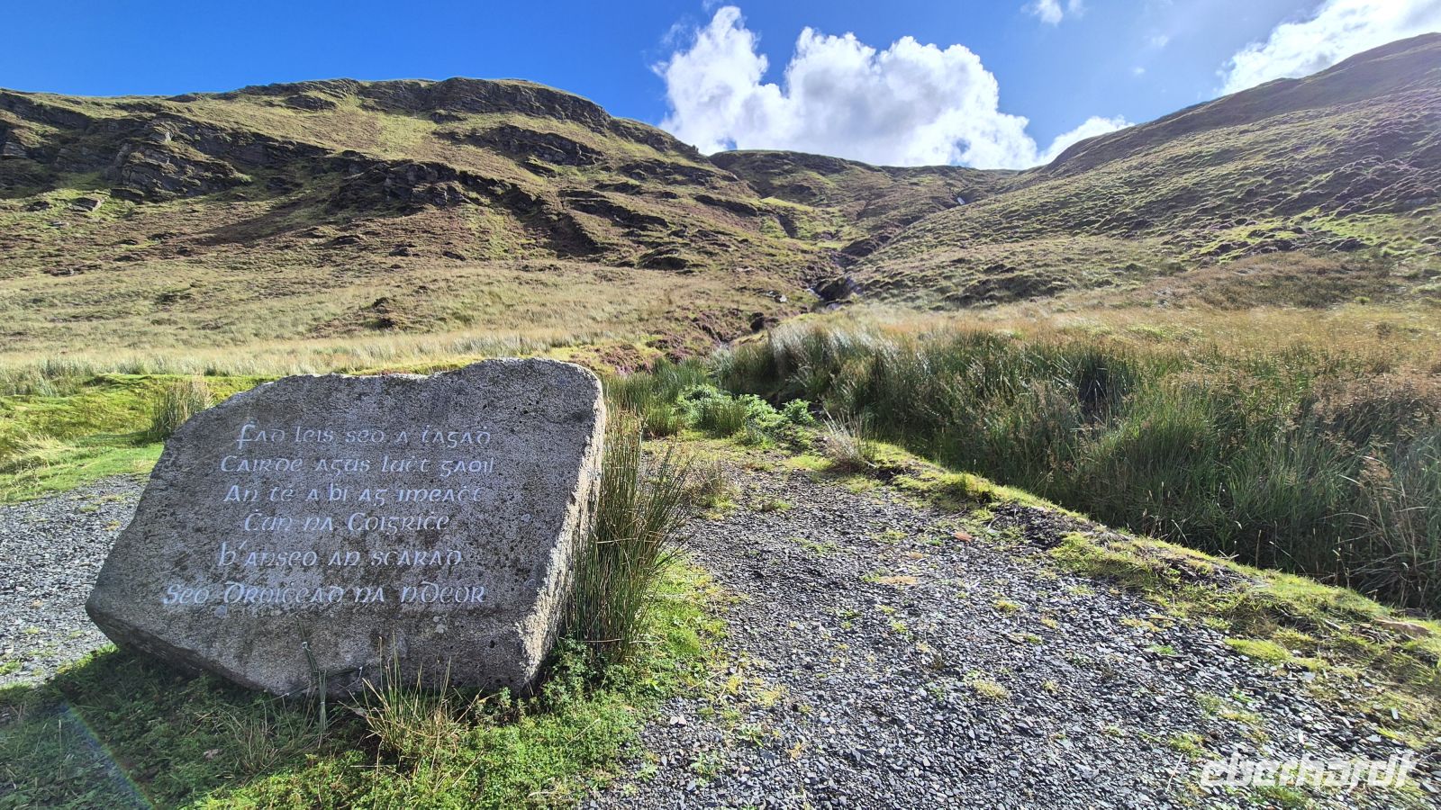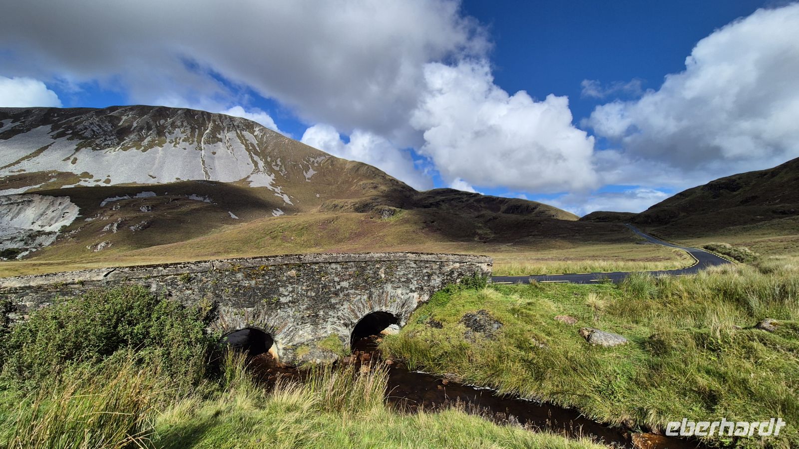 Wir folgen dann weiter dem Wild Atlantic Way, genießen den Blick auf die vorgelagerten Tory Islands und die wunderschöne Küstenlandschaft der Bloody Forelands. Schließlich durchqueren wir die Berge noch einmal und folgen der Muckish Gap von Falcarragh nach Letterkenny. Hier treffen wir nicht nur auf Schafherden auf der Straße, sondern auch auf eine alte Brücke, die als "Bridge of Tears" oder "Bridge of Sorrow" bekannt ist. Bis hierher begleiteten Familie und Freunde ihre meist jungen Angehörigen, die auf dem Weg nach Derry waren, um dort ein Schiff in Richtung Amerika zu besteigen - in der Hoffnung auf ein besseres Leben und der Gewissheit, dass man sich höchstwahrscheinlich nie mehr wiedersehen würde.