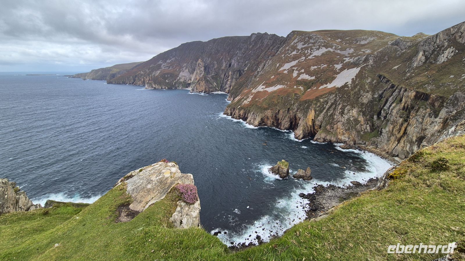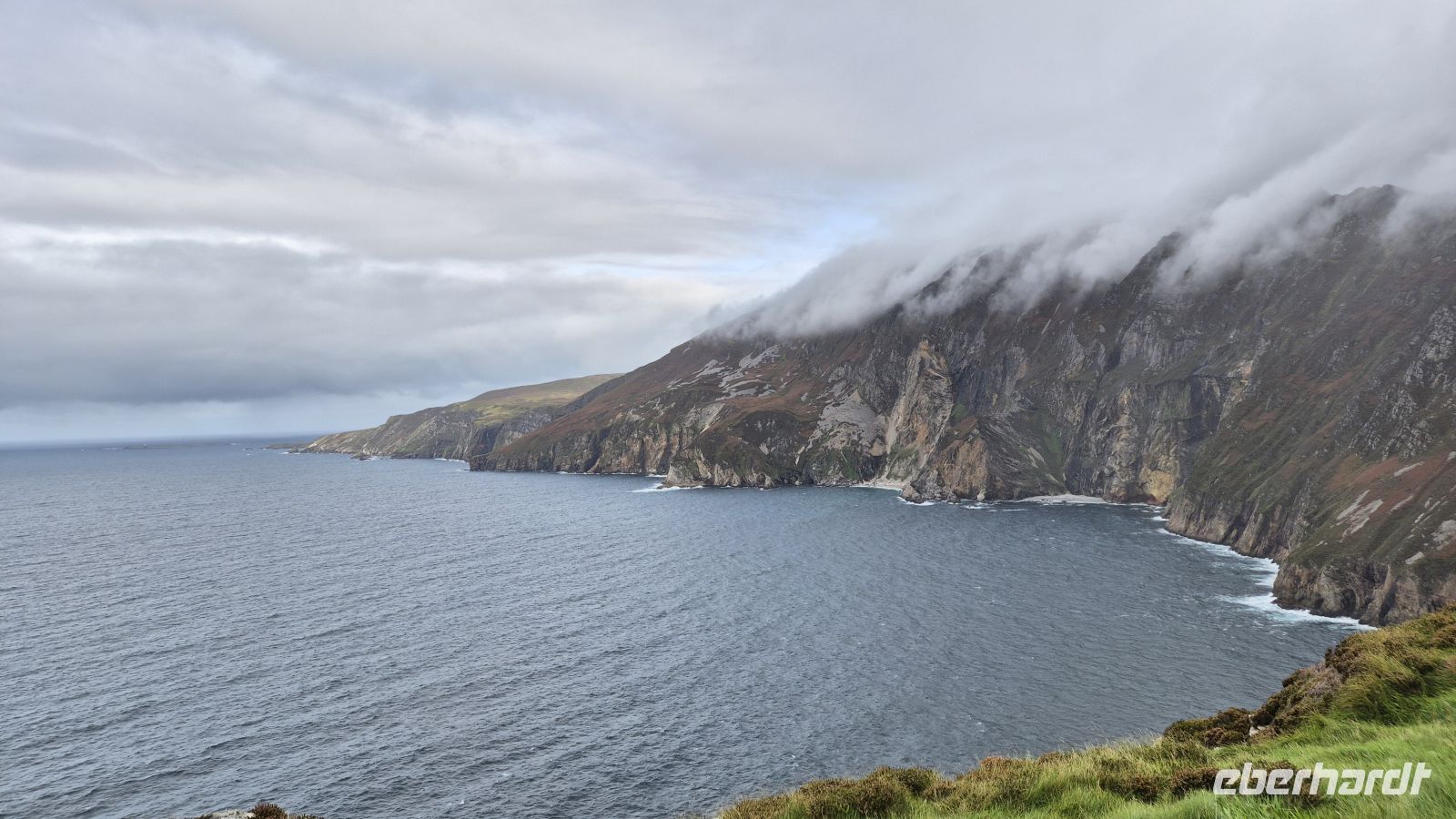 Hier treffen wir wieder auf den Wild Atlantic Way, und fahren in die Crocknamurrin Mountains. Wir überqueren den 272 Meter hohen Glengesh Pass, der mit zahlreichen Legenden belegt ist. Feen, die hier gelebt haben, sollen Menschen mit Bannen oder auf irisch „gesh“ belegt haben, wenn diese sich nicht an gewisse Regeln hielten und Tabus brachen. So wurde auch der legendäre Held Cúchullain mit zwei Bannen belegt, die einander widersprachen. Weil er sich nur an einen von den beiden halten konnte, wurde er zum Tode verurteilt. Uns bleibt dieses Schicksal glücklicherweise erspart, nur leider gibt sich das irische Wetter ausgerechnet hier recht mystisch, sodass die Aussicht leider nicht ganz ideal ist. Wir lassen uns jedoch nicht entmutigen, schließlich aber wir noch etwas anderes, noch Spektakuläreres, vor.