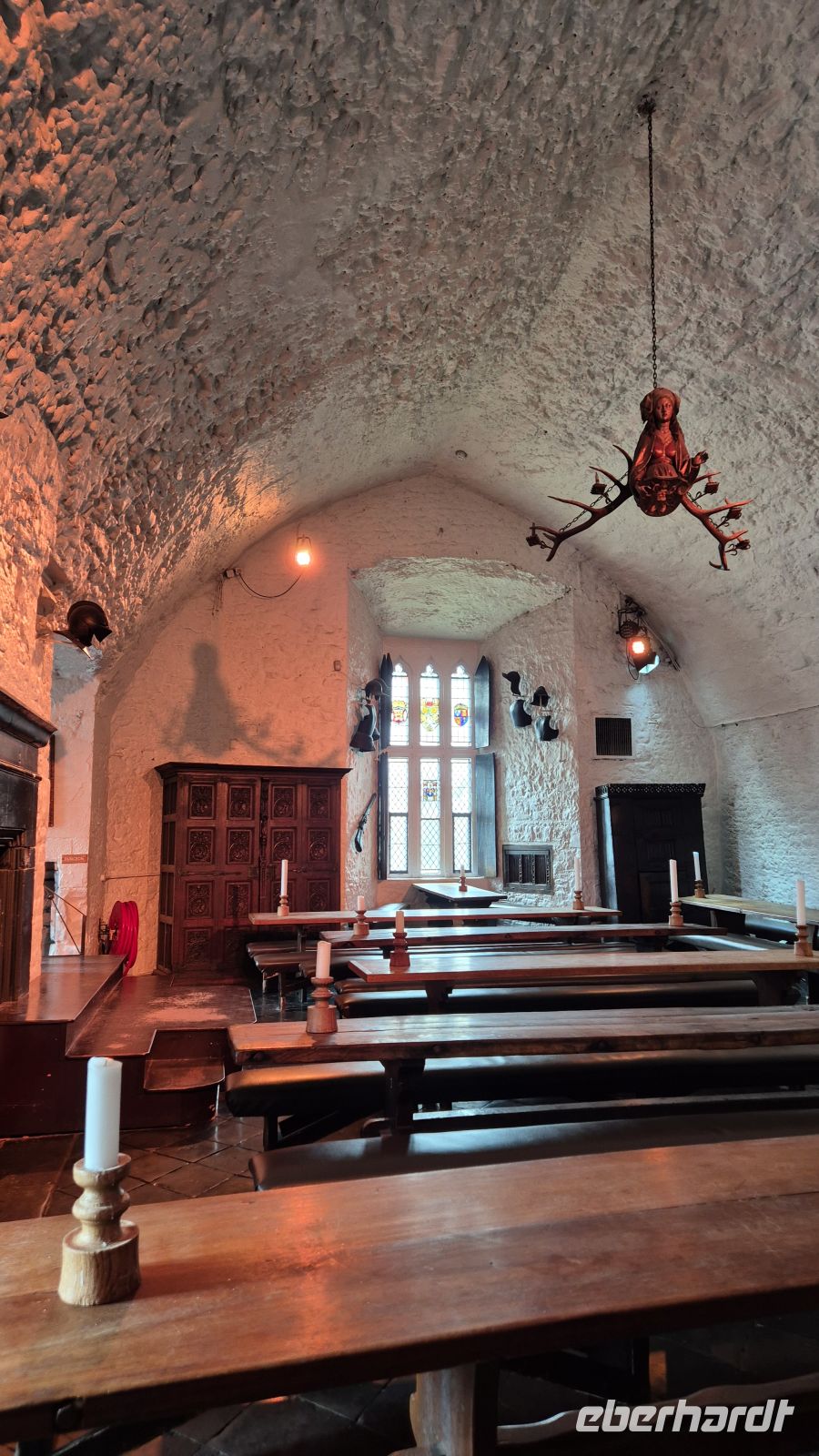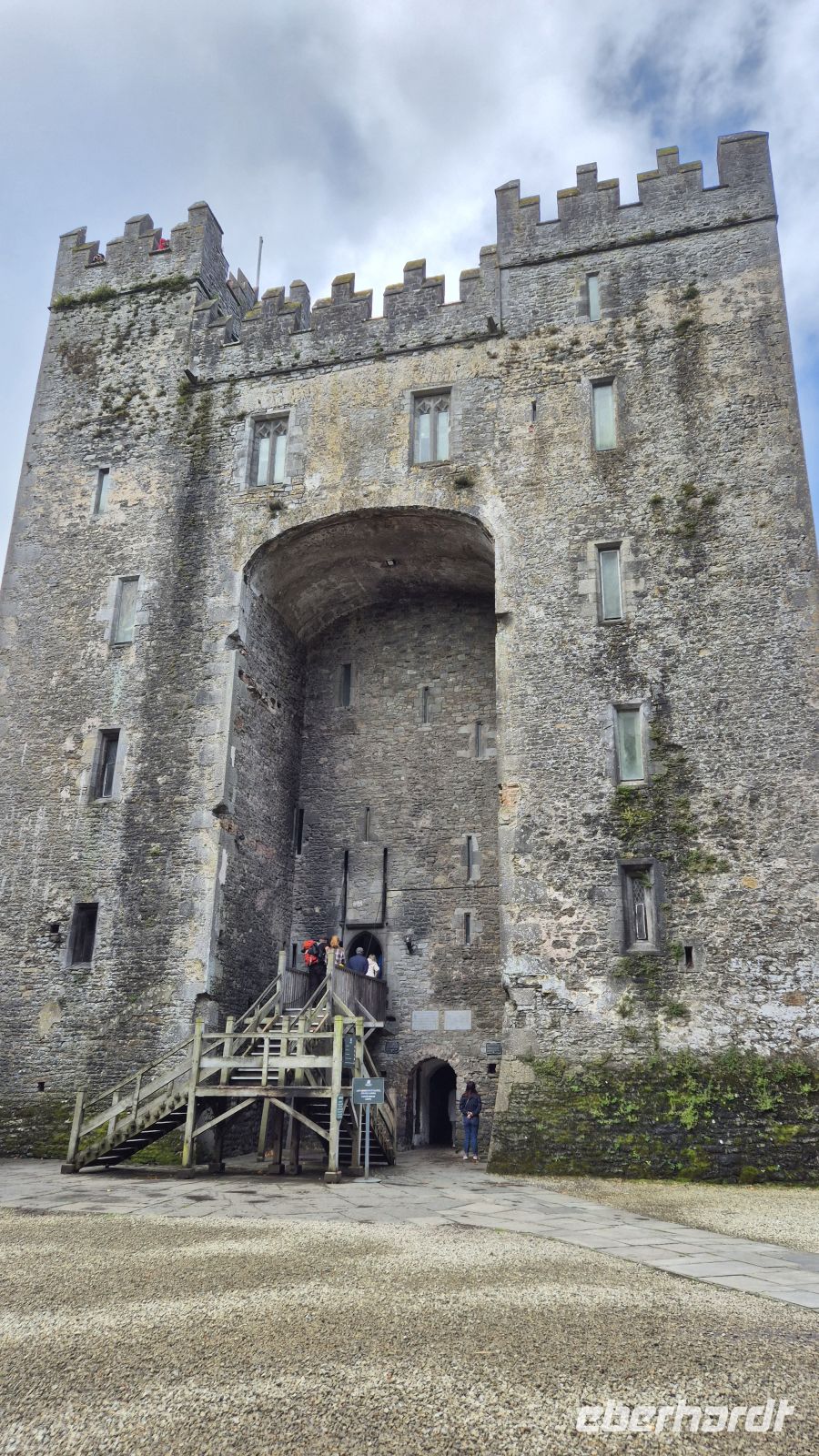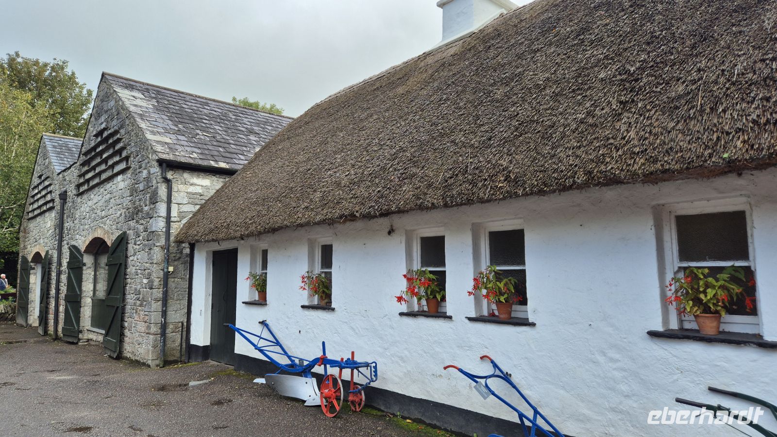 Heute erwarten uns wieder einmal einige Highlights, auf die man sich freuen kann. Mit unserem Bus verlassen wir heute Oranmore in Richtung der Bucht von Galway und fahren dann entlang der Küste nach Süden. Nach kurzer Fahrt erreichen wir das pittoreske Dunguaire Castle, ein Wohnturm aus dem 16. Jahrhundert der in einer kleinen Bucht liegt und im 19. Jahrhundert Treffpunkt eines Literatenzirkels war, zu dem auch Nationaldichter William Butler Yeats gehörte. Über enge Landstraßen, geht es dann durch die in Irland einzigartige Landschaft des Burren. Die Karstlandschaft ist durch etwa knietiefe Karren in rechteckige Felder gegliedert. Sie wurden durch Oberflächenwasser gebildet, das sich noch immer nach stärkeren Regenfällen in sogenannten Turloughs sammelt. Nach seinem Kriegszug in die Gebiete des Burrens, soll Oliver Cromwell sie wie folgt charakterisiert haben: „Kein Baum, an dem man einen Mann aufhängen, kein Tümpel, worin man ihn ersäufen, keine Erde, in der man ihn verscharren könnte.“ Nichtsdestotrotz ist die Landschaft Heimat für zahlreiche mediterrane, alpine und sogar arktische Pflanzen, die sonst nur selten in Irland vorkommen. Ebenso wie die bizarren Felsformationen im Hinterland gehören auch zerklüftete Küstenabschnitte zum Charakter des Burren. Während ein Teil davon recht flach zum Wasser hin verläuft, führt die Straße und dann plötzlich steil bergauf. Wir überqueren die etwa 300 Meter hohen Hügel der unwirklichen Landschaft und erreichen schließlich die Kleinstadt Ennis. Von hier aus ist es nicht mehr weit bis zum nördlichen Ufter des Flusses Shannon, dem längsten Fluss des Landes. Wenig später erreichen wir Bunratty Castle. Die Burg ist heute nach dem originalgetreuen Zustand aus dem 15. Jahrhundert restauriert und eingerichtet und bietet einen tollen Einblick in das Leben eines Clanoberhauptes. So glamourös wie man es sich vorstellen könnte, war auch der Alltag des Adels damals nicht. Wie hingegen das gewöhnliche Volk zum Teil noch bis ins 20. Jahrhundert lebte, kann man im angegliederten Freilichtmuseum anhand zahlreicher Gebäude aus ganz Irland erfahren, die anderswo abgebaut und hier wiederaufgebaut wurden. Am heutigen Sonntag werden zu unserer Freude auch noch zahlreiche landwirtschaftliche Maschinen, sowie alte handwerkliche Berufe vorgestellt.