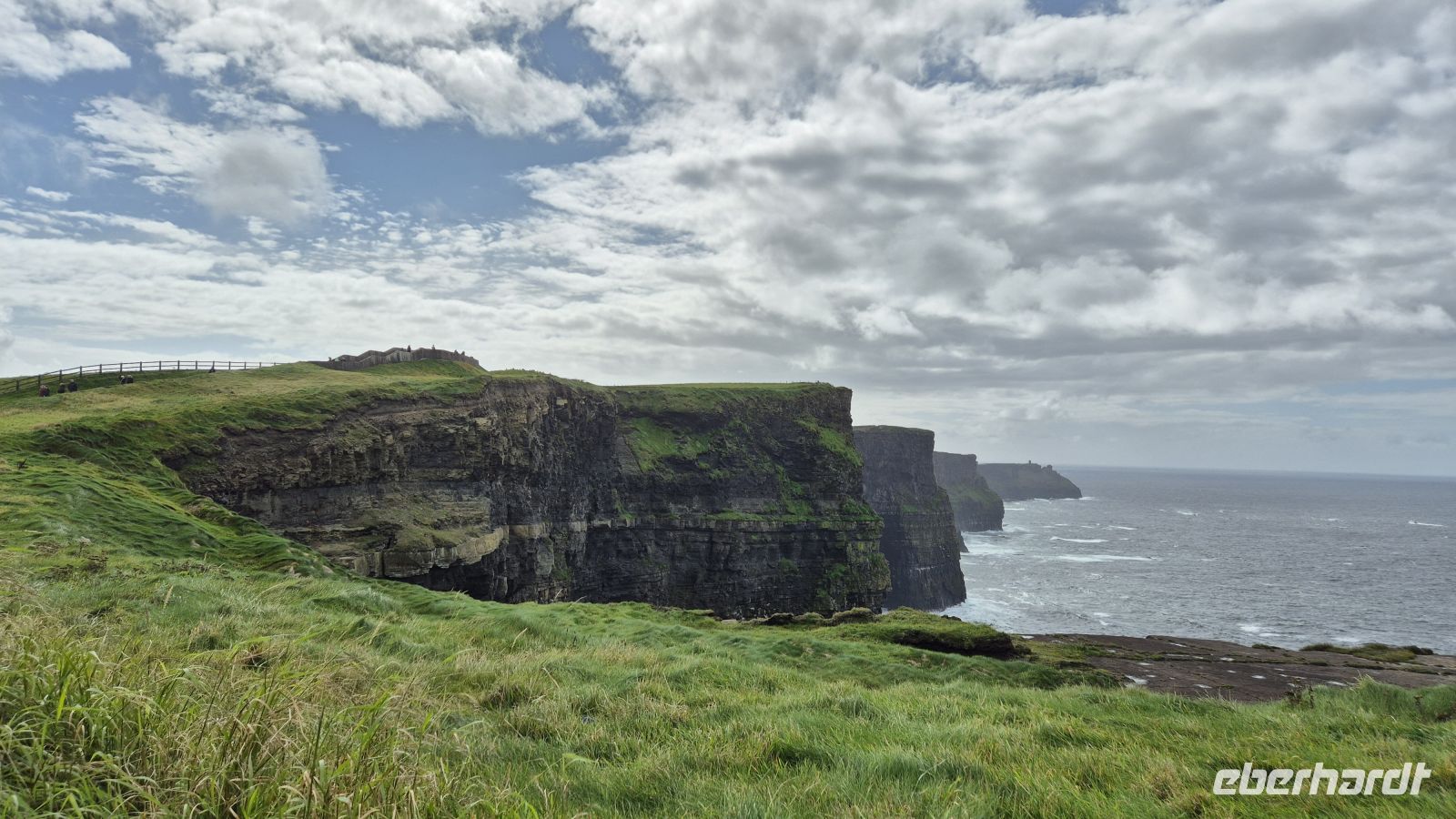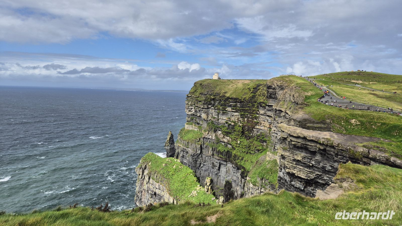 Am Nachmittag führt uns unser Weg dann zurück an die Küste. Die wohl bekanntesten Klippen Irlands erwarten uns. Die fast zehn Kilometer lange Steilklippenformation der Cliffs of Moher ragt fast senkrecht aus dem Atlantik. Am Südende, dem Hag’s Head, haben sie eine Höhe von ungefähr 120 Meter, nördlich des O’Brien’s Tower erreichen sie sogar 214 Meter. Am Kliff leben 30 Arten von Seevögeln, die bekanntesten sind die winzigen Papageientaucher, die sich in die entlegensten Ecken zurückziehen um dort zu Brüten. Wer noch ein wenig mehr Hintergrund zu Flora und Fauna, sowie zur Regionalgeschichte möchte, kann das informative Besucherzentrum besichtigen - doch das schöne Wetter heute lockt doch eher zu einem Spaziergang.