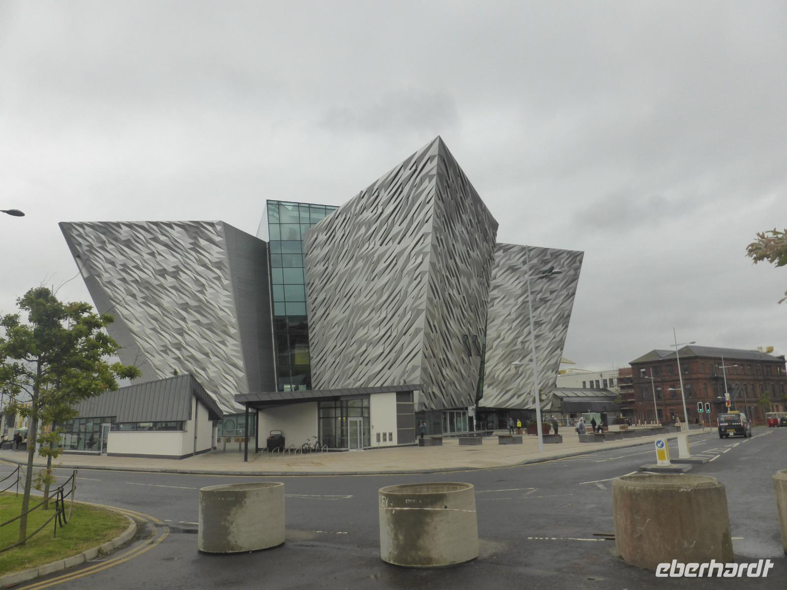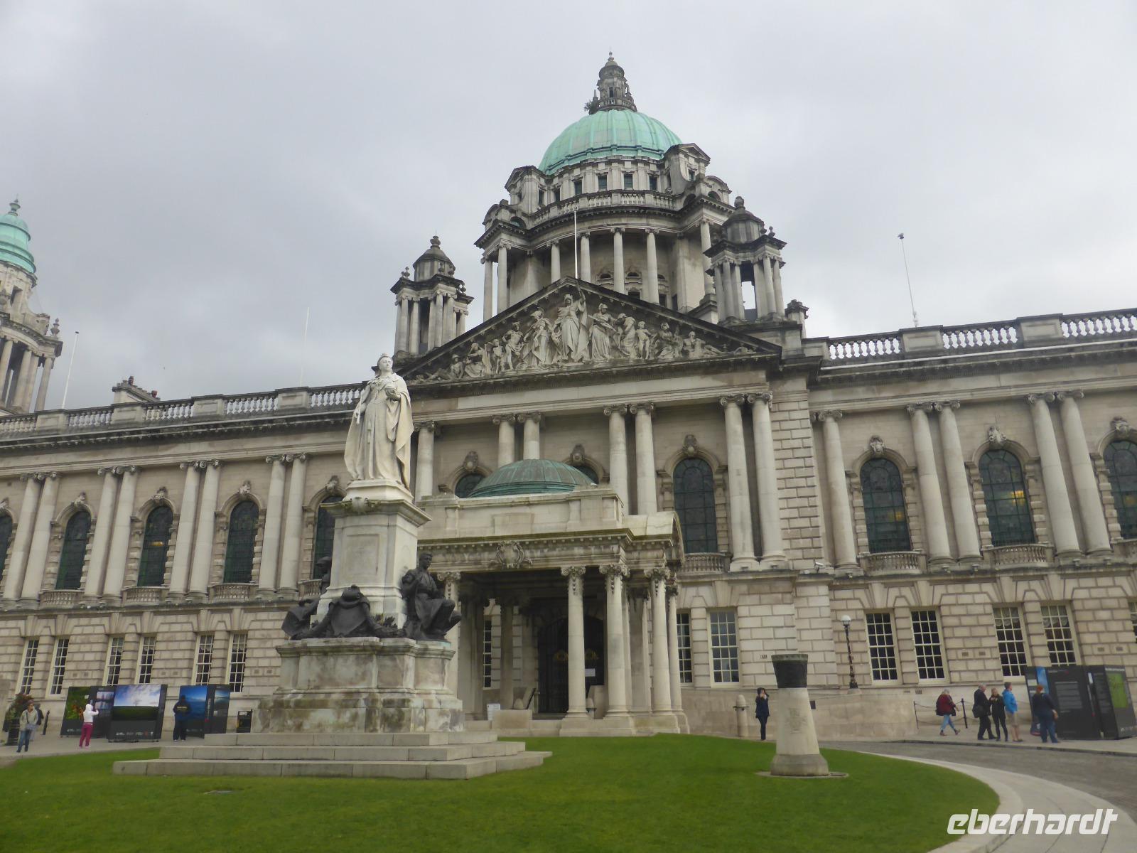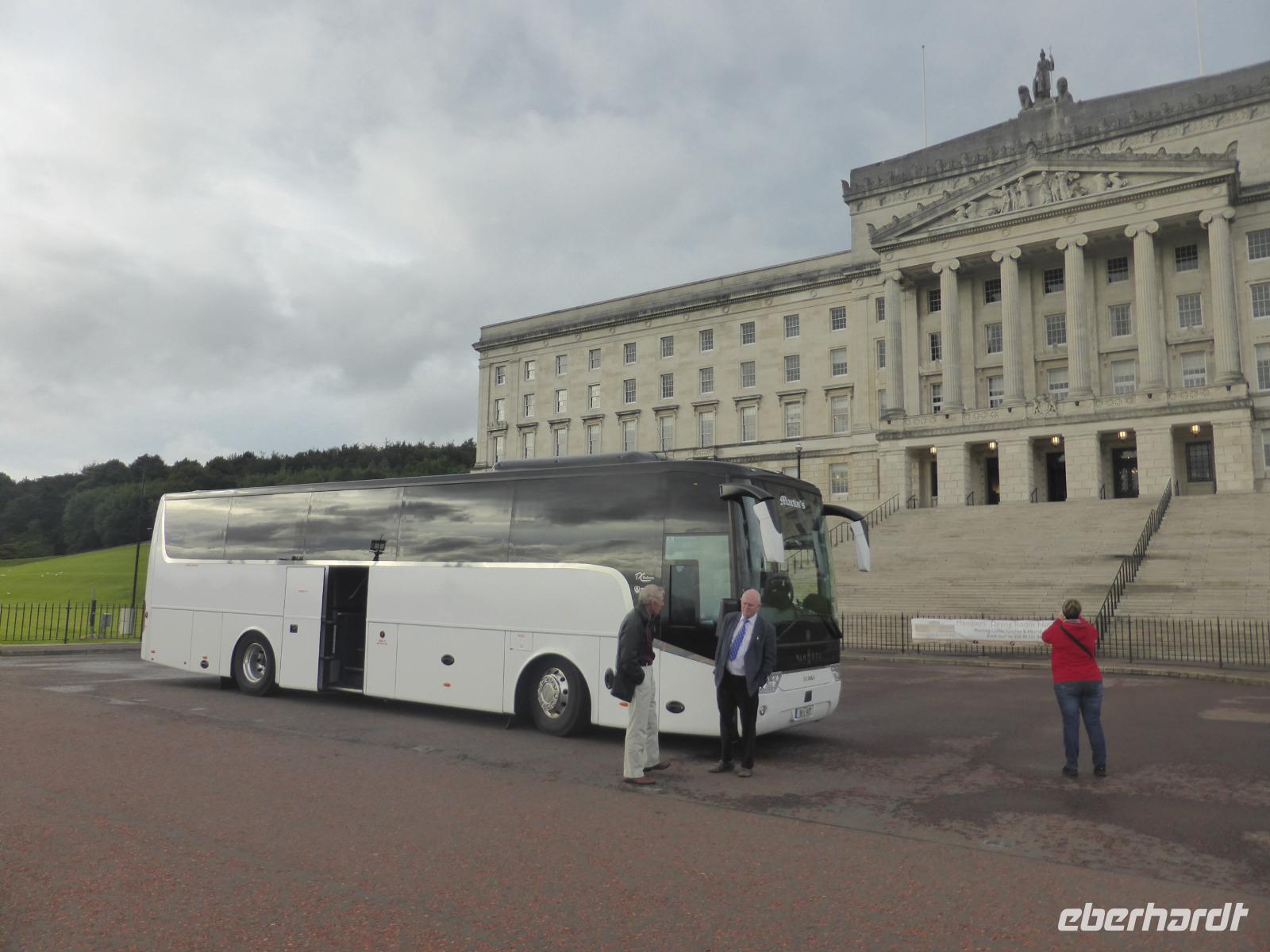 Nach unserer Abholung von zu Hause und Ankunft am Flughafen Berlin-Tegel checkten wir am Schalter der Air Lingus zum Flug nach Dublin ein. Dort trafen wir Gäste unserer Reisegruppe, welche von Hamburg, München und Frankfurt nach Dublin geflogen waren, und unsere Reisegruppe war komplett. Jonny, unser Fahrer, holte uns in der Ankunftshalle ab. Mit dem Bus ging es dann nach Belfast, wo wir an unserem Hotel Jurys Inn hielten und unser Belfaster Stadtführer Willy zustieg. Auf unterhaltsame Weise stellte er uns seine Heimatstadt vor. Am Rathaus, am Titanic-Museum und am nordirischen Parlamentsgebäude legten wir Fotostopps ein. Interessant war auch die Fahrt entlang der Painted Walls und der Fotostopp an der Peace Line, die auch heute noch die protestantischen von den katholischen Siedlungen trennt. Anschließend ging es zum Abendessen und zur Übernachtung zurück zum Hotel.