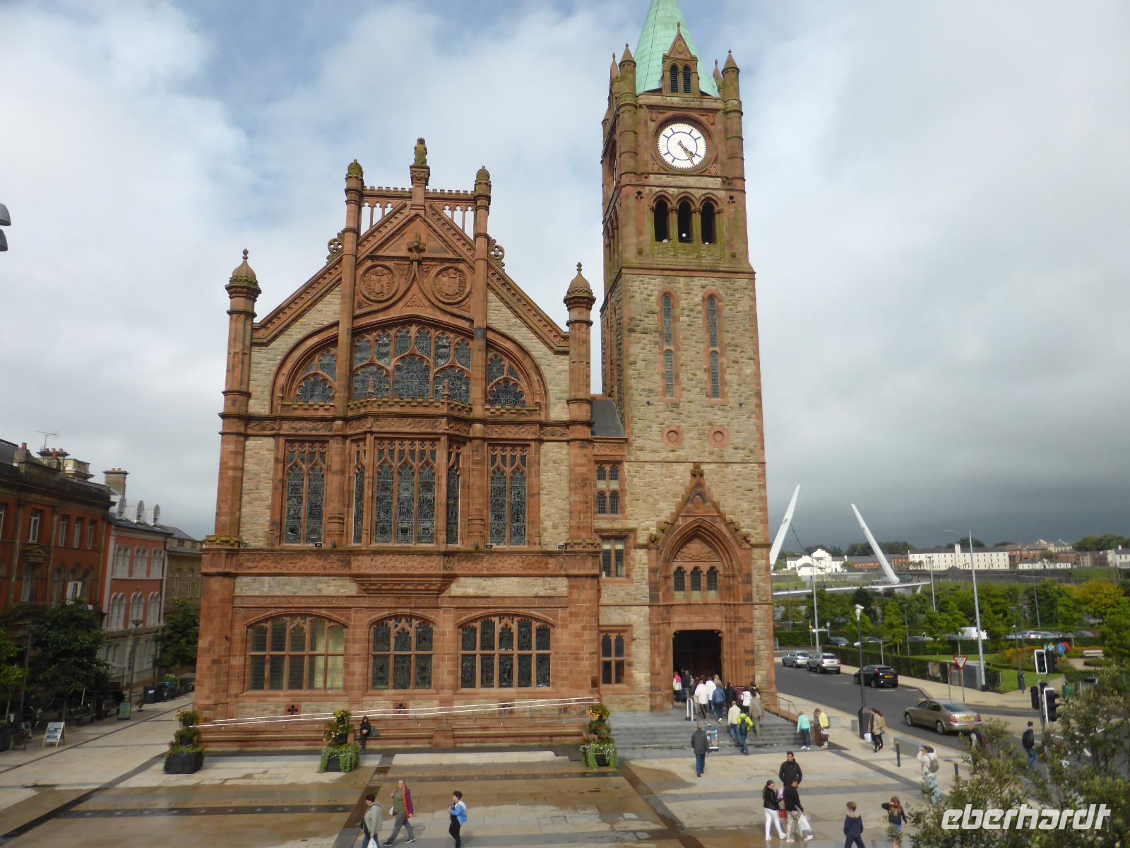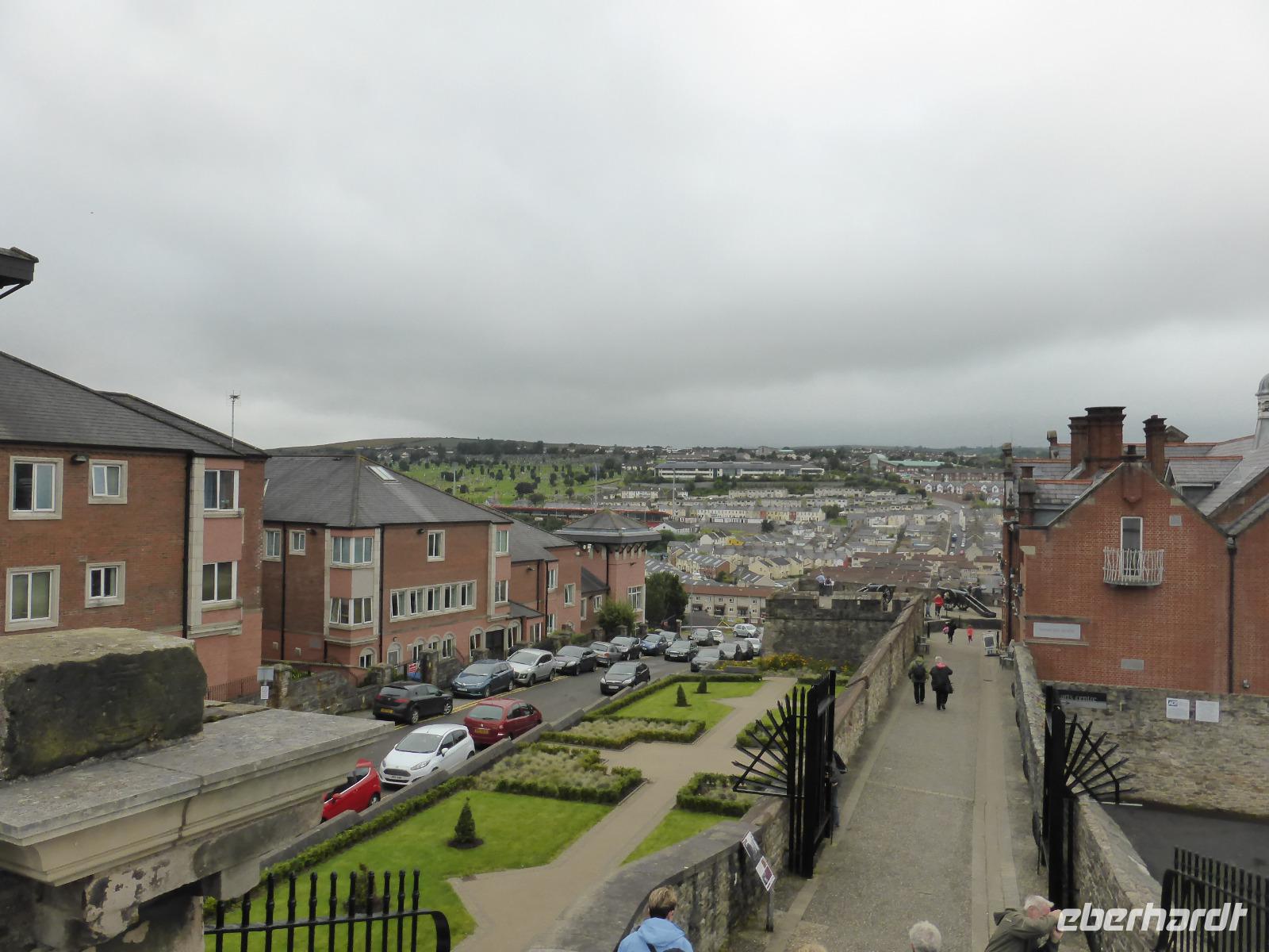 Nach der sich anschließenden Mittagspause im Besucherzentrum fuhren wir weiter nach Derry. Unterwegs hielten wir noch einmal kurz für einen Fotostopp am Dunluce Castle. Derry steht immer noch als Synonym für die „troubles", die Auseinandersetzungen zwischen Katholiken und Protestanten rund um den „Bloody Sunday", dem „Blutigen Sonntag", an dem am 30.Januar 1972 ein Fallschirmjäger-Regiment der britischen Armee das Feuer auf eine friedlich demonstrierende Menschenmenge eröffnete und 14 Menschen starben. Bis zum heutigen Tag sind die Wohnviertel nach Religionszugehörigkeit getrennt. Wir umrundeten auf der gewaltigen Stadtmauer das historische Stadtzentrum. Dabei begegneten wir immer wieder Personen in historischen Gewändern. Der Grund dafür war der Jahrestag der 105tägigen Verteidigung Derrys durch protestantische Städter gegen die Truppen Jakobs des II. 1689. Jedes Jahr wird mit einer Festwoche an diesen großen Sieg gedacht. Von Derry aus fuhren wir zu unserem Hotel in Letterkenny. Wer am Abend noch einen „Singing Pubs" aufsuchen wollte, hatte vom Hotel aus nicht weit.
