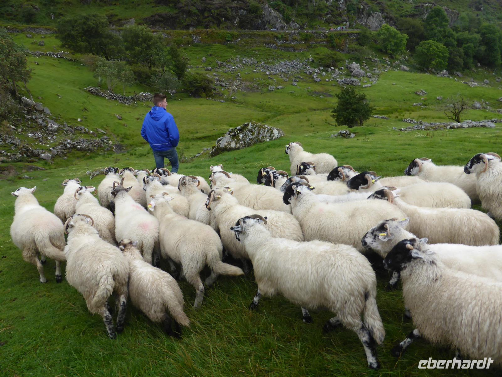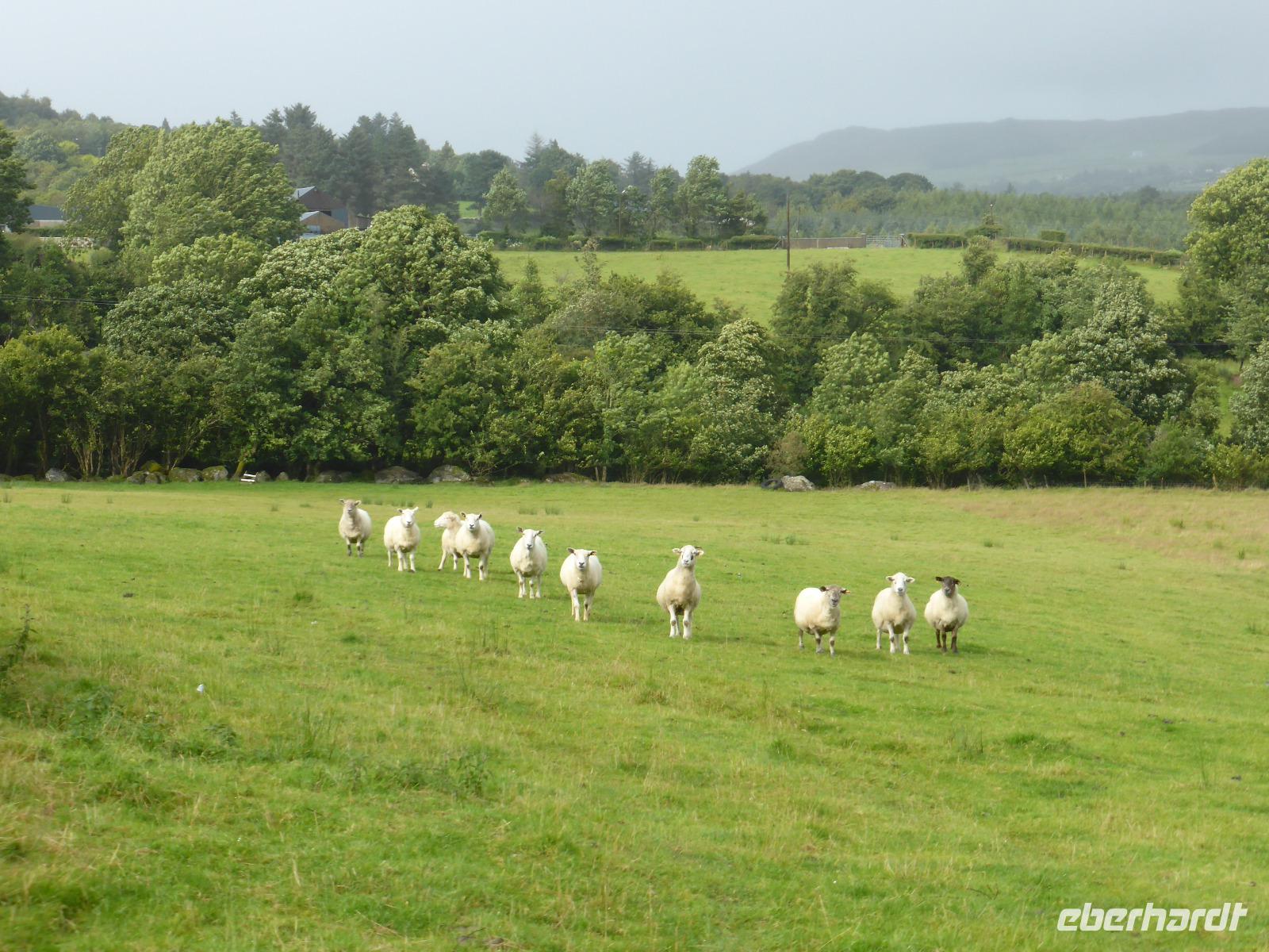Die schönste Seite der Iveragh Halbinsel ist die Südseite. Vorbei an Caherdaniel fuhren wir auf dem Ring of Kerry nach Sneem. In diesem, mehrmals wegen seiner Sauberkeit ausgezeichneten Städtchen, kamen wir am Nachmittag an. Hier fand jedes Jahr der nationale Wettbewerb im Woman-Carrying (Frauentragen) ausgetragen. Anschließend führte uns die Fahrt über Molls Gap zur Kissane-Schaffarm. Es ist unglaublich wie gelehrsam ein Border-Collie-Hund ist. Innerhalb weniger Minuten hatte er die Schafherde zusammen getrieben. In der Scheune sahen wir dann zu, wie die Schafe geschoren und geimpft wurden. Es schien, als seien die Tiere richtig froh darüber, dass ihnen das Fell abgenommen wird. Jedenfalls ließen sie die Prozedur regungslos über sich ergehen. Nach einem weiteren Fotostopp am Aussichtspunkt Ladys View fuhren wir zum Muckross House im Killarney Nationalpark. Die Landschaftsgestalter hatten bei der Bepflanzung des Anwesens ein wirklich gutes Gespür. Auf dem Rückweg vom Muckross-See spazierten wir an Azaleen und exotischen Baumarten vorbei und endeten am Besucherzentrum. Anschließend brachte uns der Bus zu unserem Hotel in Tralee zurück.
