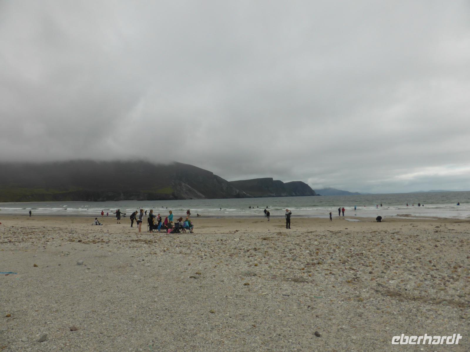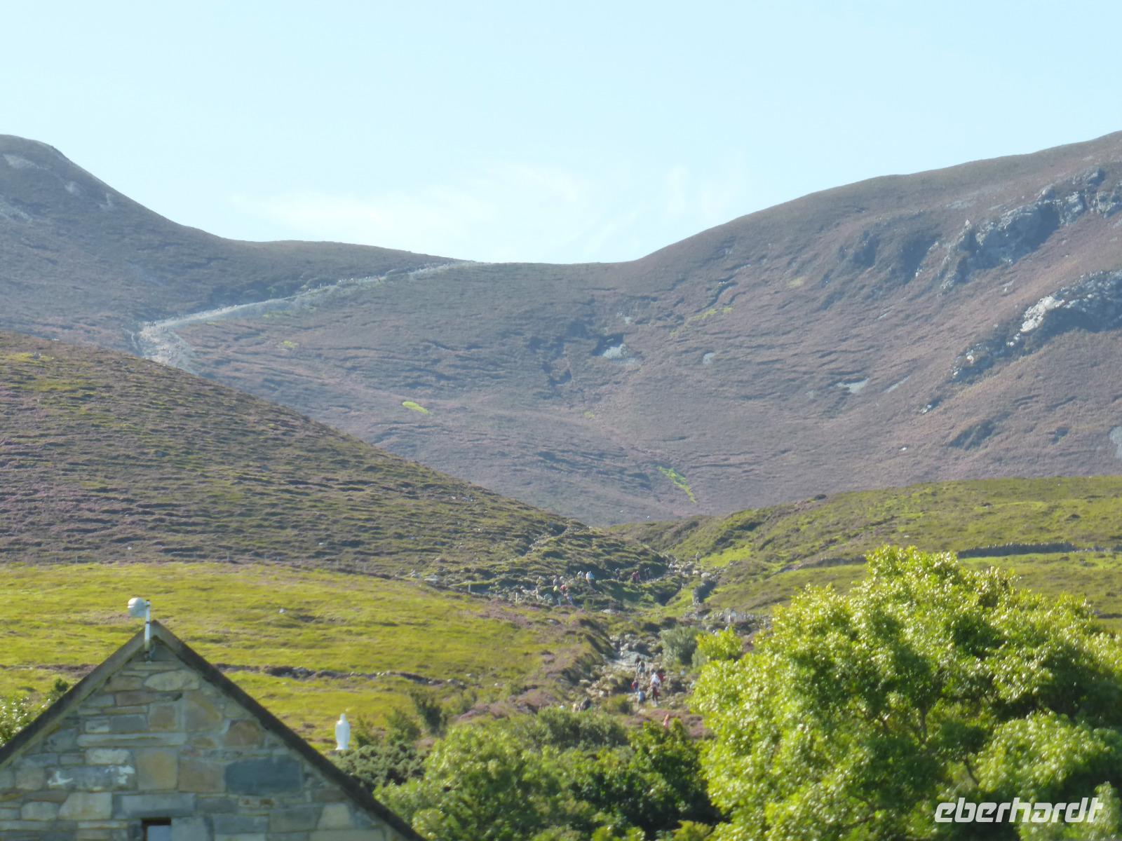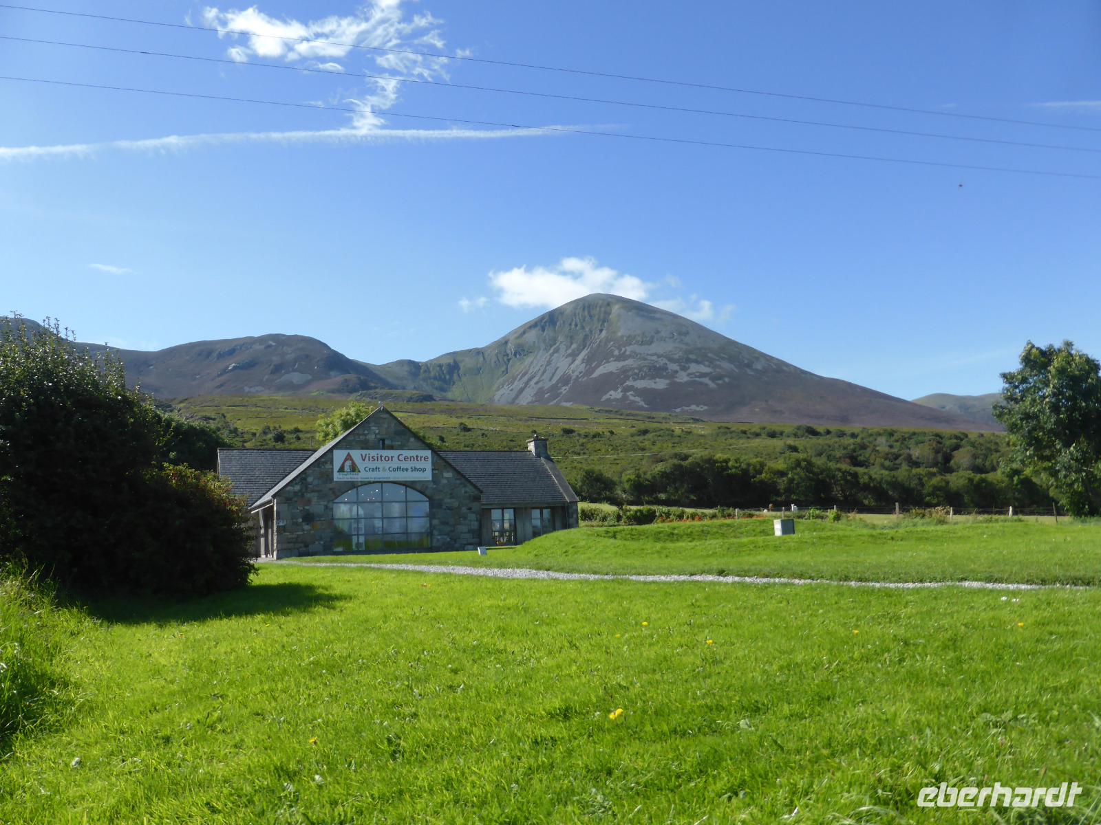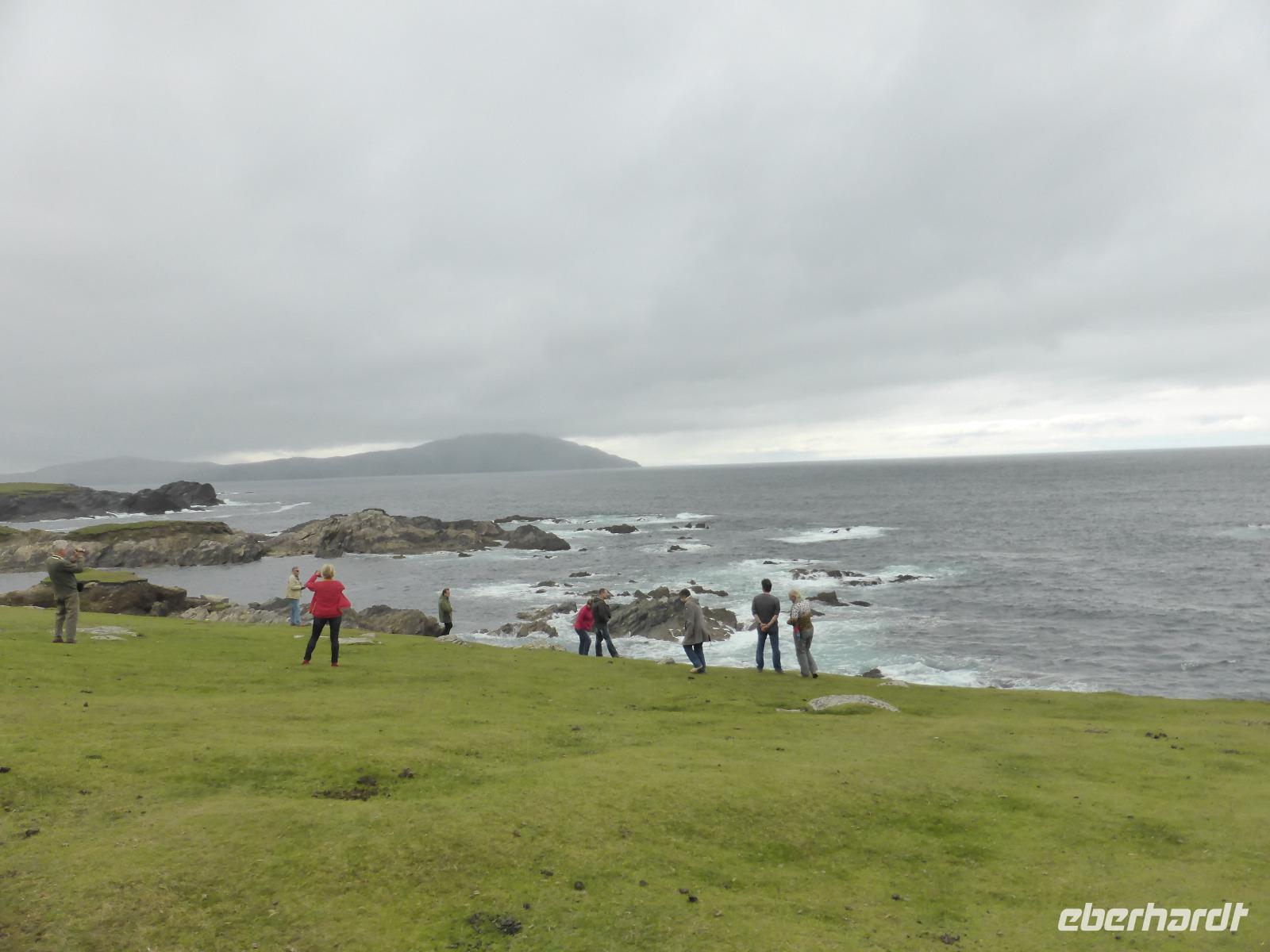 Von Killala aus fuhren wir zu den Klippen von Downpatrick Head. Hier steht ein seit Ende des 14.Jh. vom Festland getrennter Fels im Meer. Auf dem Festland soll einmal eine Kapelle gestanden haben, in der der heilige Patrick Messen las, woran auch der Name „Downpatrick" erinnert. Unser nächste Stopp galt dem Besucherzentrum Ceide Fields, einer steinzeitlichen Siedlung, deren steinerne Feldumrandungen die Jahrtausende unter dem schützenden Torf überstanden. Zunächst schauten wir uns im Besucherzentrum einen Film an und anschließend ging es hinaus auf die Felder. Lange hielten wir es im Freien nicht aus, denn aufgrund der Windstille plagten uns unzählige winzige Midges (Mücken). Angenehmer war es sich wieder im Besucherzentrum aufzuhalten. In ihm befindet sich auch eine kleine Ausstellung über die steinzeitlichen Siedler, über die Entstehung von Torf sowie ein Cafè. Vor unserer Weiterfahrt versuchten wir vergebens, die Midgesschwärme aus dem Bus zu bekommen. Vergebens. Etwas Abhilfe verschaffte uns das Zuschalten der Klimaanlage. Uns blieb nichts weiter übrig, als an einer etwas windigeren Stelle und weit abseits jeglichen Torfes noch einmal anzuhalten und die Mücken zu vertreiben. Unser nächster Stopp war am Informationszentrum des Ballycroy Nationalparkes. Anschließend fuhren wir nach Achill Island, der größten und am weitesten westlich gelegenen Insel Irlands. Zuerst fuhren wir auf der Panoramastraße des Wild Atlantik Way entlang der Clew Bay und legten zwei längere Fotostopps ein. Danach ging es zum weiten Sandstrand von Keel. Im Gegensatz zum Strand von Inishcrone war hier der Strand von gewaltigen Felsklippen begrenzt. Für die Rückfahrt wählten wir die Strecke über Doogort, um am Cottage Heinrich Bölls vorbeifahren zu können. Anschließend ging es über den Achill Sound wieder hinüber zum Festland und über Newport zu unserem Hotel in Ballina.