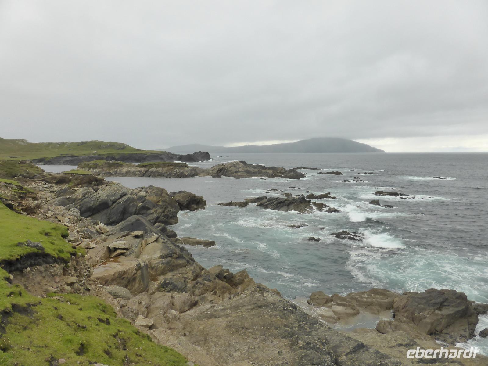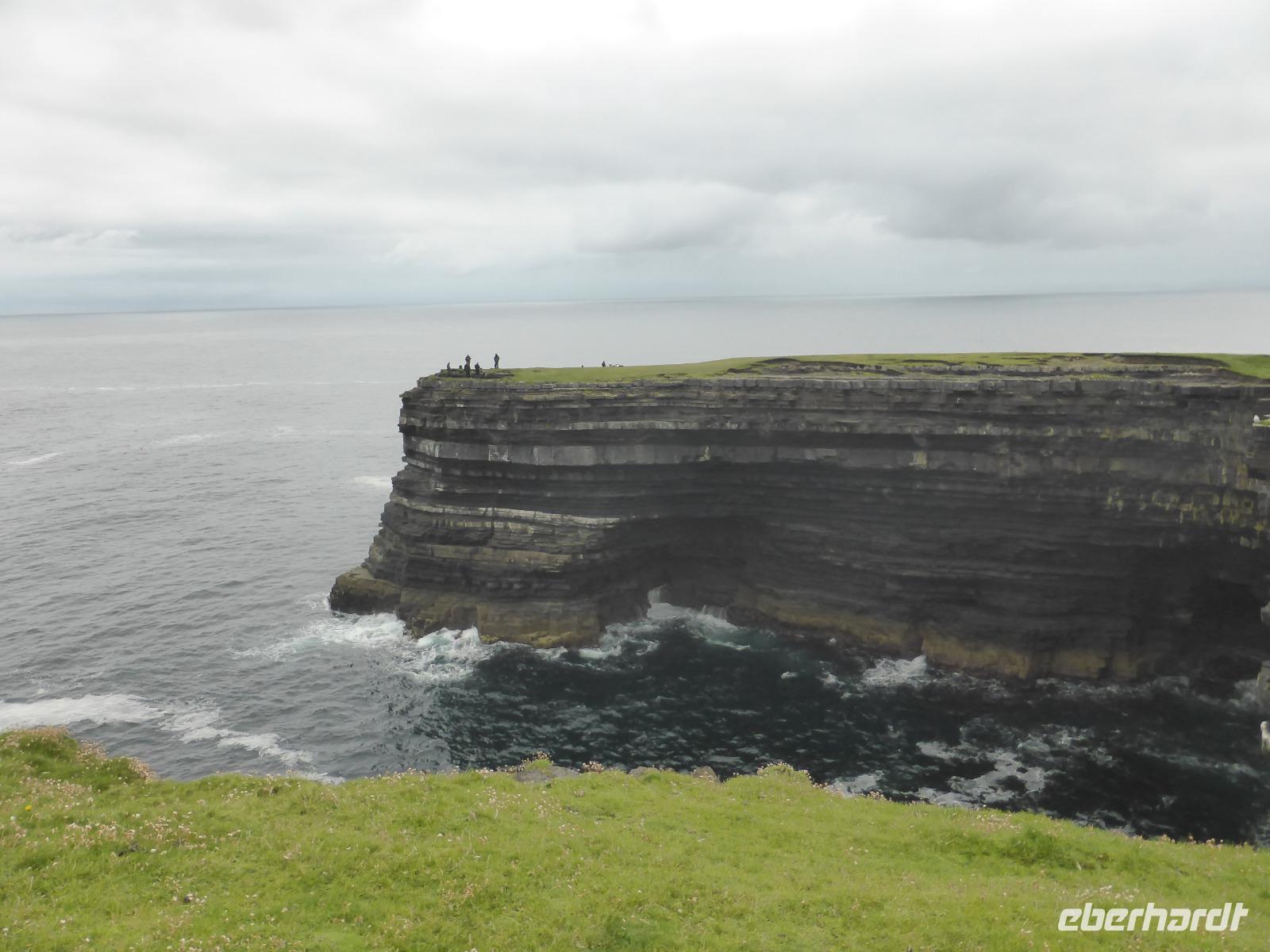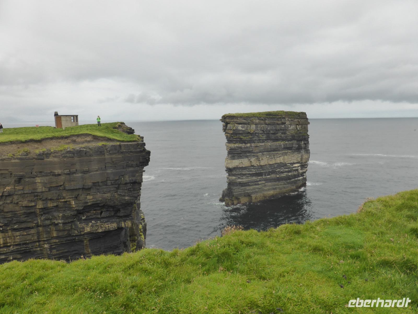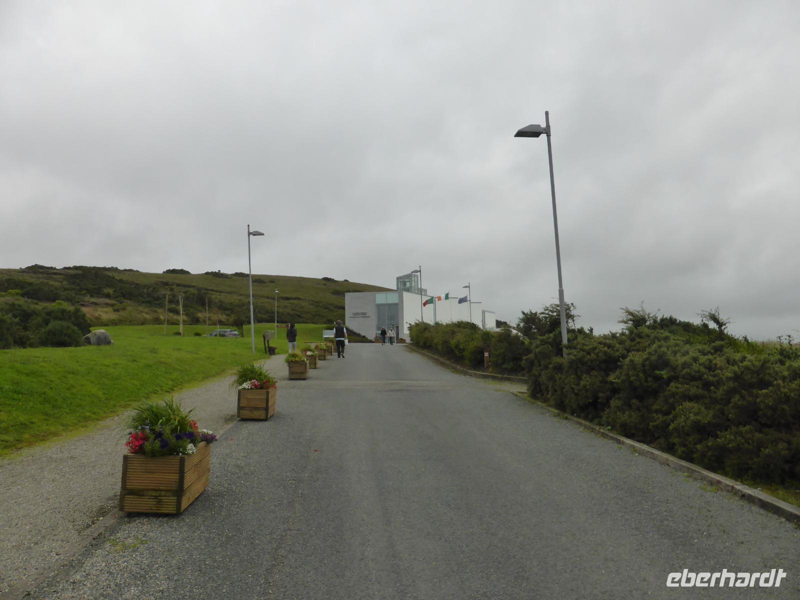Von Killala aus fuhren wir zu den Klippen von Downpatrick Head. Hier steht ein seit Ende des 14.Jh. vom Festland getrennter Fels im Meer. Auf dem Festland soll einmal eine Kapelle gestanden haben, in der der heilige Patrick Messen las, woran auch der Name „Downpatrick" erinnert. Unser nächste Stopp galt dem Besucherzentrum Ceide Fields, einer steinzeitlichen Siedlung, deren steinerne Feldumrandungen die Jahrtausende unter dem schützenden Torf überstanden. Zunächst schauten wir uns im Besucherzentrum einen Film an und anschließend ging es hinaus auf die Felder. Lange hielten wir es im Freien nicht aus, denn aufgrund der Windstille plagten uns unzählige winzige Midges (Mücken). Angenehmer war es sich wieder im Besucherzentrum aufzuhalten. In ihm befindet sich auch eine kleine Ausstellung über die steinzeitlichen Siedler, über die Entstehung von Torf sowie ein Cafè. Vor unserer Weiterfahrt versuchten wir vergebens, die Midgesschwärme aus dem Bus zu bekommen. Vergebens. Etwas Abhilfe verschaffte uns das Zuschalten der Klimaanlage. Uns blieb nichts weiter übrig, als an einer etwas windigeren Stelle und weit abseits jeglichen Torfes noch einmal anzuhalten und die Mücken zu vertreiben. Unser nächster Stopp war am Informationszentrum des Ballycroy Nationalparkes. Anschließend fuhren wir nach Achill Island, der größten und am weitesten westlich gelegenen Insel Irlands. Zuerst fuhren wir auf der Panoramastraße des Wild Atlantik Way entlang der Clew Bay und legten zwei längere Fotostopps ein. Danach ging es zum weiten Sandstrand von Keel. Im Gegensatz zum Strand von Inishcrone war hier der Strand von gewaltigen Felsklippen begrenzt. Für die Rückfahrt wählten wir die Strecke über Doogort, um am Cottage Heinrich Bölls vorbeifahren zu können. Anschließend ging es über den Achill Sound wieder hinüber zum Festland und über Newport zu unserem Hotel in Ballina.
