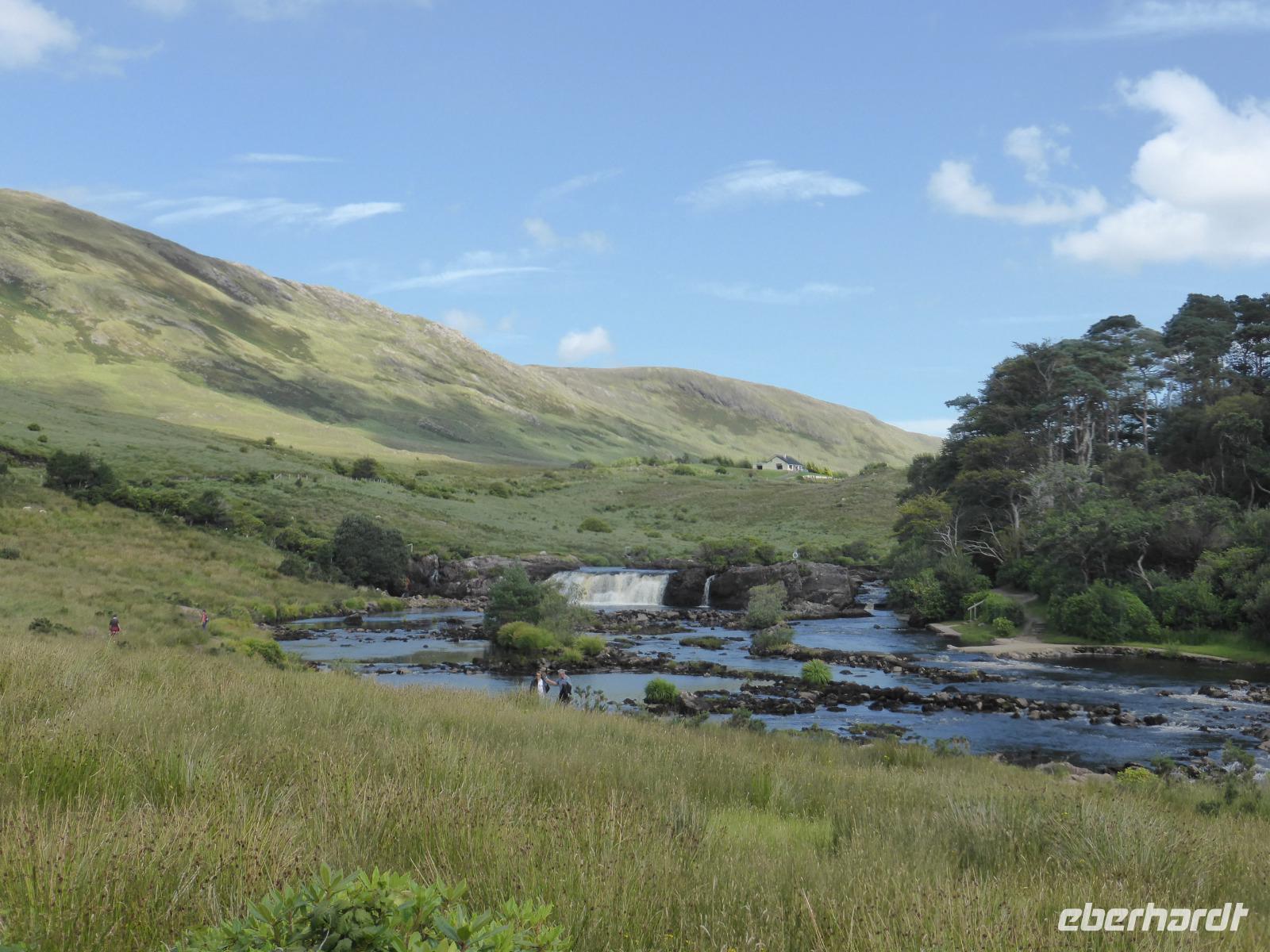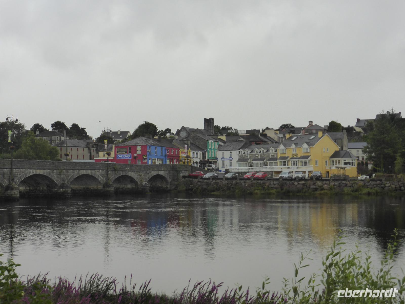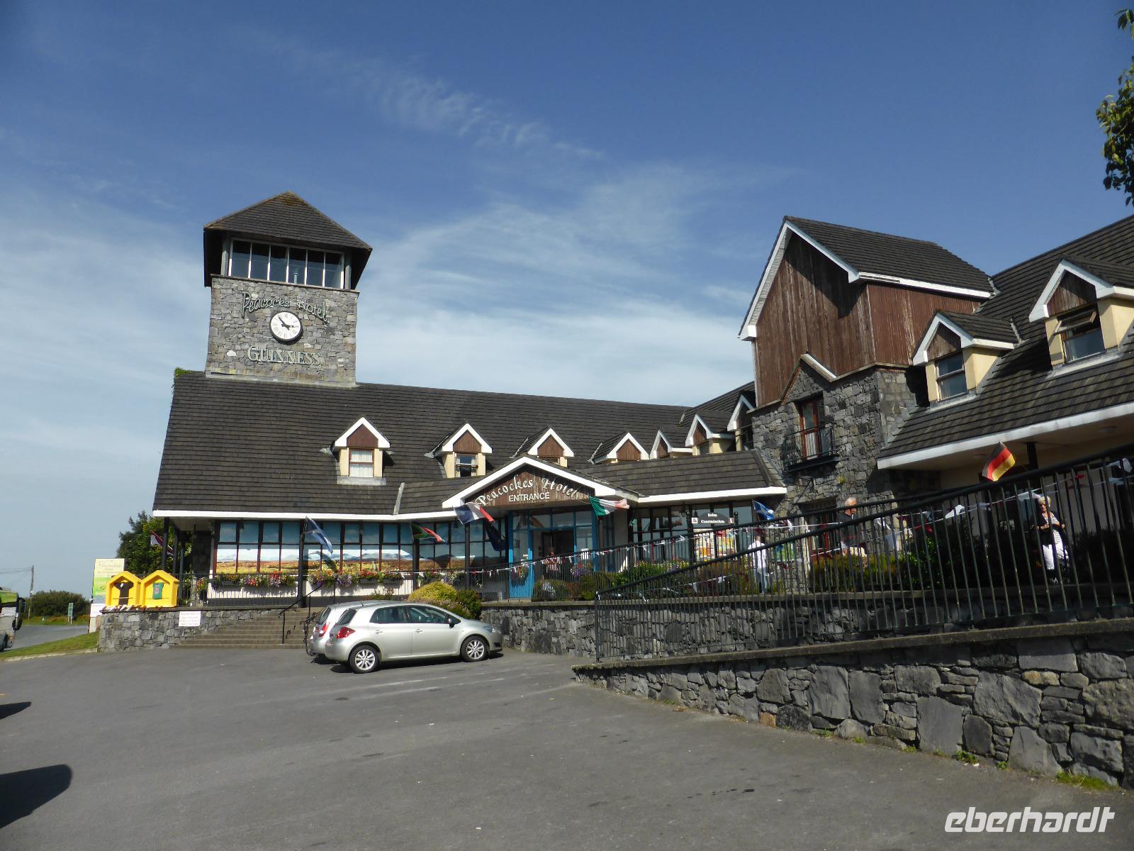 Auf der Pontoon-Bridge, genau zwischen den beiden Seen Lough Conn und Lough Cullin, machten wir bei schönstem Wetter unseren ersten Fotostopp. Anschließend fuhren wir nach Westport. Die Stadt ist zweifellos eine der schönsten Irlands. Ihr vorgelagert, in der Clew Bay, befinden sich viele kleine Inseln, welche die Stadt zu einem idealen Ausgangspunkt für Bootstouren macht. Von Westport ging es nach Murrisk. Hier hielten wir am Parkplatz für Bergtouren zum Croagh Patrick. Irlands Nationalheiliger soll auf ihm 44 Tage gefastet und einen Bann über alle irischen Schlangen gesprochen haben. Jeden letzten Sonntag im Juli wird dies mit einer großen Wallfahrt gefeiert. Wanderer auf dem Weg zur 765 m hohen Bergspitze konnten wir in einiger Entfernung sehen. Die Sicht war fantastisch! Sonne und wolkenfreier Himmel! Danach fuhren wir durch das landschaftlich reizvolle Doo Lough Valley zu den Aasleagh Falls. Wir hatten genügend Zeit, um in Ruhe bis zu den Stromschnellen zu gehen. Unsere Mittagspause legten wir in Leenaune, einer kleinen Ortschaft am Killary Harbour, ein. Es handelt sich beim Killary Harbour um den längsten irischen Fjord mit einer Länge von ca. 17 Kilometern. Von Leenaune aus sahen wir auch die „Lazy beds" genannten Kartoffelfelder, welche die Hänge oberhalb der Stadt säumten. Danach ging es durch das Joyce County nach Cong, einem hübschen Städtchen oberhalb des Lough Corrib. Dort wurde der Film „Quiet Man" gedreht, in dem ein Boxer (John Wayne) nach Irland, ins Land seiner Vorfahren, zurückkehrt, um eine Frau zu finden (Maureen O'Hara). Von Cong aus fuhren wir zum Abschluss des Tages nach Kilmacdough, zum höchsten Rundturm Irlands und einem eindrucksvollen mittelalterlichen Klosterkomplex. Anschließend brachte uns der Bus zu unserem Hotel Lady Gregory in Gort.