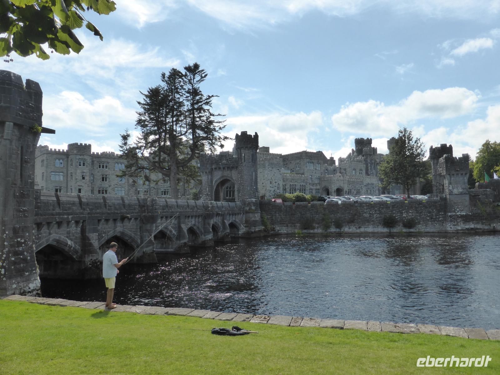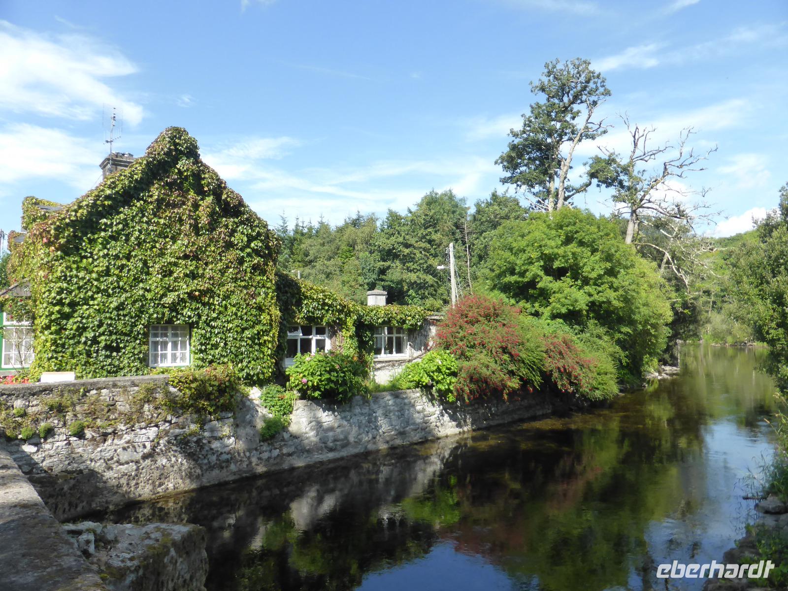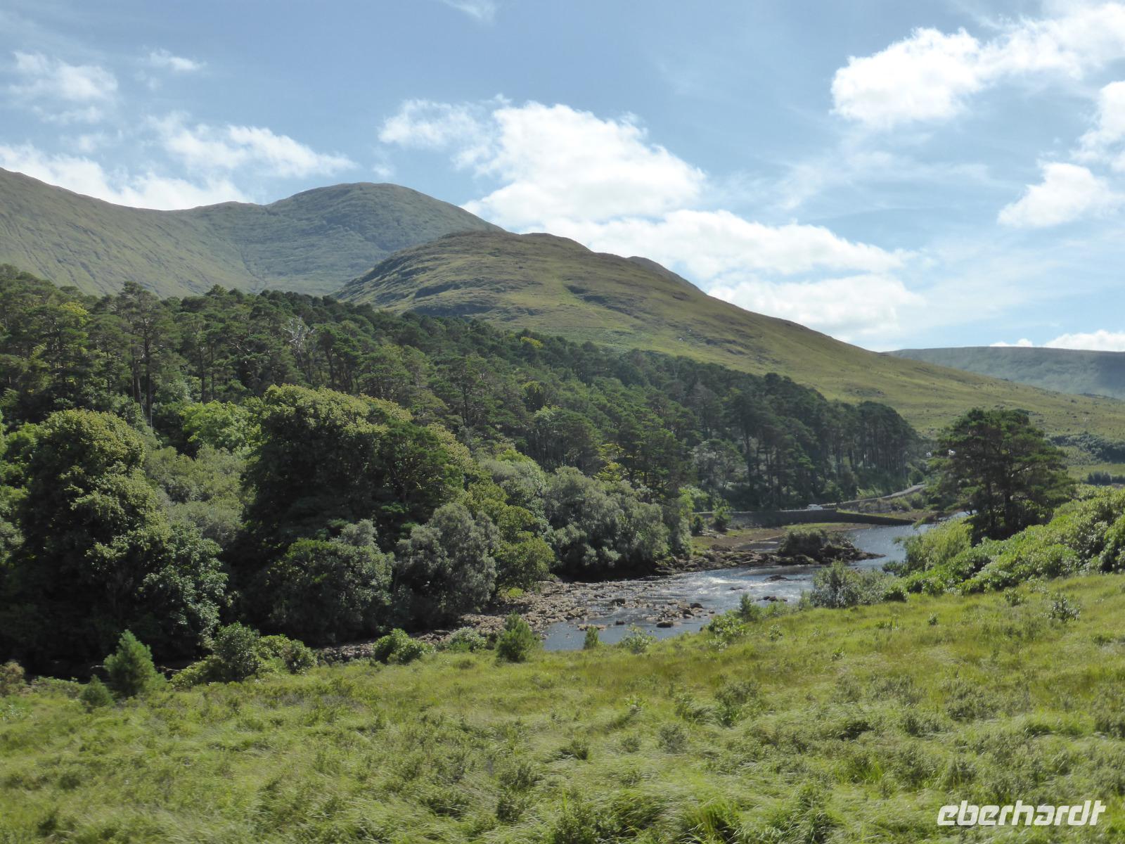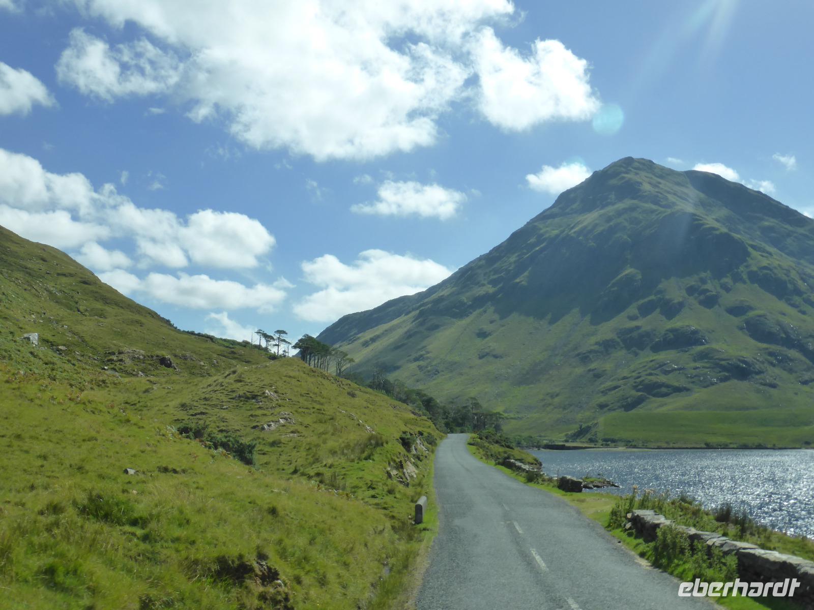 Auf der Pontoon-Bridge, genau zwischen den beiden Seen Lough Conn und Lough Cullin, machten wir bei schönstem Wetter unseren ersten Fotostopp. Anschließend fuhren wir nach Westport. Die Stadt ist zweifellos eine der schönsten Irlands. Ihr vorgelagert, in der Clew Bay, befinden sich viele kleine Inseln, welche die Stadt zu einem idealen Ausgangspunkt für Bootstouren macht. Von Westport ging es nach Murrisk. Hier hielten wir am Parkplatz für Bergtouren zum Croagh Patrick. Irlands Nationalheiliger soll auf ihm 44 Tage gefastet und einen Bann über alle irischen Schlangen gesprochen haben. Jeden letzten Sonntag im Juli wird dies mit einer großen Wallfahrt gefeiert. Wanderer auf dem Weg zur 765 m hohen Bergspitze konnten wir in einiger Entfernung sehen. Die Sicht war fantastisch! Sonne und wolkenfreier Himmel! Danach fuhren wir durch das landschaftlich reizvolle Doo Lough Valley zu den Aasleagh Falls. Wir hatten genügend Zeit, um in Ruhe bis zu den Stromschnellen zu gehen. Unsere Mittagspause legten wir in Leenaune, einer kleinen Ortschaft am Killary Harbour, ein. Es handelt sich beim Killary Harbour um den längsten irischen Fjord mit einer Länge von ca. 17 Kilometern. Von Leenaune aus sahen wir auch die „Lazy beds" genannten Kartoffelfelder, welche die Hänge oberhalb der Stadt säumten. Danach ging es durch das Joyce County nach Cong, einem hübschen Städtchen oberhalb des Lough Corrib. Dort wurde der Film „Quiet Man" gedreht, in dem ein Boxer (John Wayne) nach Irland, ins Land seiner Vorfahren, zurückkehrt, um eine Frau zu finden (Maureen O'Hara). Von Cong aus fuhren wir zum Abschluss des Tages nach Kilmacdough, zum höchsten Rundturm Irlands und einem eindrucksvollen mittelalterlichen Klosterkomplex. Anschließend brachte uns der Bus zu unserem Hotel Lady Gregory in Gort.