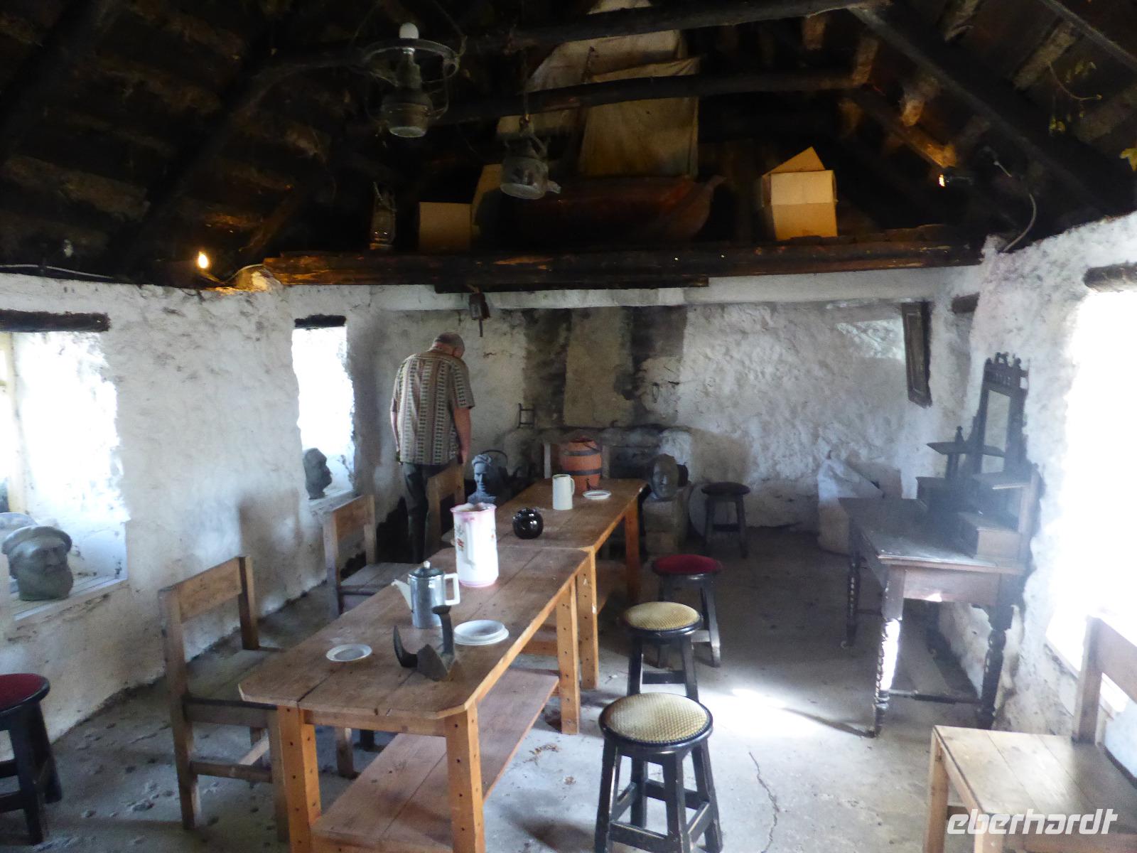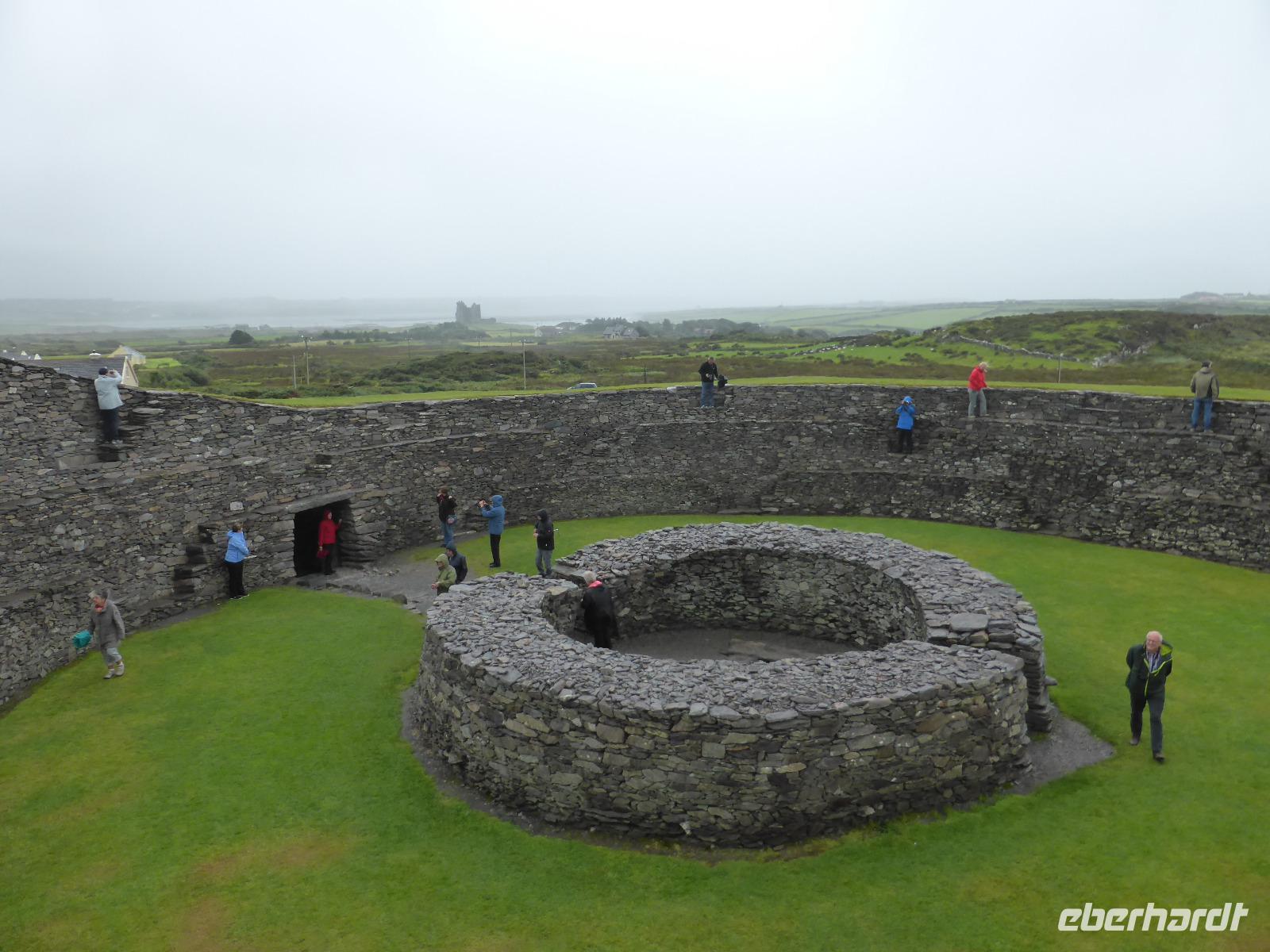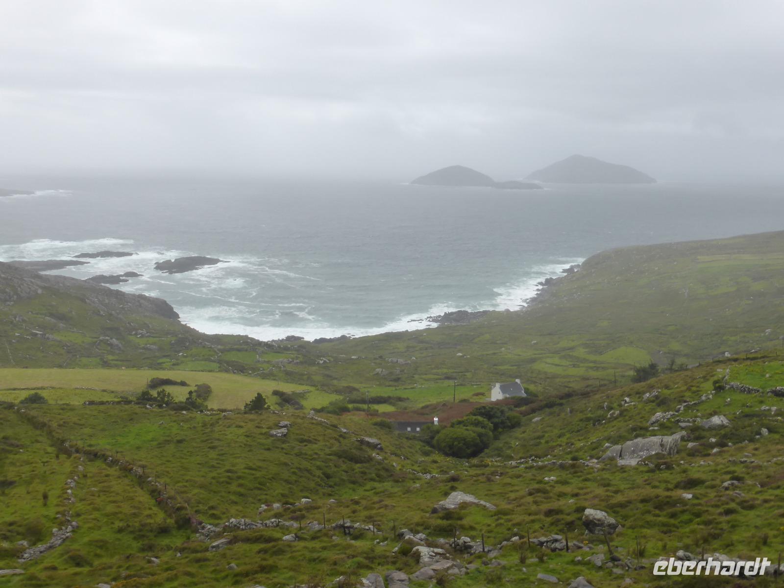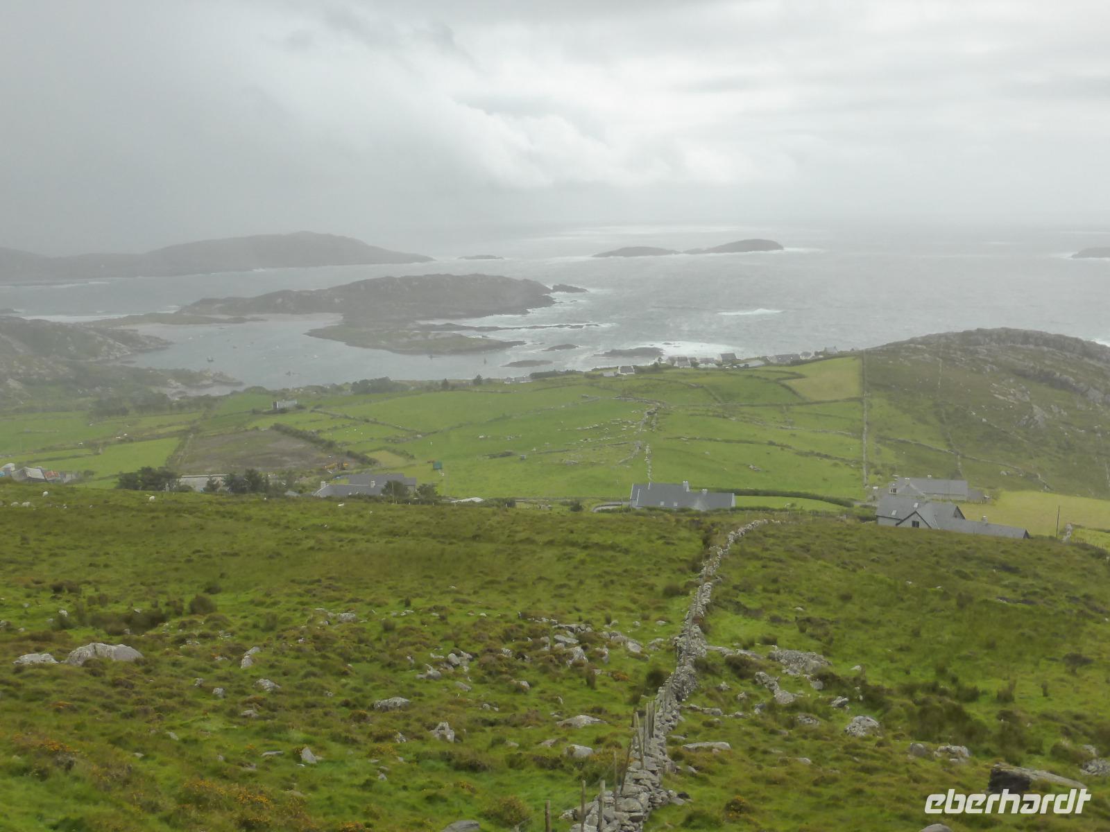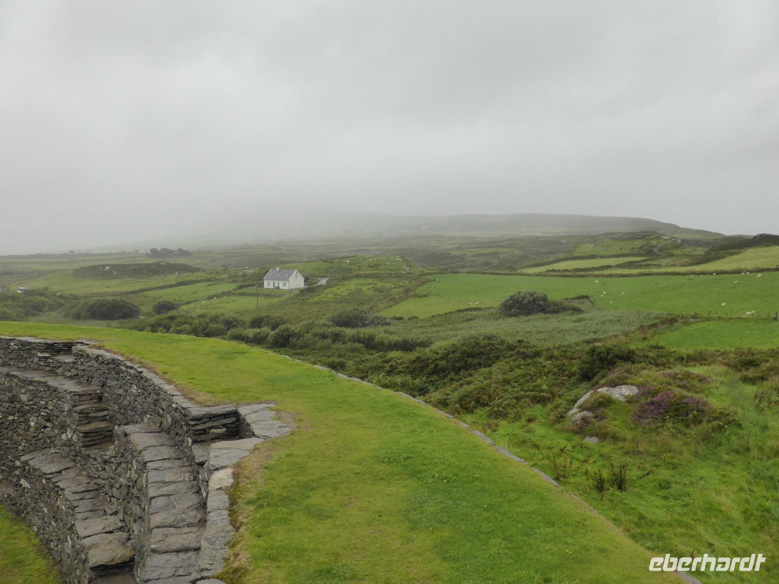 Nach dem Frühstück starteten wir zu unserer Rundfahrt auf dem Ring of Kerry auf der Halbinsel Iveragh. Nach mehreren Fotostopps bei Killorglin, am Red Fox Inn-Pub und an der Dingle Bay kamen wir in Cahersiveen, der Geburtsstadt Daniel O'Connells an. Auf der anderen Seite des Flusses liegt das Cahergall Stone Fort (Cathair Geal). Einige dieser Steinforts sind bis zu 2500 Jahre alt. Es war beeindruckend zu sehen, wie massiv das Fort errichtet wurde und wie akkurat die Steine aufgeschichtet worden sind. Vom Cahergall Stone Fort aus fuhren wir weiter, vorbei an der Insel Valencia Island, bis nach Waterville, wo wir unsere Mittagspause einlegten. Danach ging es hinauf zum Coomakesta Pass auf eine Höhe von 210 m. Von der Passhöhe aus hat man einen schönen Blick auf den Kenmare River und die Ballinskelligs Bay. Allerdings war es da oben auch sehr windig. In Schräglage hielten wir unsere Mützen und Kapuzen fest.