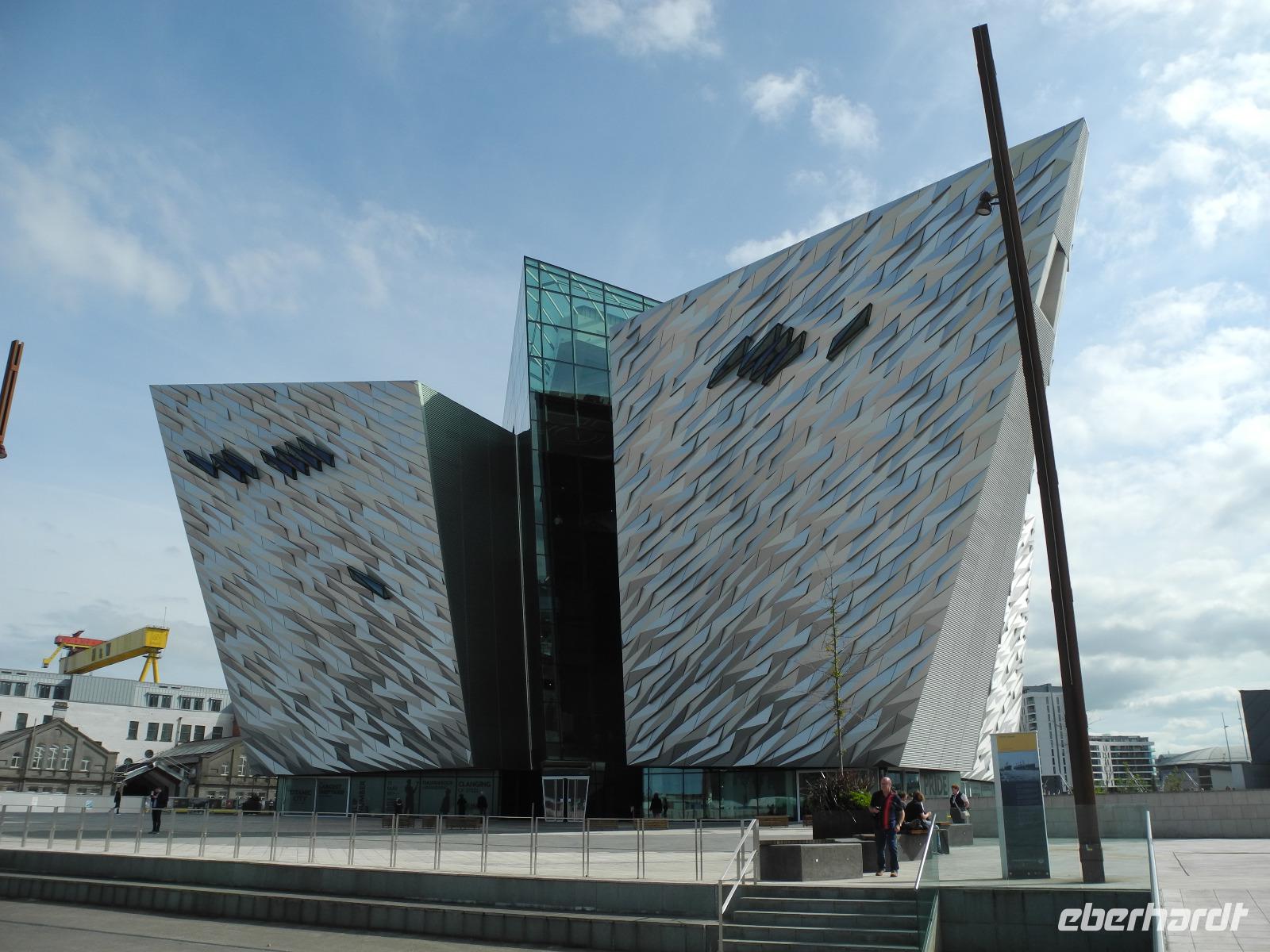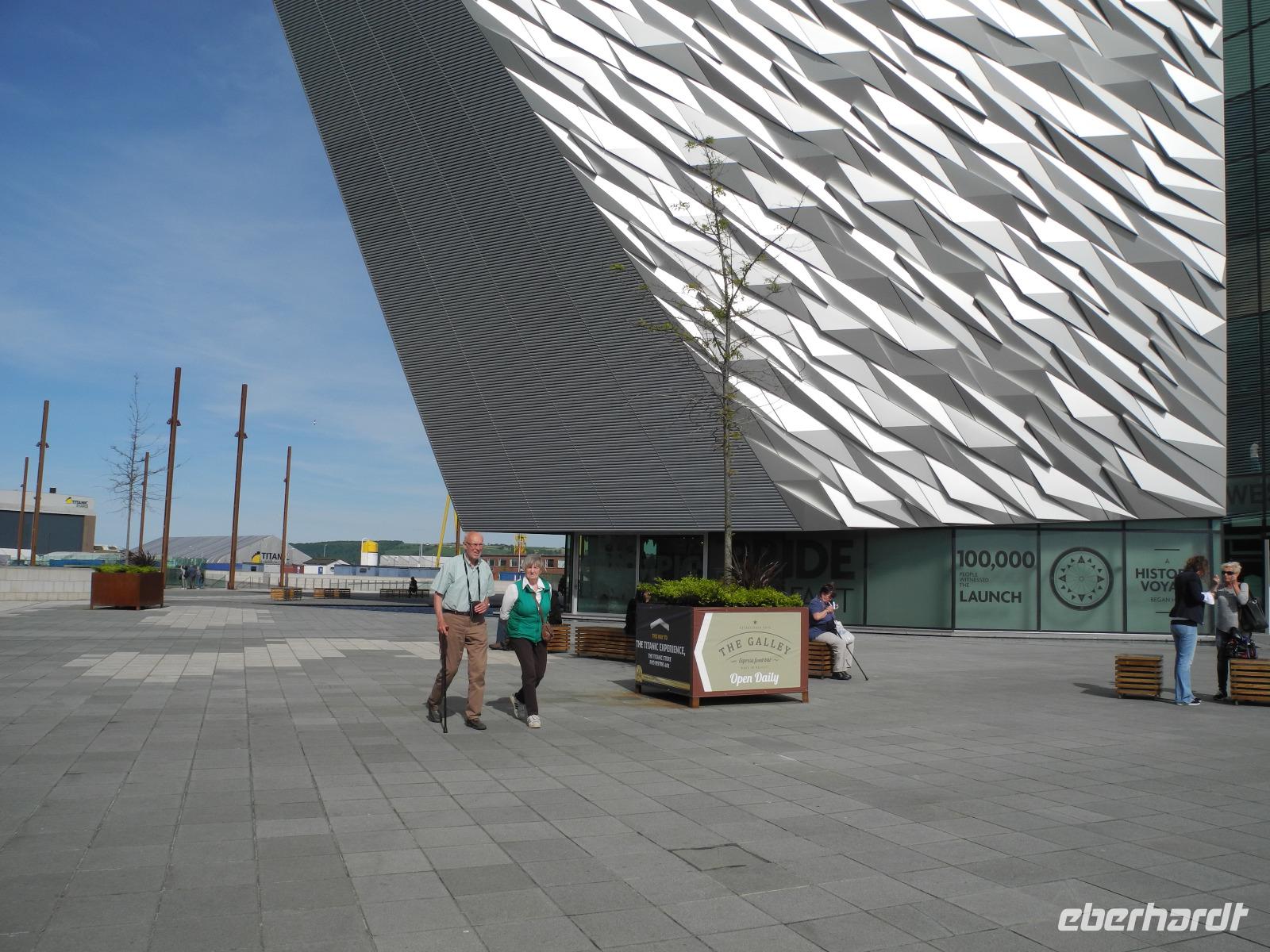 Trotz ihrer teilweise auch traurigen Geschichte vermittelt uns Belfast einen spürbar fröhlichen und unbekümmerten Eindruck.Auch wenn wir alle schon ein bisschen müde sind macht es dennoch Spaß, durch die Stadt zu fahren und bei dem schönen Universitätsgebäude einen Stopp zu machen, bevor wir zum „Titanic Belfast" fahren, wo einst die „Titanic" vom Stapel gelaufen ist und nun das moderne und gewagte Ausstellungsgebäude steht, das gerne das „Guggenheim" von Belfast genannt wird.