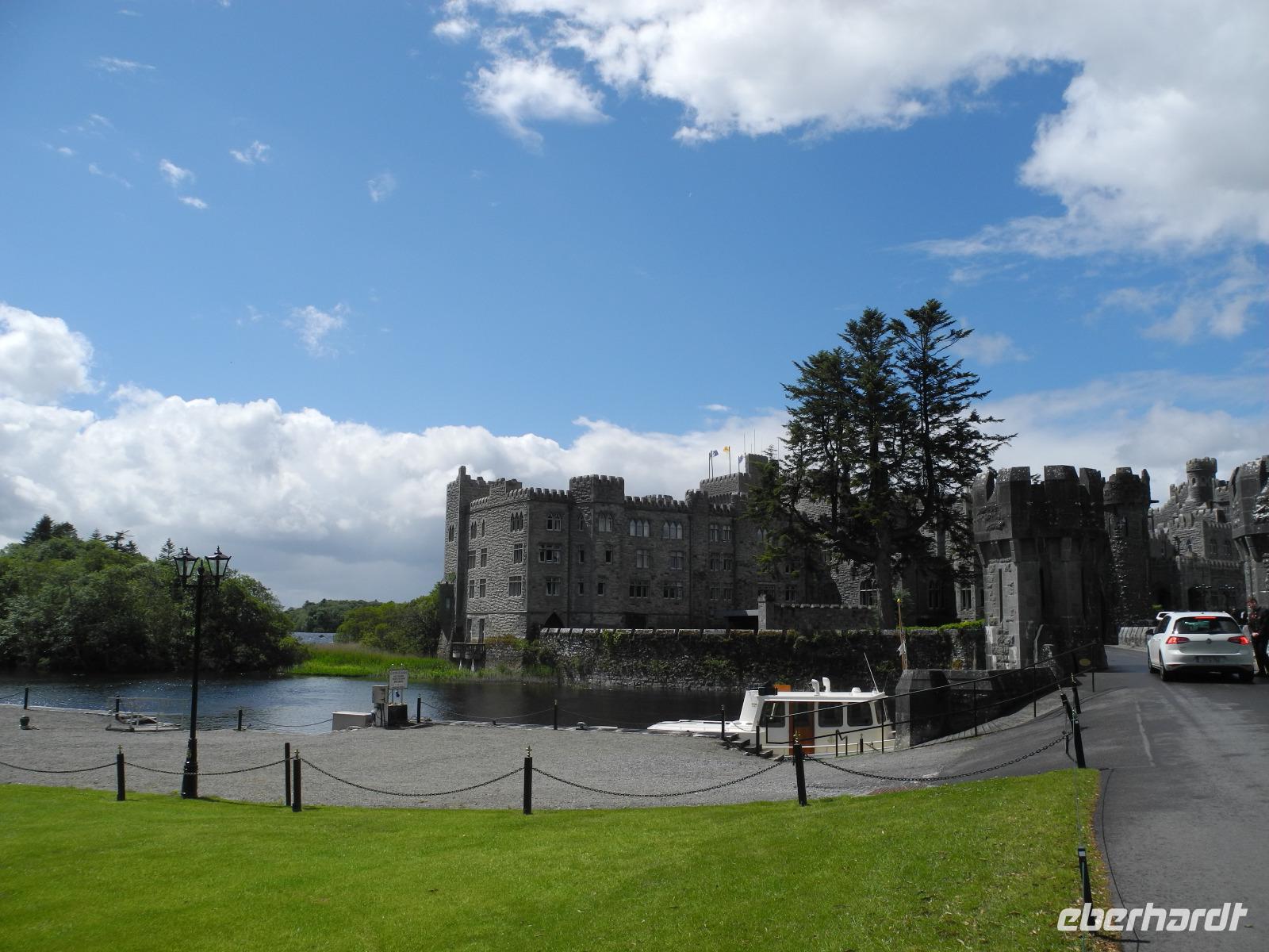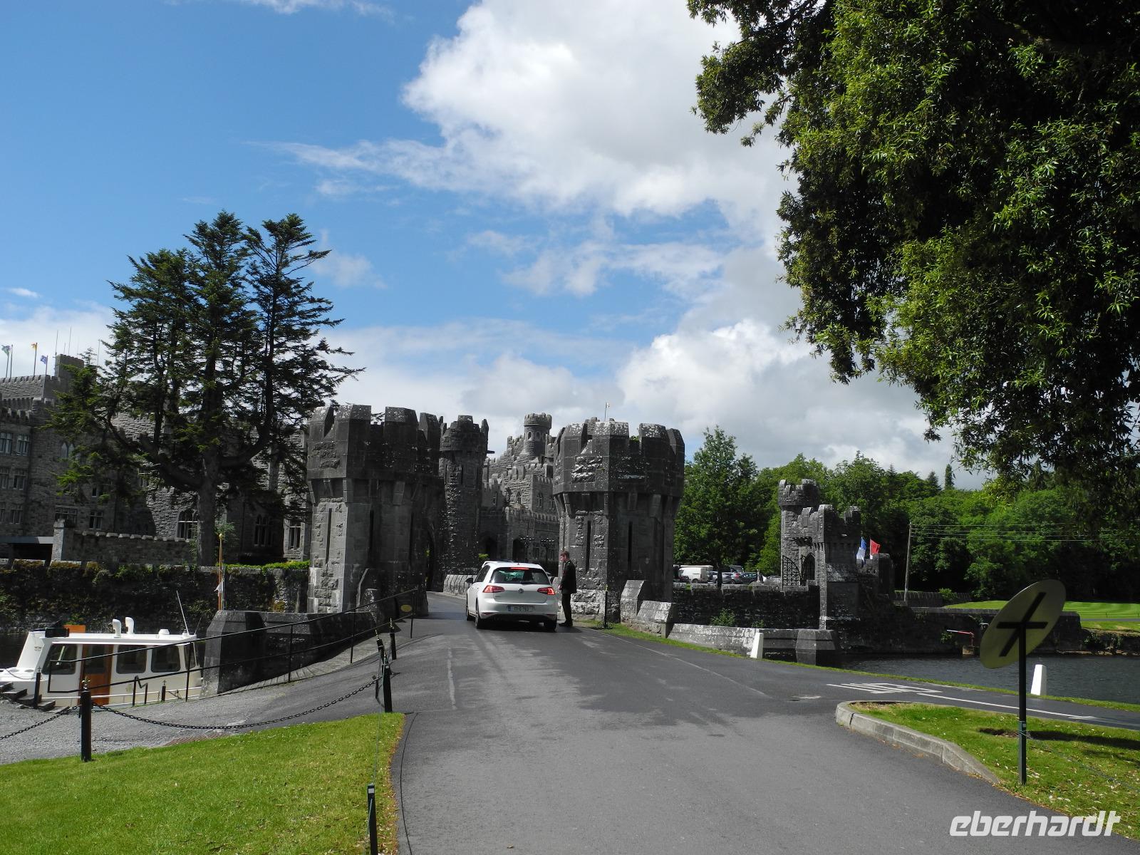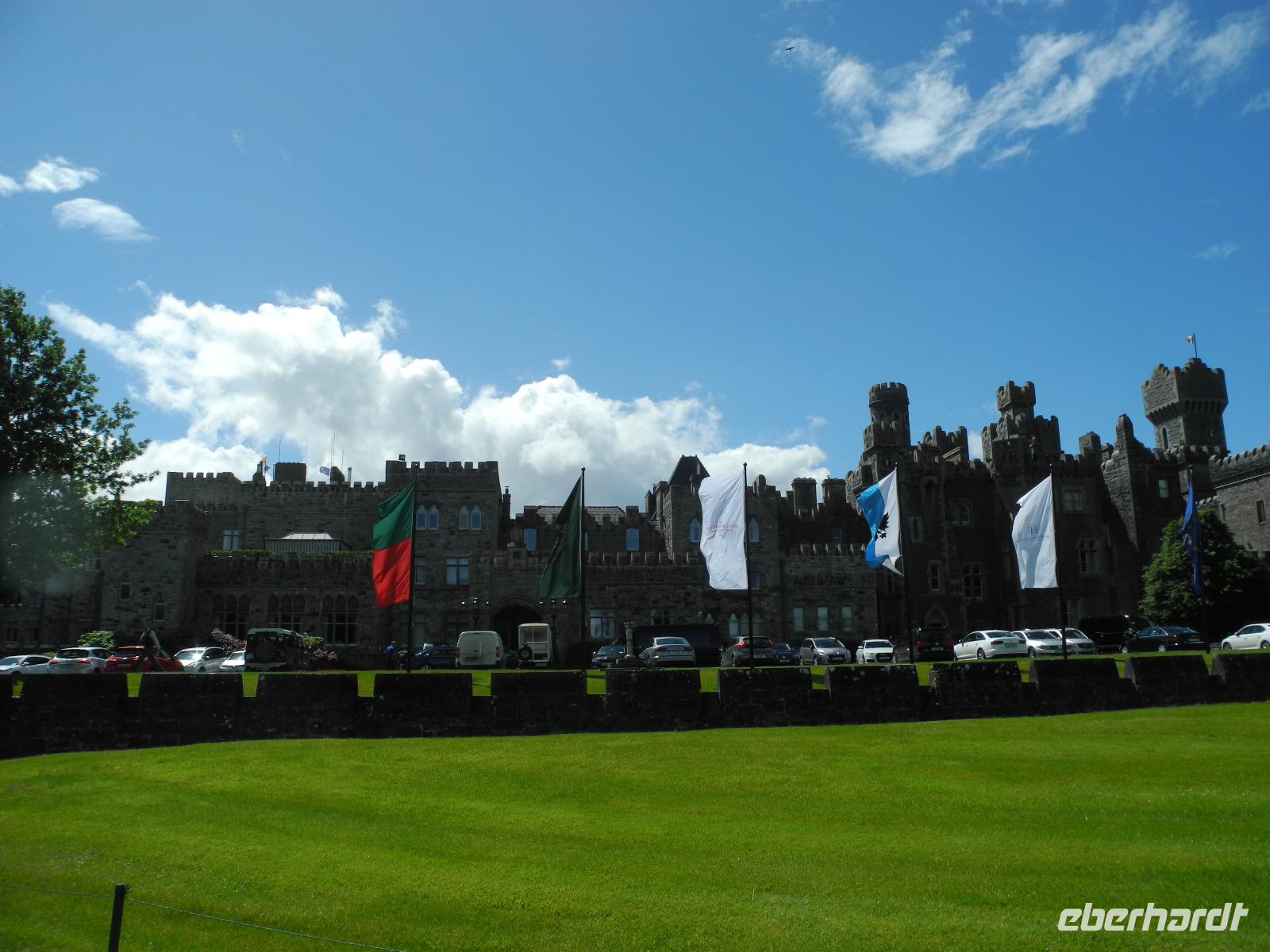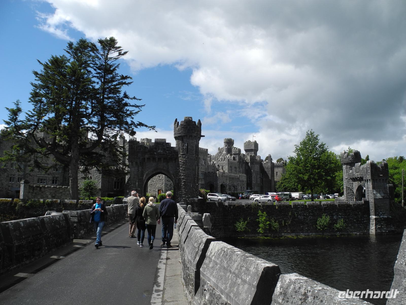 Als kleine Besonderheit darf man das „Abbey Cong" bezeichnen, durch dessen Ruine und die wunderschön angelegte Parkanlage wir spazieren, bei einem Wetter, das man gerne „Kaiserwetter" nennen darf. Von der kleinen Brücke bei „Monks Fishing House" können wir ganz aus der Nähe wieder einmal einen Angler beobachten, der sich gerade im „Flyfishing" übt. Es ist geradezu ein Postkarten-Panorama, das sich uns in Cong bietet.Nicht nur die Uhr, auch der wieder nur kurz einsetzende Regen sagt uns allen, dass es weiter geht und so finden wir uns immer wieder gemeinsam beim Bus ein, selbst wenn wir die Zeit nicht so genau festgelegt haben, um eben keinen Stress aufkommen zu lassen.Inzwischen hatte sich eine Möglichkeit entwickelt, wie wir das nahegelegene „Ashford Castle" noch ein bisschen näher sehen können und diese Möglichkeit wollten wir nun nicht auslassen.