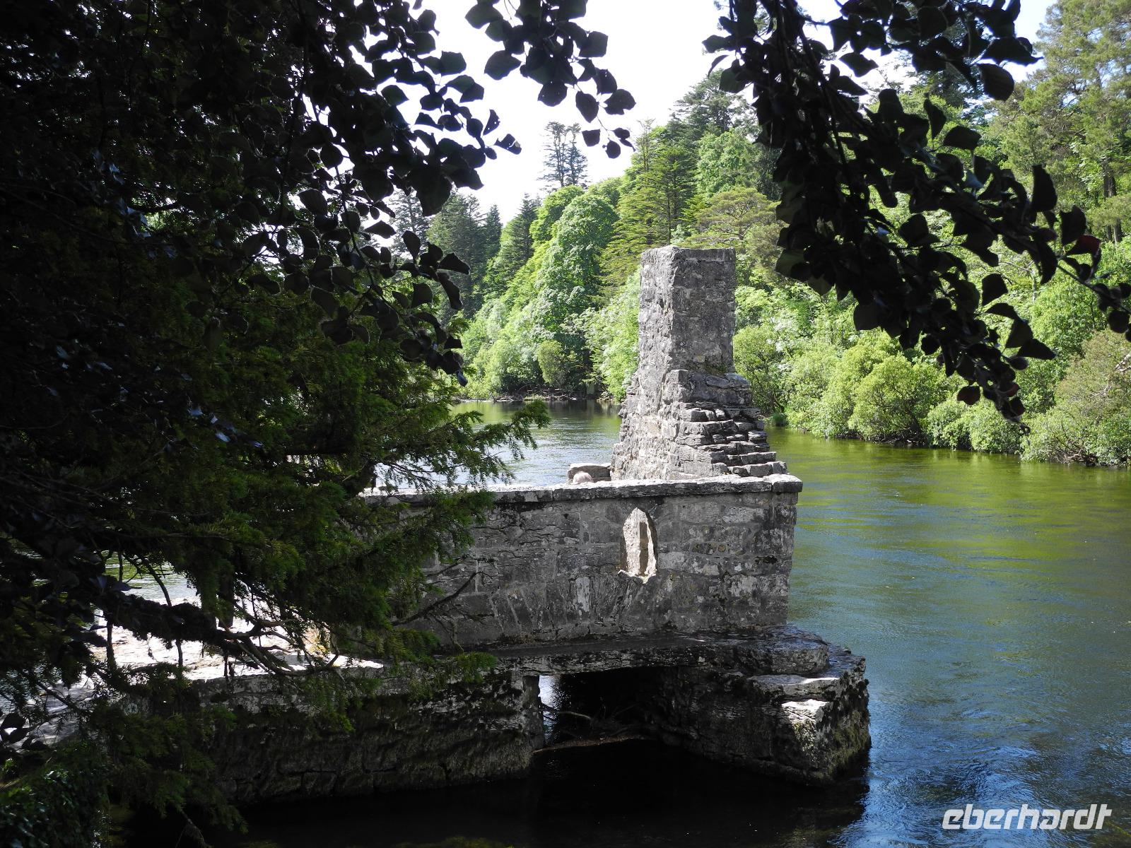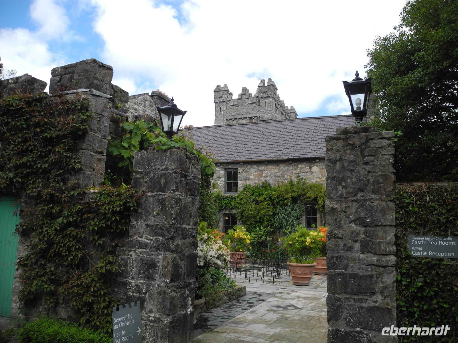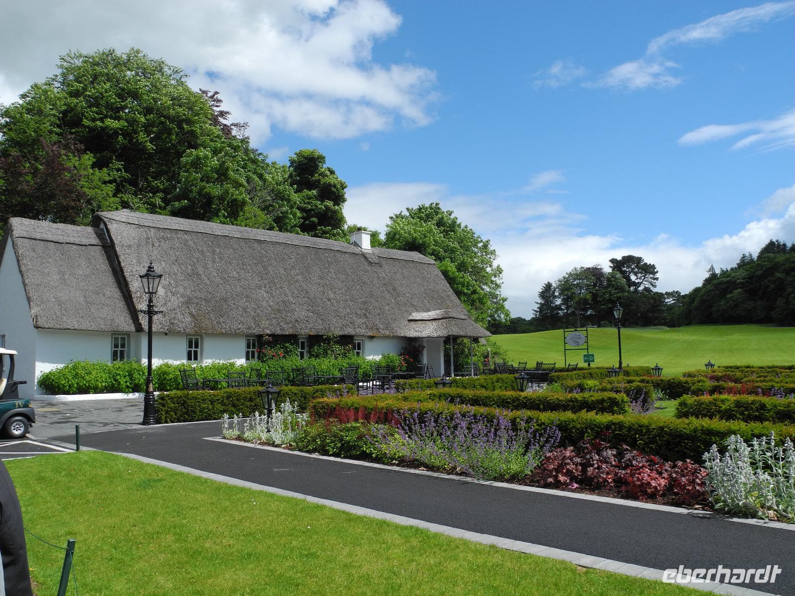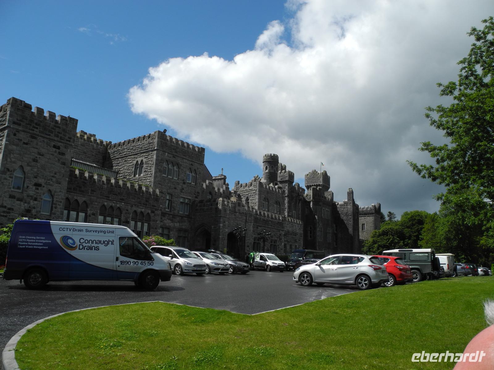 Als kleine Besonderheit darf man das „Abbey Cong" bezeichnen, durch dessen Ruine und die wunderschön angelegte Parkanlage wir spazieren, bei einem Wetter, das man gerne „Kaiserwetter" nennen darf. Von der kleinen Brücke bei „Monks Fishing House" können wir ganz aus der Nähe wieder einmal einen Angler beobachten, der sich gerade im „Flyfishing" übt. Es ist geradezu ein Postkarten-Panorama, das sich uns in Cong bietet.Nicht nur die Uhr, auch der wieder nur kurz einsetzende Regen sagt uns allen, dass es weiter geht und so finden wir uns immer wieder gemeinsam beim Bus ein, selbst wenn wir die Zeit nicht so genau festgelegt haben, um eben keinen Stress aufkommen zu lassen.Inzwischen hatte sich eine Möglichkeit entwickelt, wie wir das nahegelegene „Ashford Castle" noch ein bisschen näher sehen können und diese Möglichkeit wollten wir nun nicht auslassen.