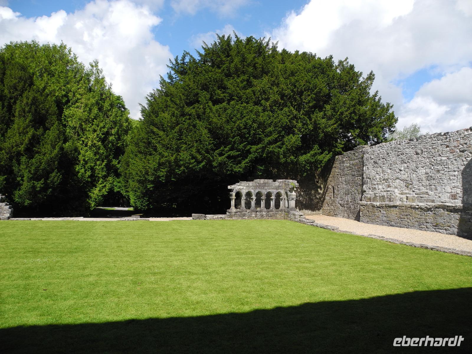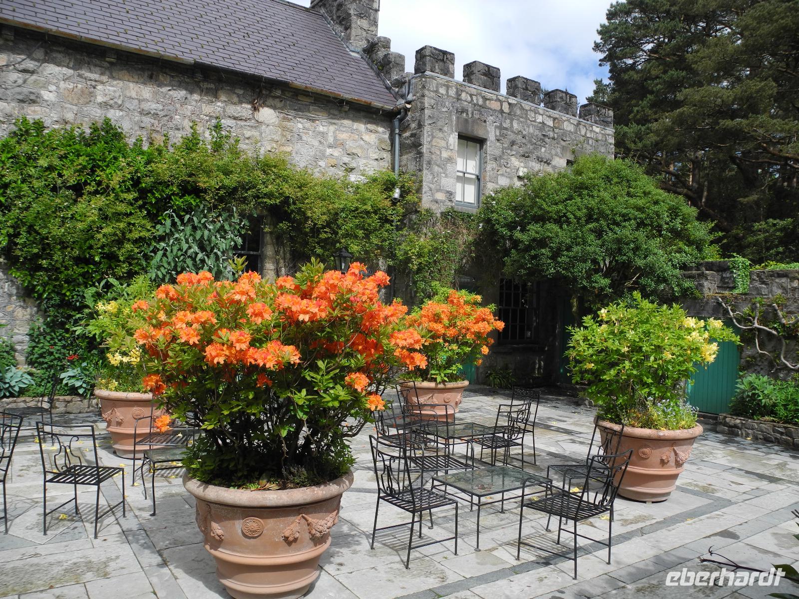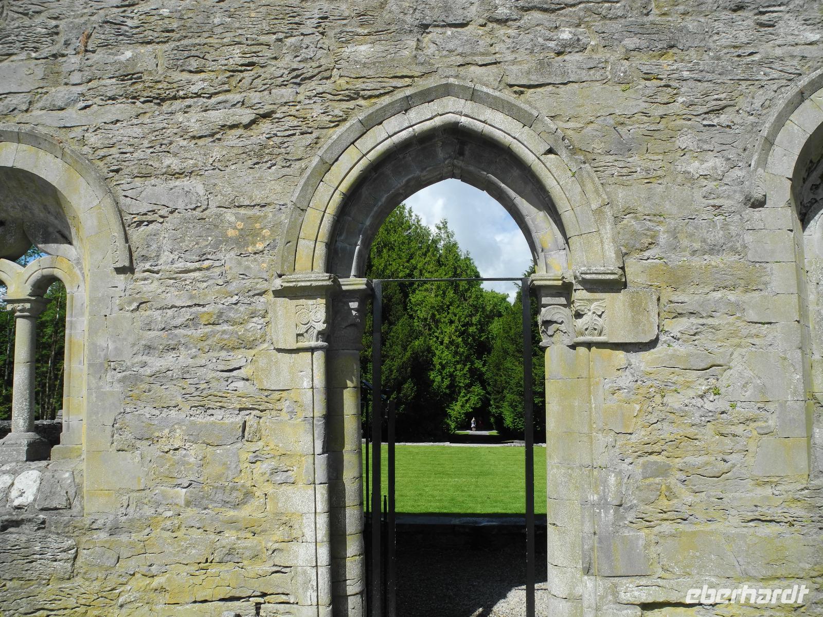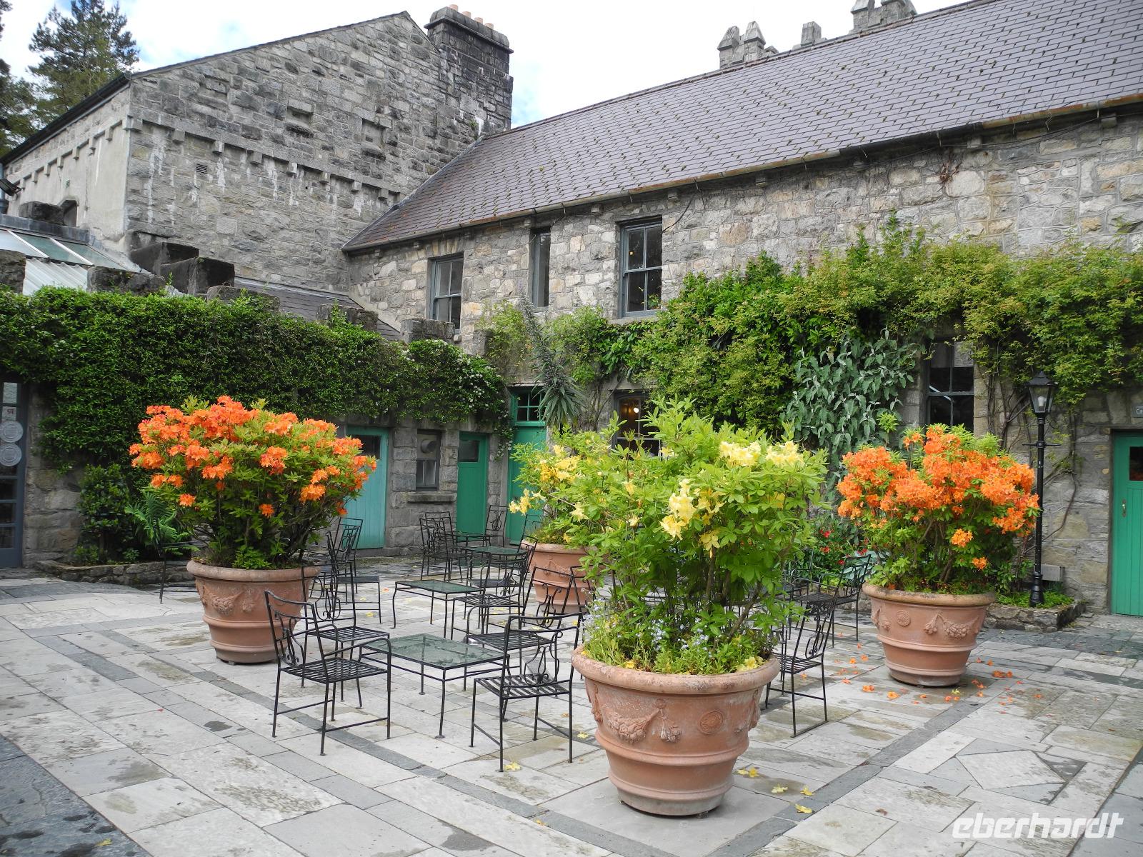 Als kleine Besonderheit darf man das „Abbey Cong" bezeichnen, durch dessen Ruine und die wunderschön angelegte Parkanlage wir spazieren, bei einem Wetter, das man gerne „Kaiserwetter" nennen darf. Von der kleinen Brücke bei „Monks Fishing House" können wir ganz aus der Nähe wieder einmal einen Angler beobachten, der sich gerade im „Flyfishing" übt. Es ist geradezu ein Postkarten-Panorama, das sich uns in Cong bietet.Nicht nur die Uhr, auch der wieder nur kurz einsetzende Regen sagt uns allen, dass es weiter geht und so finden wir uns immer wieder gemeinsam beim Bus ein, selbst wenn wir die Zeit nicht so genau festgelegt haben, um eben keinen Stress aufkommen zu lassen.Inzwischen hatte sich eine Möglichkeit entwickelt, wie wir das nahegelegene „Ashford Castle" noch ein bisschen näher sehen können und diese Möglichkeit wollten wir nun nicht auslassen.